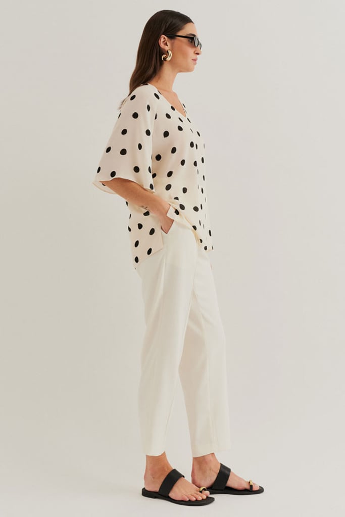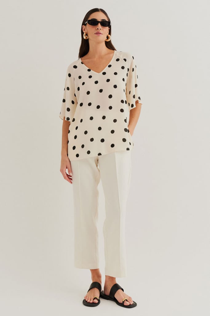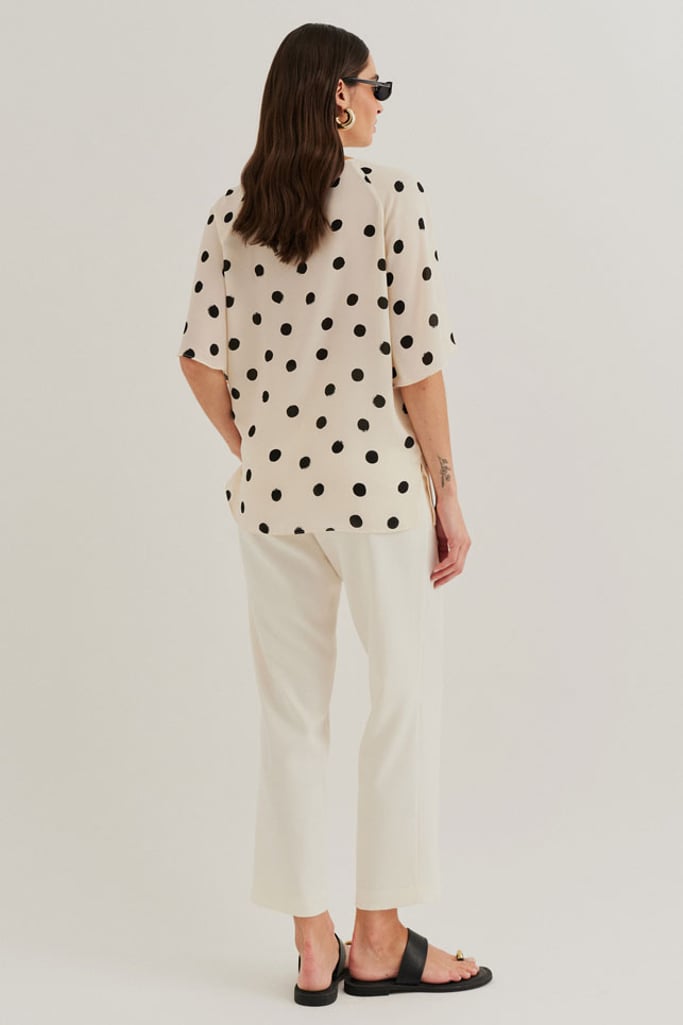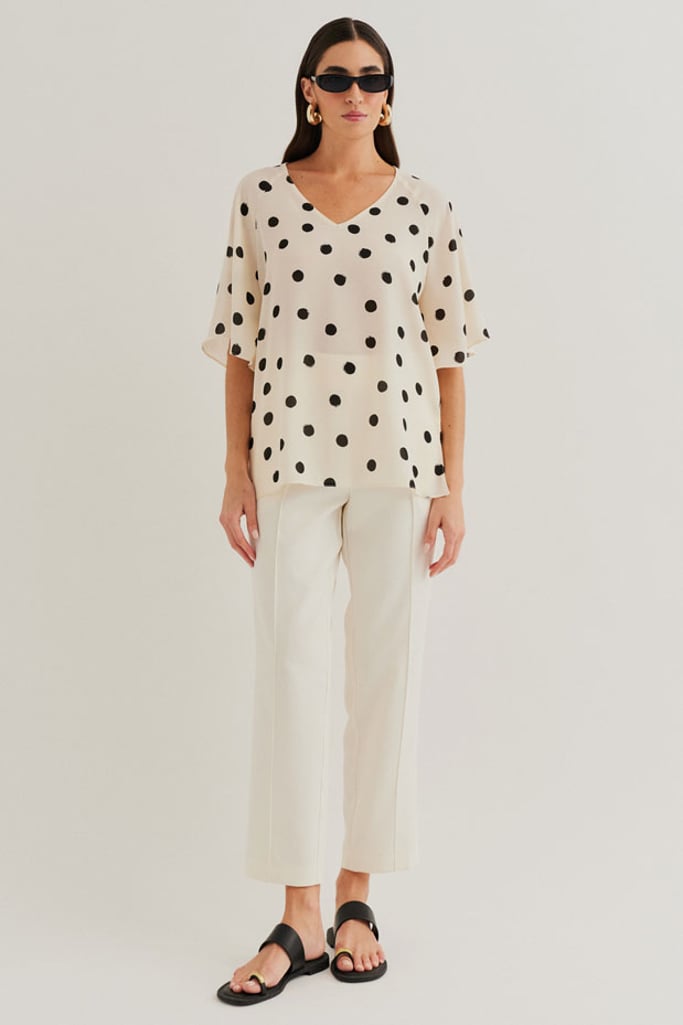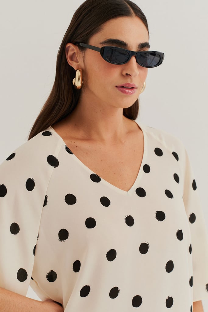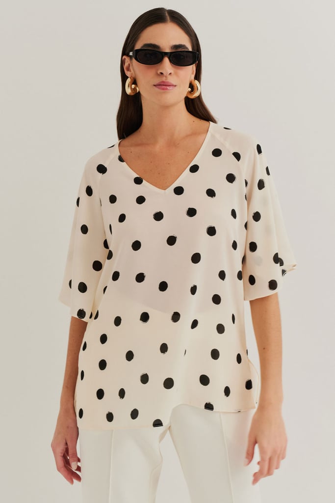 Blusa confeccionada em crepe com padronagem de poá. Possui decote V e manga raglan curta.