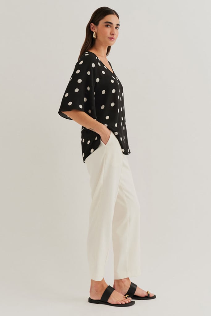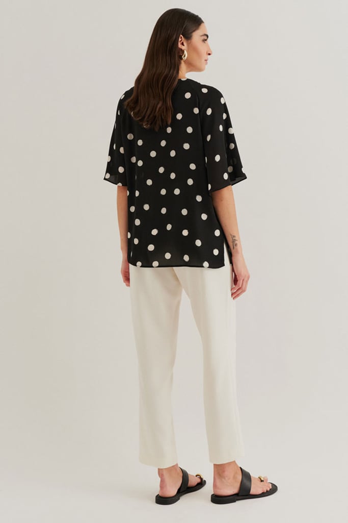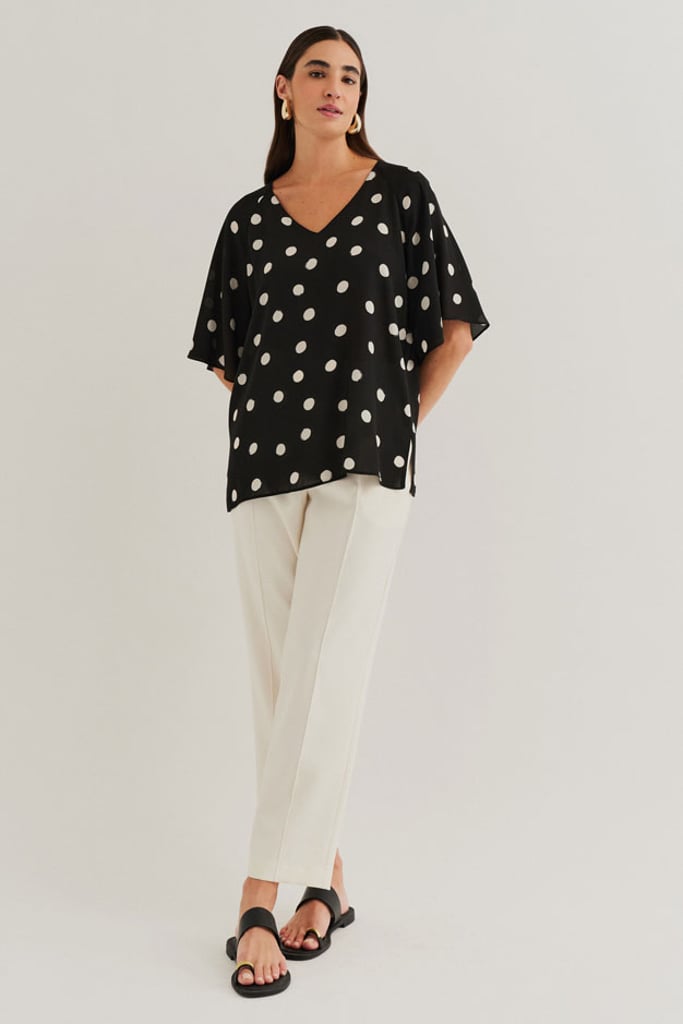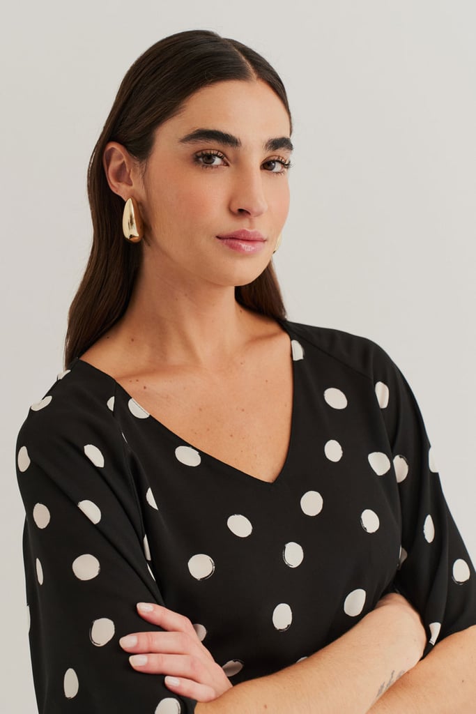 Blusa confeccionada em crepe com padronagem de poá. Possui decote V e manga raglan curta.