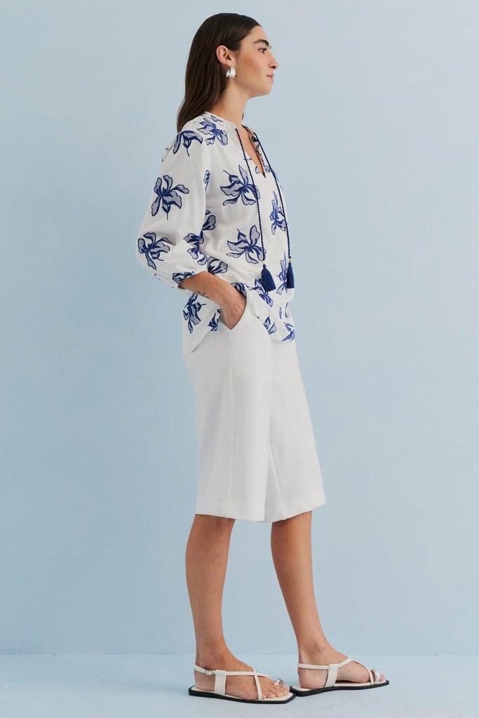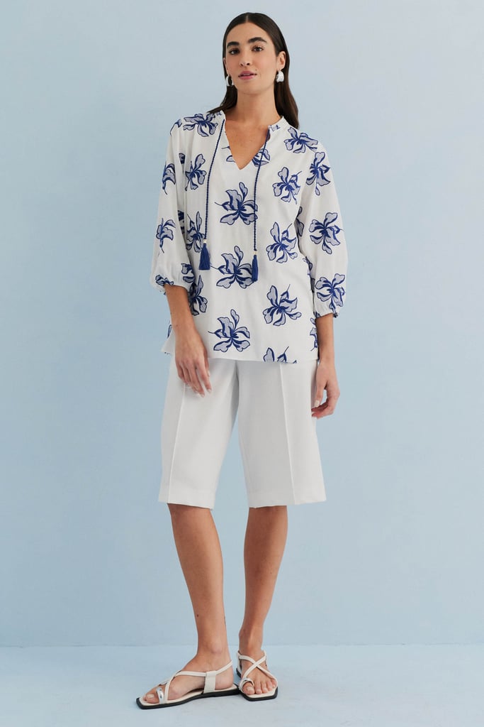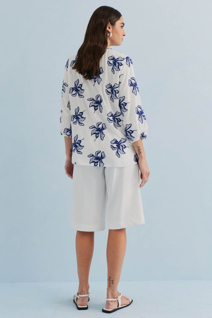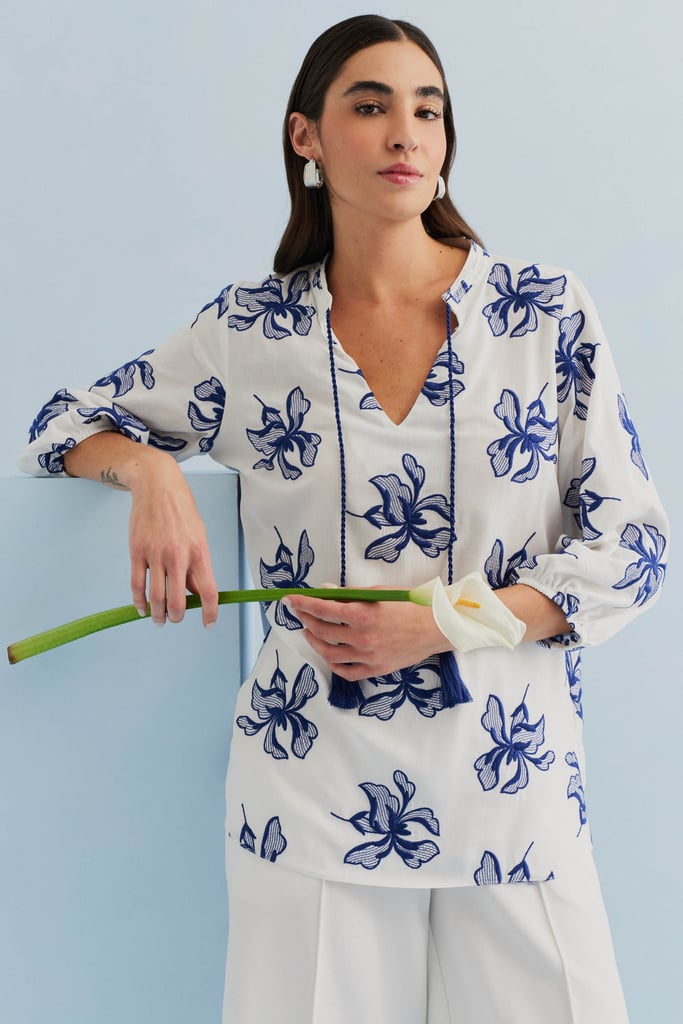 Confeccionada em tecido de viscose mista com delicado bordado floral, esta blusa une leveza e sofisticação. O modelo apresenta decote V com gola padre e cordão com ponteiras em tassel, detalhe que adiciona charme e movimento à peça. As mangas 3/4 possuem terminação em elástico, criando um volume sutil e feminino. Versátil e elegante, é perfeita para compor produções que transitam do dia a ocasiões especiais com frescor e estilo.