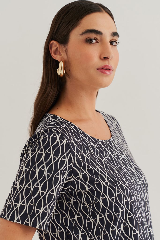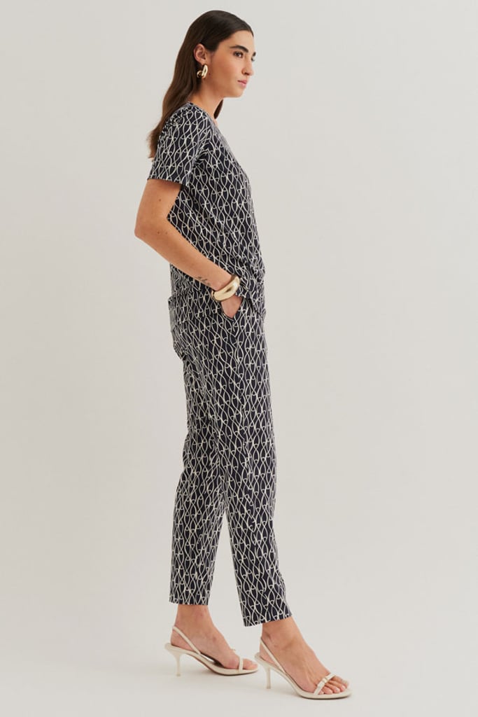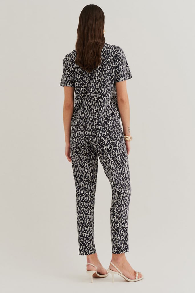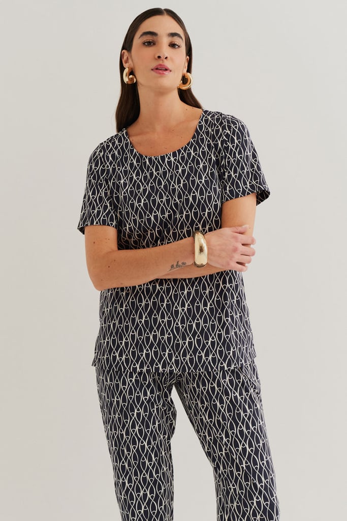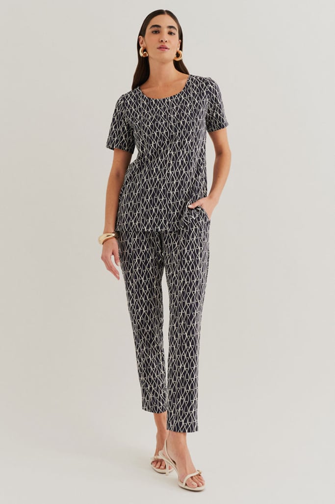 Conjunto confeccionado em Fluity com estamparia exclusiva. Blusa possui decote redondo e manga curta. A Calça traz nossa modelagem clássica reta com pregas frontais, bolsos laterais e cós com elástico nas costas para garantir conforto à peça.