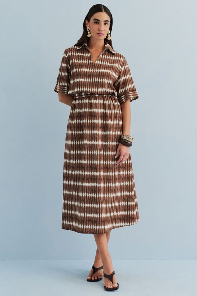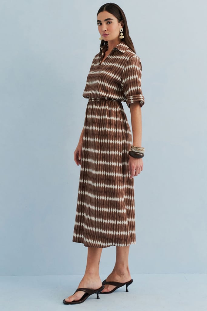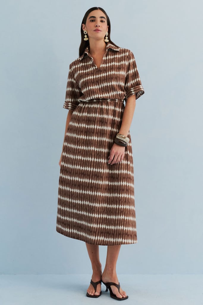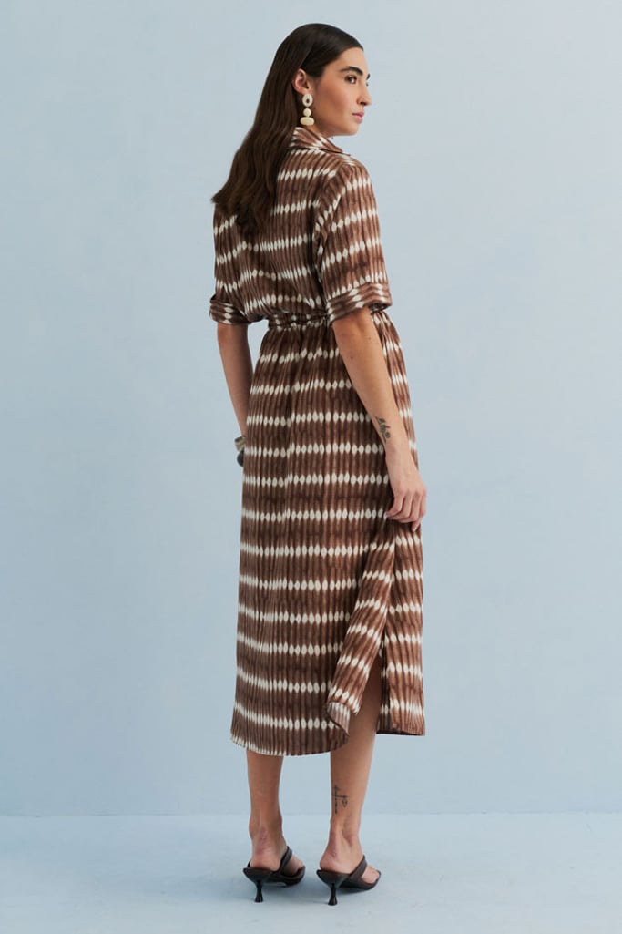 Vestido confeccionado em tecido de crepe com padronagem Tie Dye. Possui decote V, gola, bolsos frontais, manga curta com barra italiana e elástico na cintura para maior conforto. Comprimento midi.