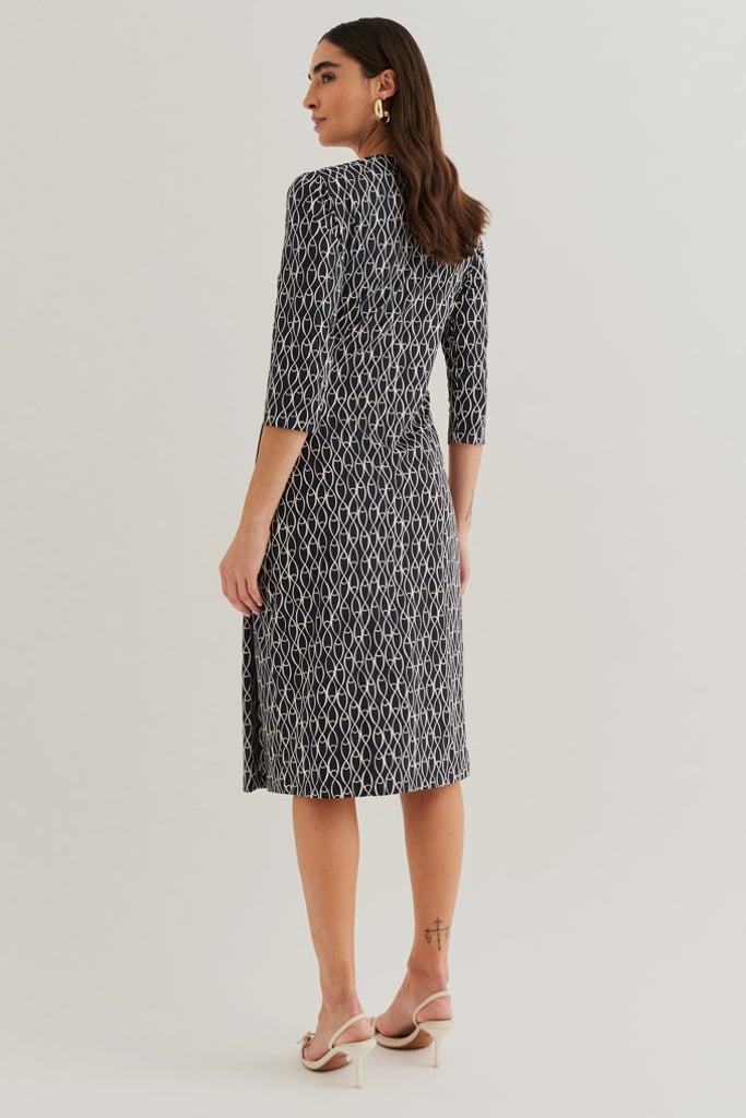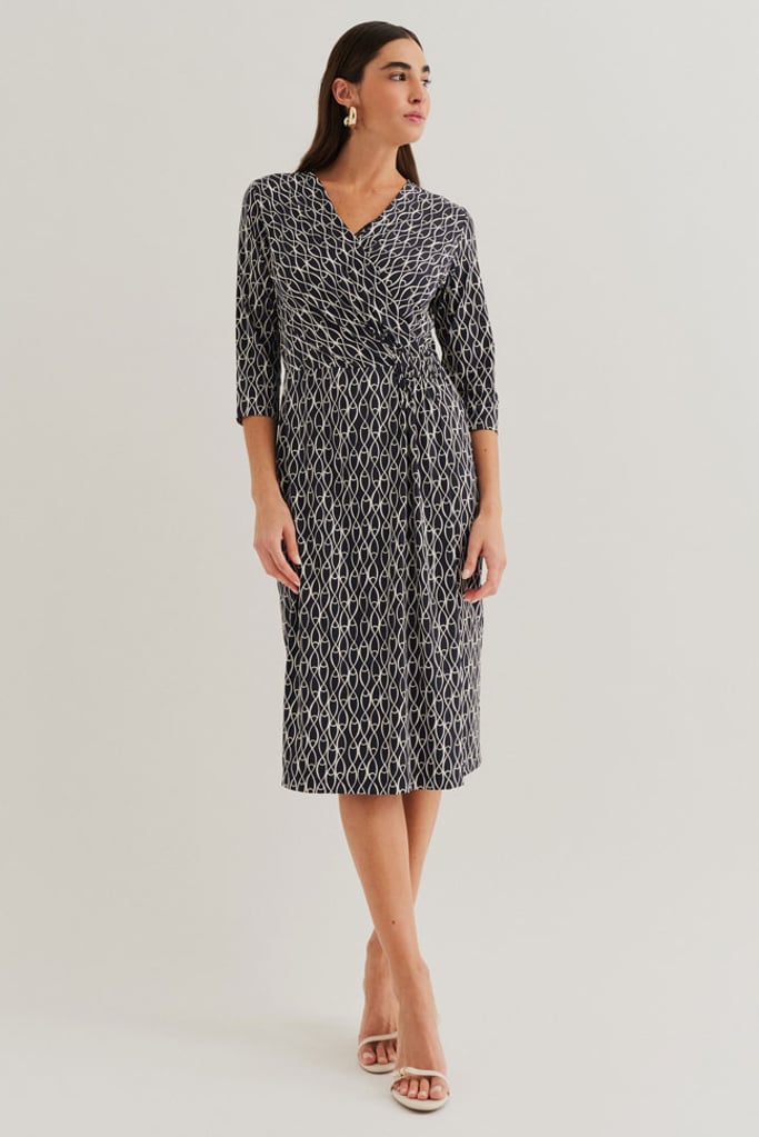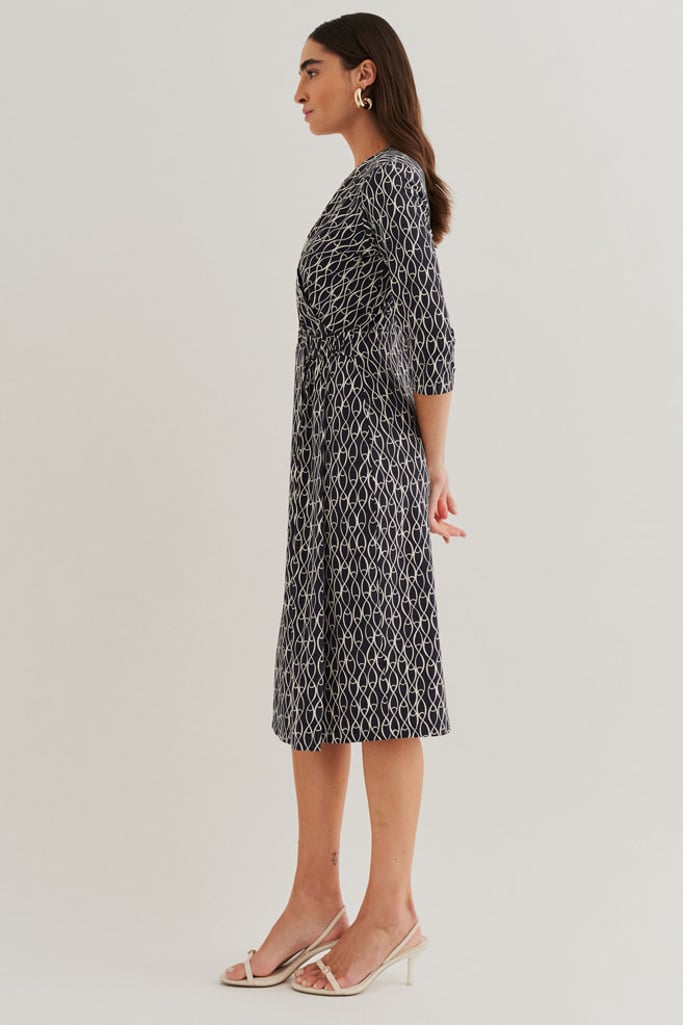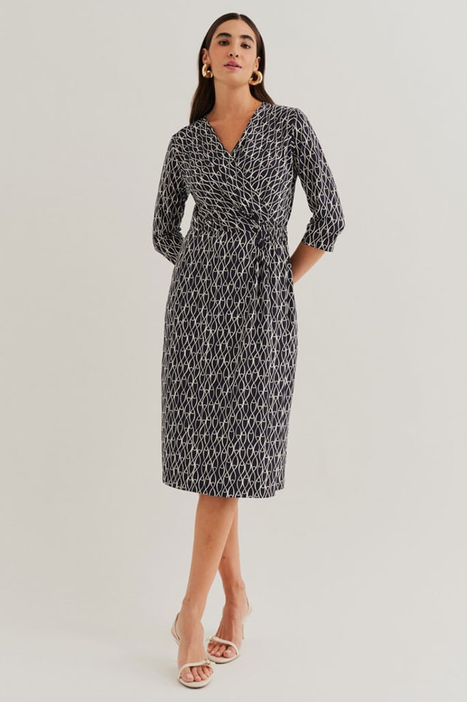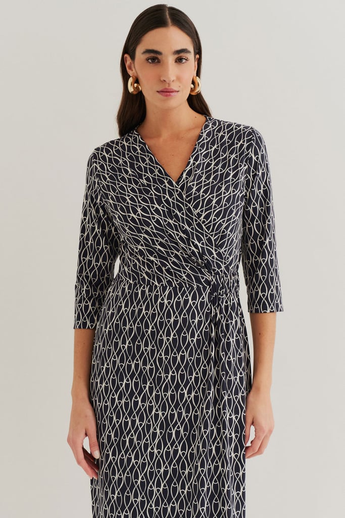Vestido transpassado confeccionado em Fluity. Possui detalhe de elástico na lateral da cintura e manga ¾,
