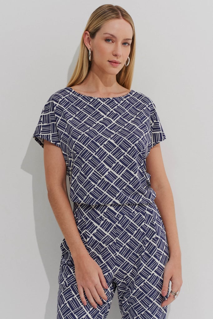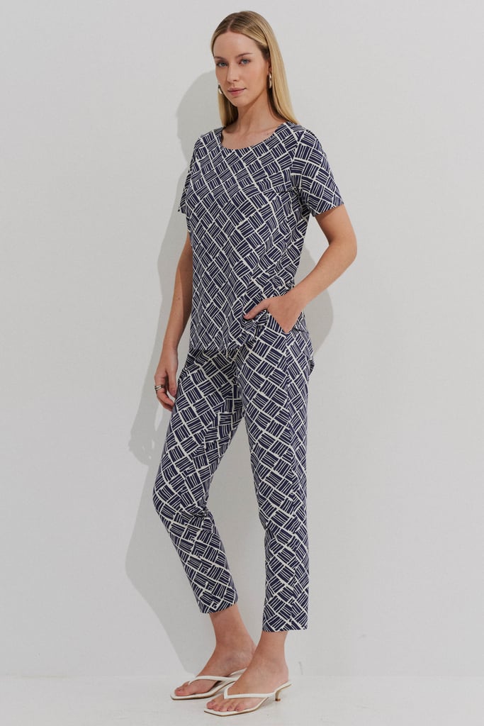 Confeccionado em malha Fluity com estampa exclusiva, tecido premium de toque macio e fresco, este conjunto alia conforto e elegância. A blusa apresenta decote redondo e manga japonesa, garantindo leveza ao visual. A calça traz modelagem reta clássica com pregas frontais, bolsos laterais e cós com elástico nas costas, oferecendo ajuste confortável e praticidade para o dia a dia.