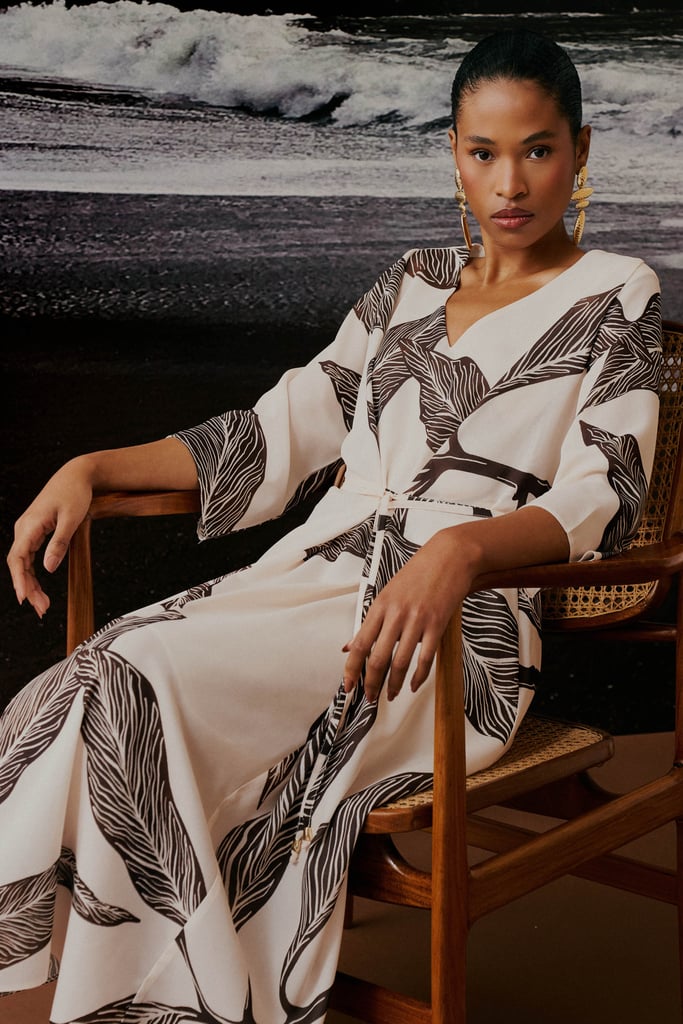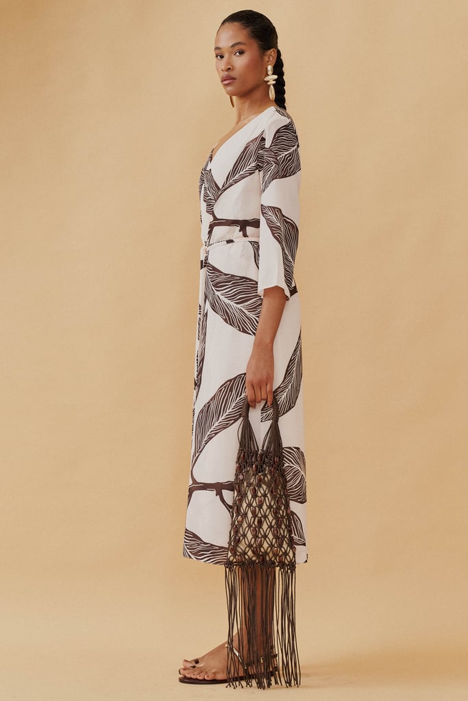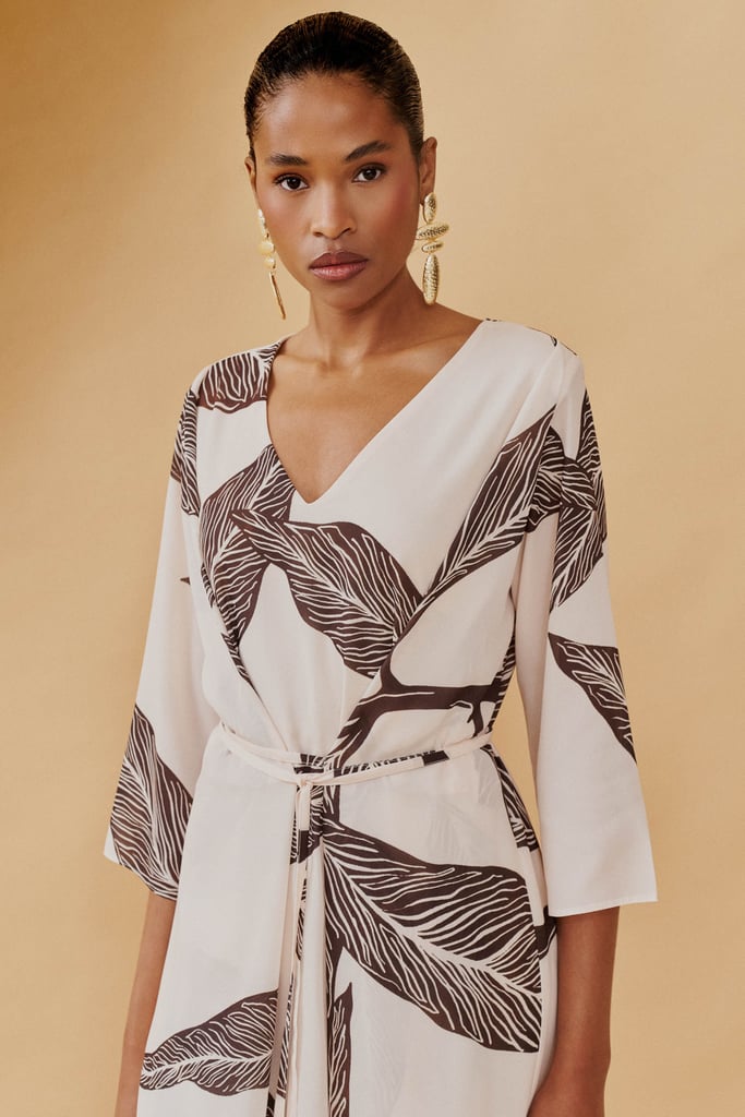 Vestido em crepe estampado com padronagem de folhagem, que combina leveza e sofisticação. O modelo apresenta decote V, mangas 3/4 e transpasse frontal com faixa para amarração, que valoriza a silhueta com caimento elegante. Com forro para maior conforto e comprimento midi atemporal, é a peça ideal para transitar do dia a noite. Use com rasteiras para uma proposta casual chic, ou aposte no salto e em acessórios marcantes para um visual refinado.