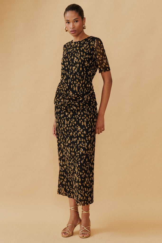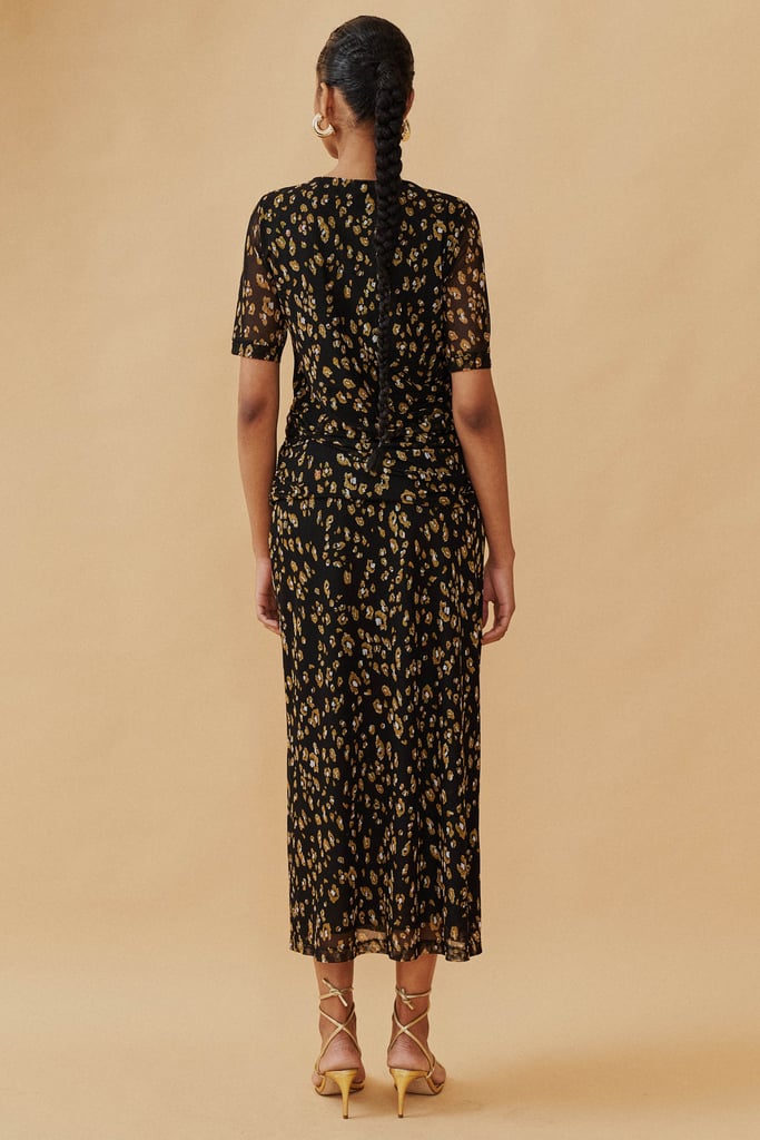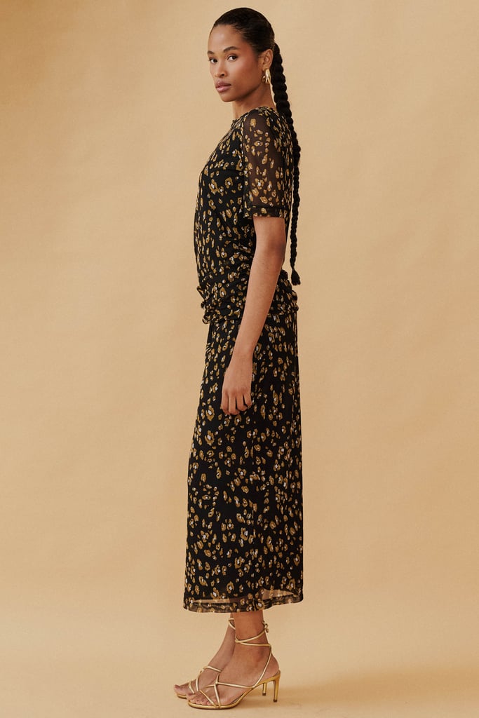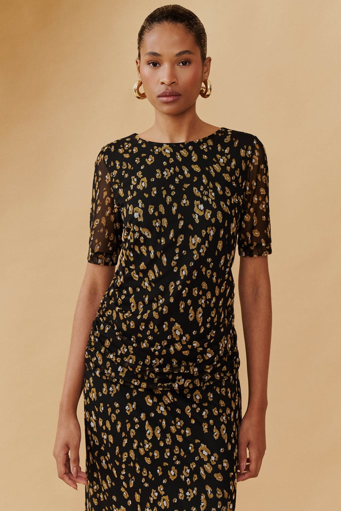 Conjunto confeccionado em tule com padronagem de animal print. A blusa possui decote redondo, mangas curtas e delicados franzidos laterais que valorizam a silhueta com caimento elegante. A saia de corte reto apresenta cós com elástico nas costas, garantindo praticidade e conforto no uso. Ambas as peças são forradas.