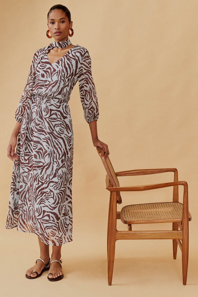 Vestido confeccionado em chiffon com padronagem animal print e delicado acabamento em foil. Possui decote V, mangas 3/4 com punho em elástico e cintura levemente franzida com acabamento elástico, que valoriza a silhueta com conforto. Acompanha faixa removível, presa por um discreto botão, que pode ser usada de diferentes formas — no pescoço, na cintura ou conforme o estilo desejado. Peça forrada.