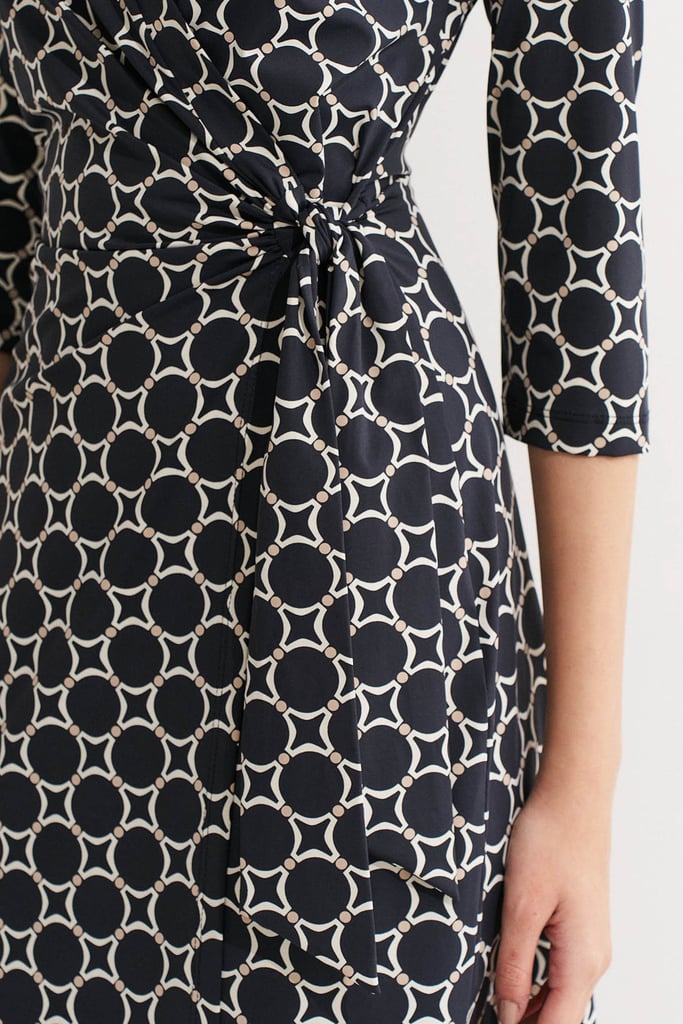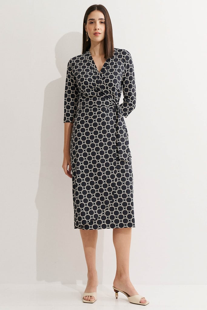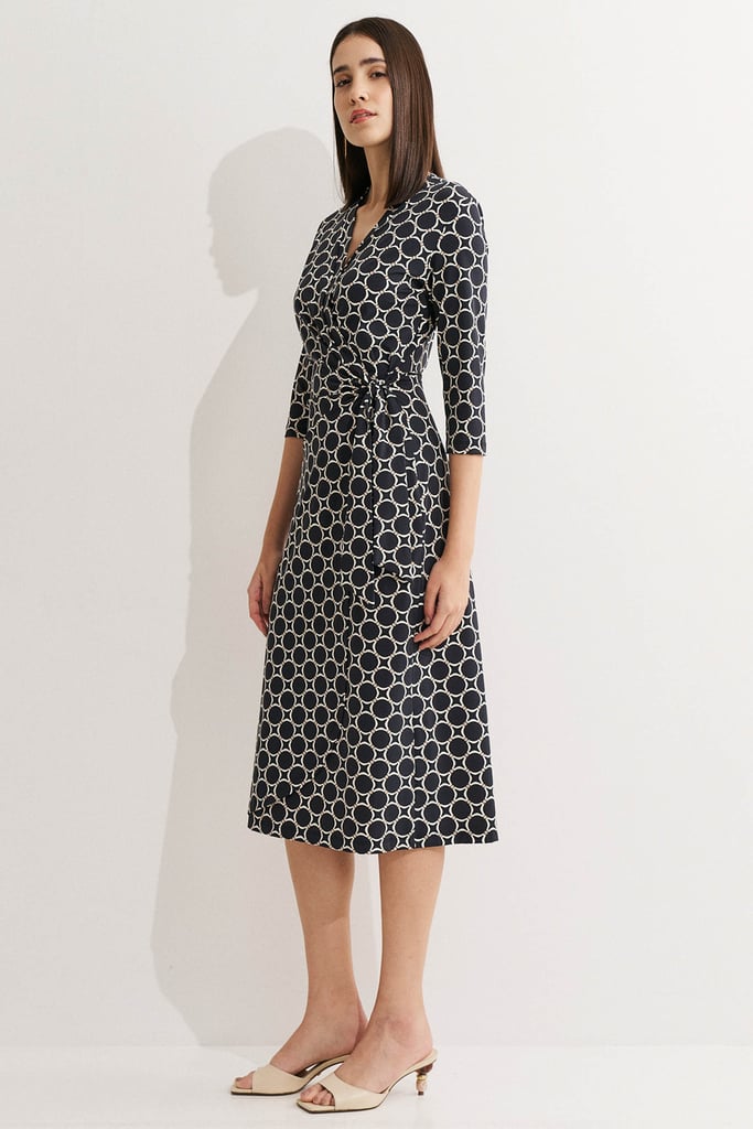 Vestido confeccionado em malha Fluity com estampa exclusiva, que une conforto e elegância em uma peça versátil e sofisticada. O modelo apresenta transpasse frontal com amarração lateral na cintura, que ajusta o corpo e valoriza a silhueta com naturalidade. Conta com mangas 3/4 e comprimento midi, oferecendo um visual refinado e atemporal. A malha Fluity da Santa Constância é um tecido premium, tecnológico e sustentável, reconhecido pelo toque geladinho, elasticidade e caimento impecável, que garante leveza e praticidade sem abrir mão da elegância.