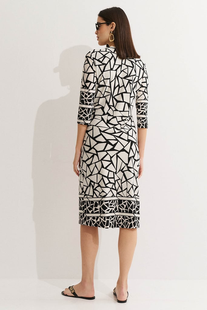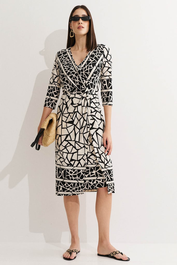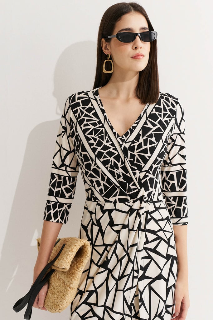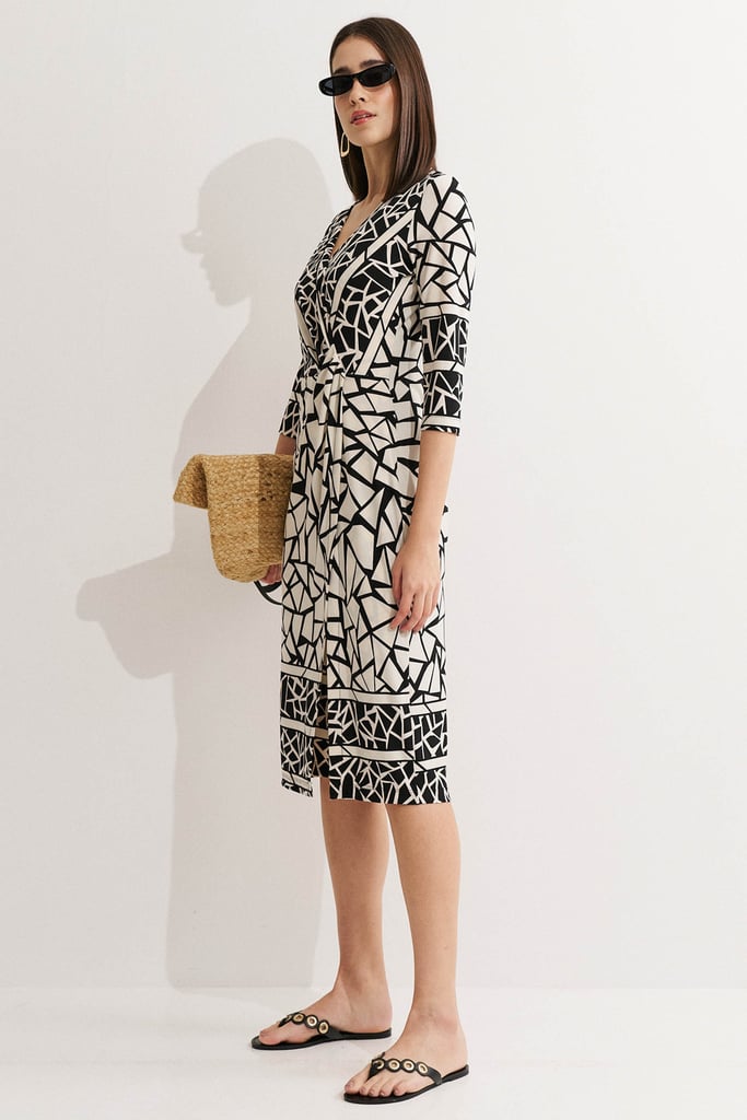 Vestido confeccionado em malha estampada de toque macio e caimento impecável. O modelo apresenta decote em V, mangas 3/4 e comprimento midi, traduzindo elegância e feminilidade em uma silhueta atemporal. O destaque está na cintura drapeada, que forma uma fenda frontal sobre uma saia interna do mesmo tecido, criando um efeito envolvente que alia movimento, conforto e discrição. Uma peça sofisticada e versátil, ideal para ocasiões que pedem leveza e refinamento.