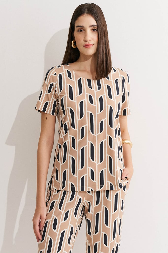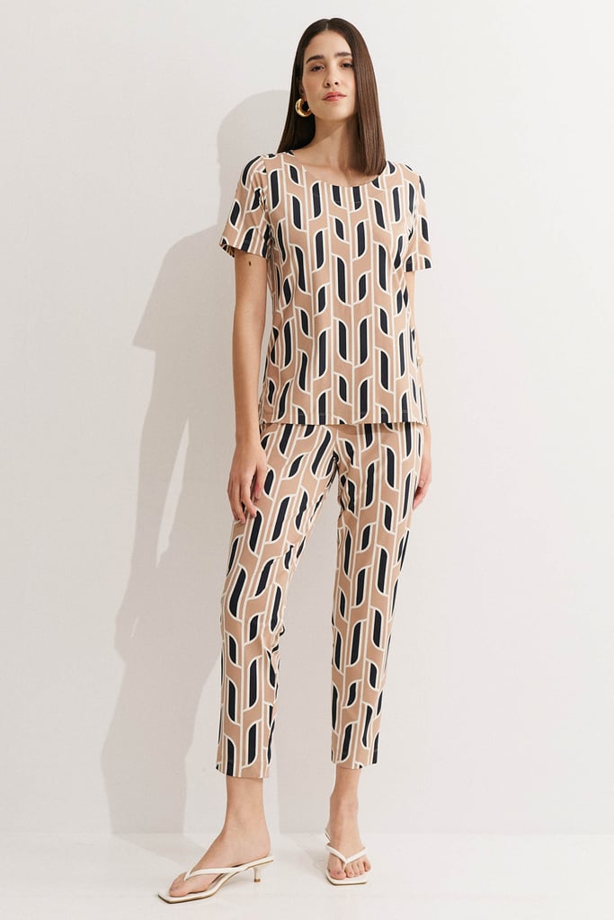 Conjunto confeccionado em malha Fluity com estampa exclusiva, que une conforto, leveza e sofisticação. A blusa apresenta modelagem reta, com decote redondo e mangas curtas, enquanto a calça possui modelagem clássica reta, bolsos funcionais e cós totalmente em elástico, garantindo ajuste perfeito e conforto no uso. A malha Fluity da Santa Constância é um tecido premium, tecnológico e sustentável, reconhecido pelo toque geladinho, caimento impecável e por não amassar, ideal para acompanhar a mulher moderna com elegância e praticidade.