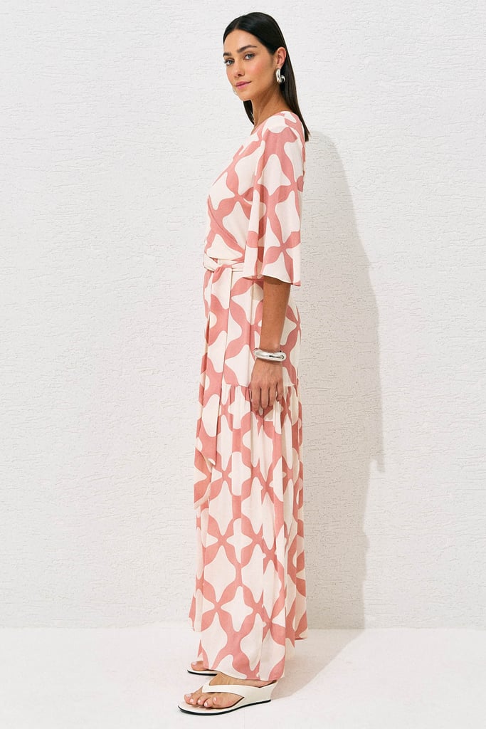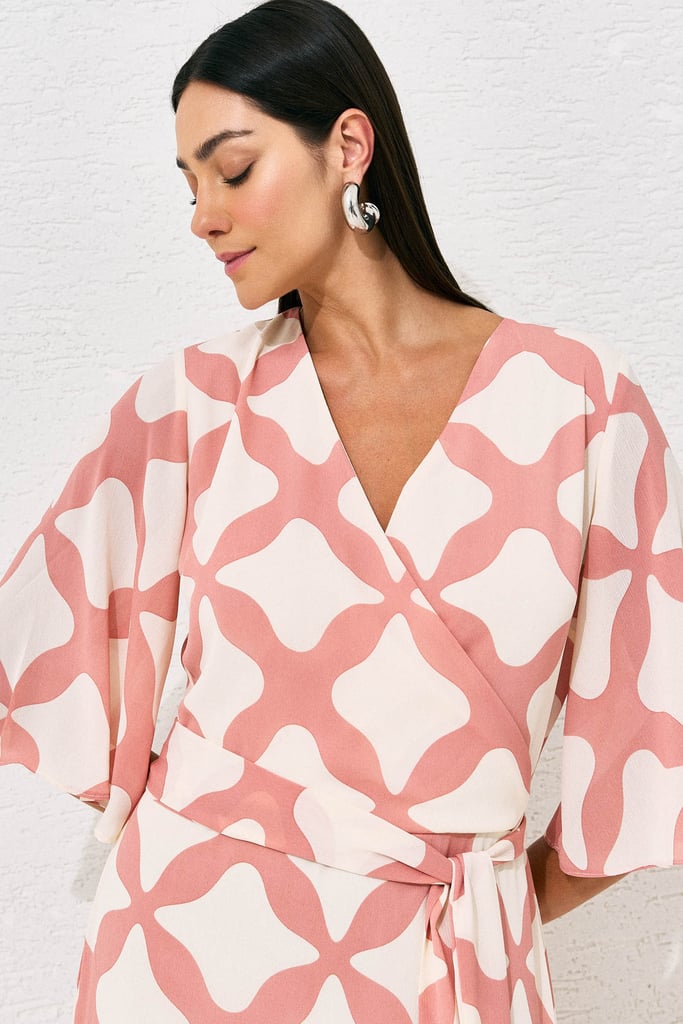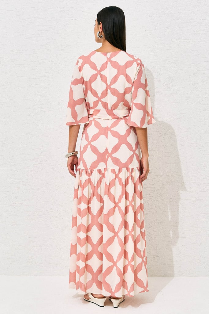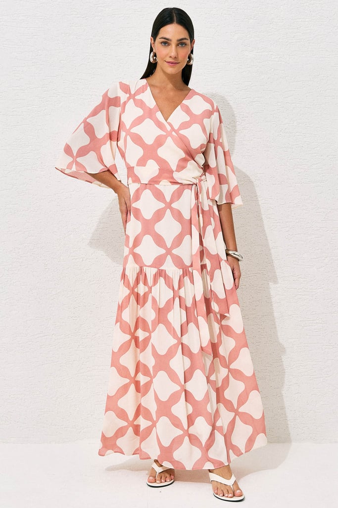 Vestido feminino confeccionado em tecido chiffon estampado de leve transparência com forro interno. Modelo com decote transpassado, mangas em modelagem sino e saia em comprimento midi com babado aplicado. Fechamento posterior por zíper invisível.