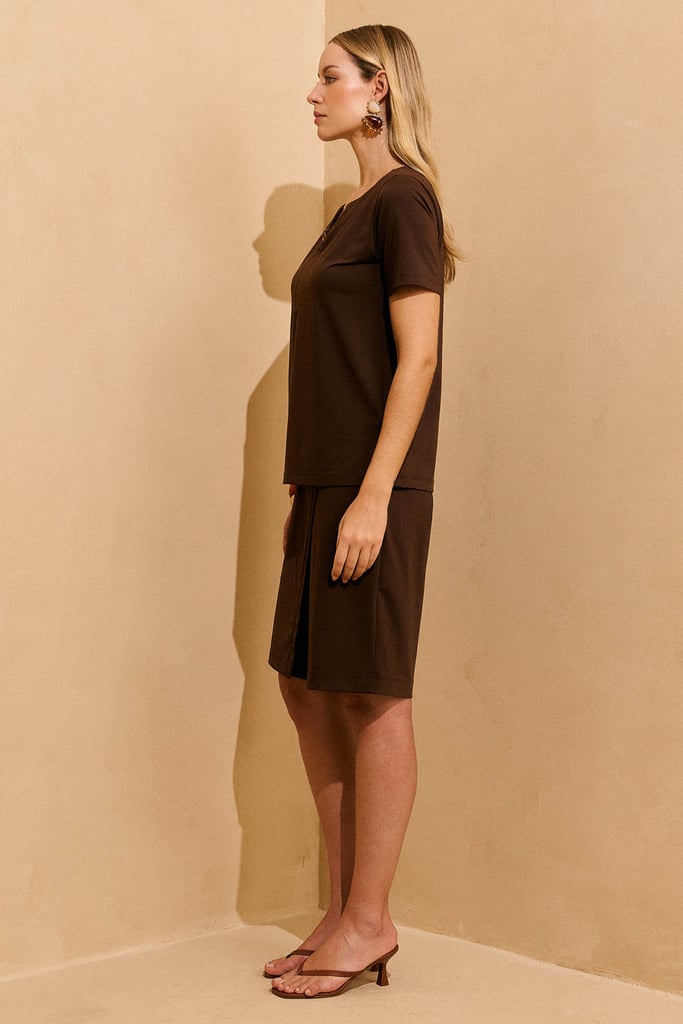 A blusa apresenta manga curta e decote redondo com abertura frontal adornada por aviamento de resina, que acrescenta charme ao visual. A bermuda possui transpasse frontal, bolsos laterais funcionais e cós com elástico nas costas, proporcionando conforto e ajuste perfeito ao corpo.