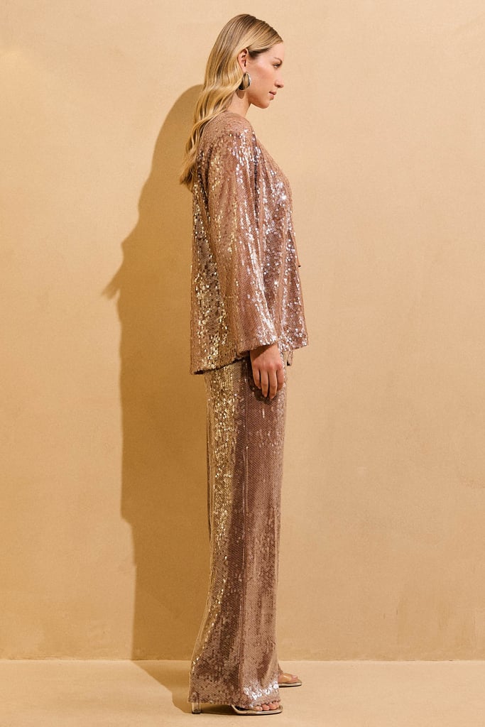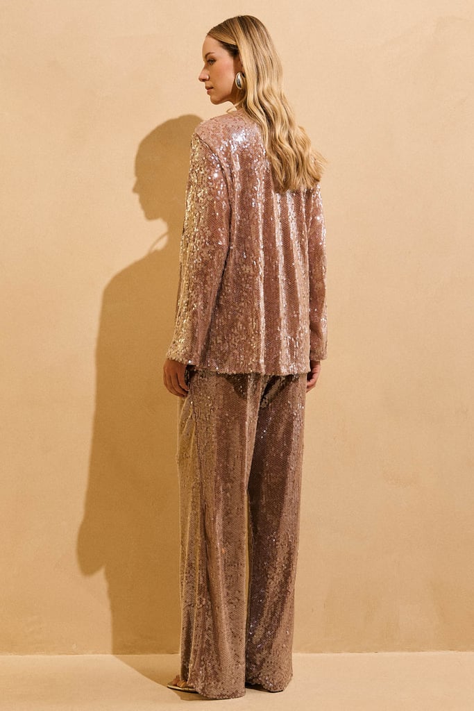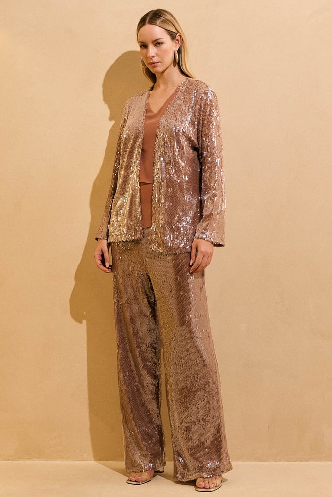 Kimono confeccionado em tecido de paetês, ideal para adicionar brilho sofisticado ao look. Possui modelagem reta e solta, com mangas longas que oferecem leveza e conforto ao vestir. Peça versátil, perfeita para compor produções festivas ou elevar combinações básicas com elegância.