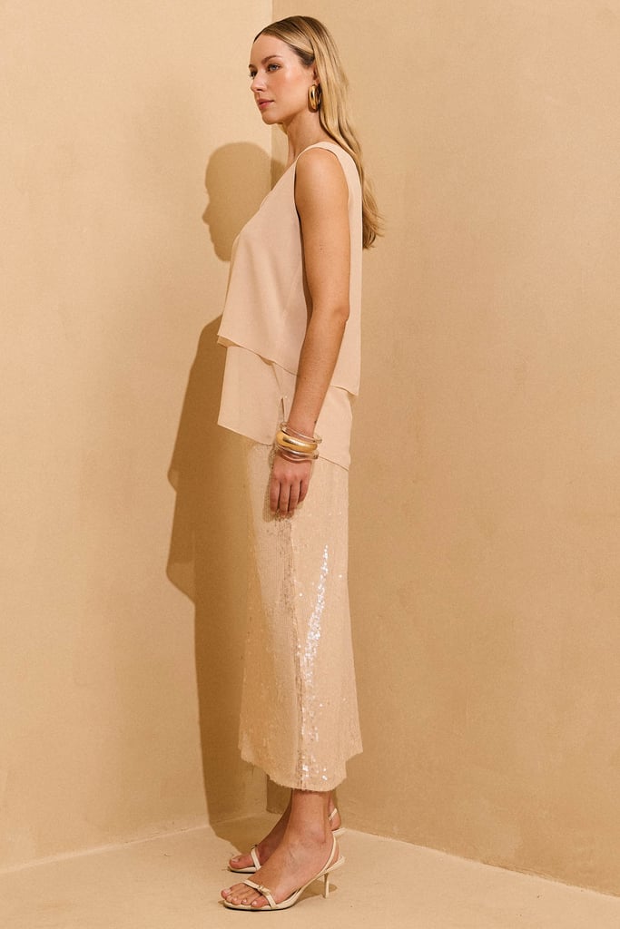 Saia midi confeccionada em tecido de paetês, que traz brilho sutil e sofisticado ao visual. De modelagem reta e comprimento midi, conta com cós em chiffon e elástico embutido em toda a cintura, garantindo ajuste confortável ao corpo. Peça forrada, para conforto e acabamento impecável.