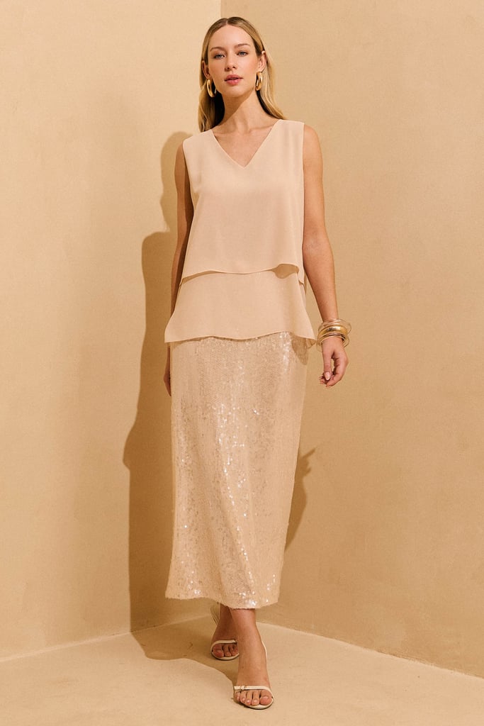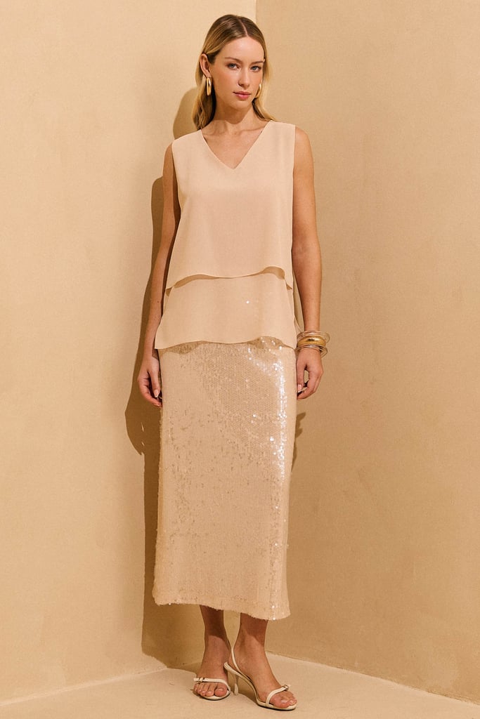 Regata confeccionada em tecido de chiffon. Possui modelagem solta ao corpo, garantindo conforto e elegância. O corpo duplo oferece um acabamento delicado, com sobreposição em comprimentos diferentes que trazem charme e movimento à peça. Destaque para a abertura nas costas, com fechamento por botão no decote.