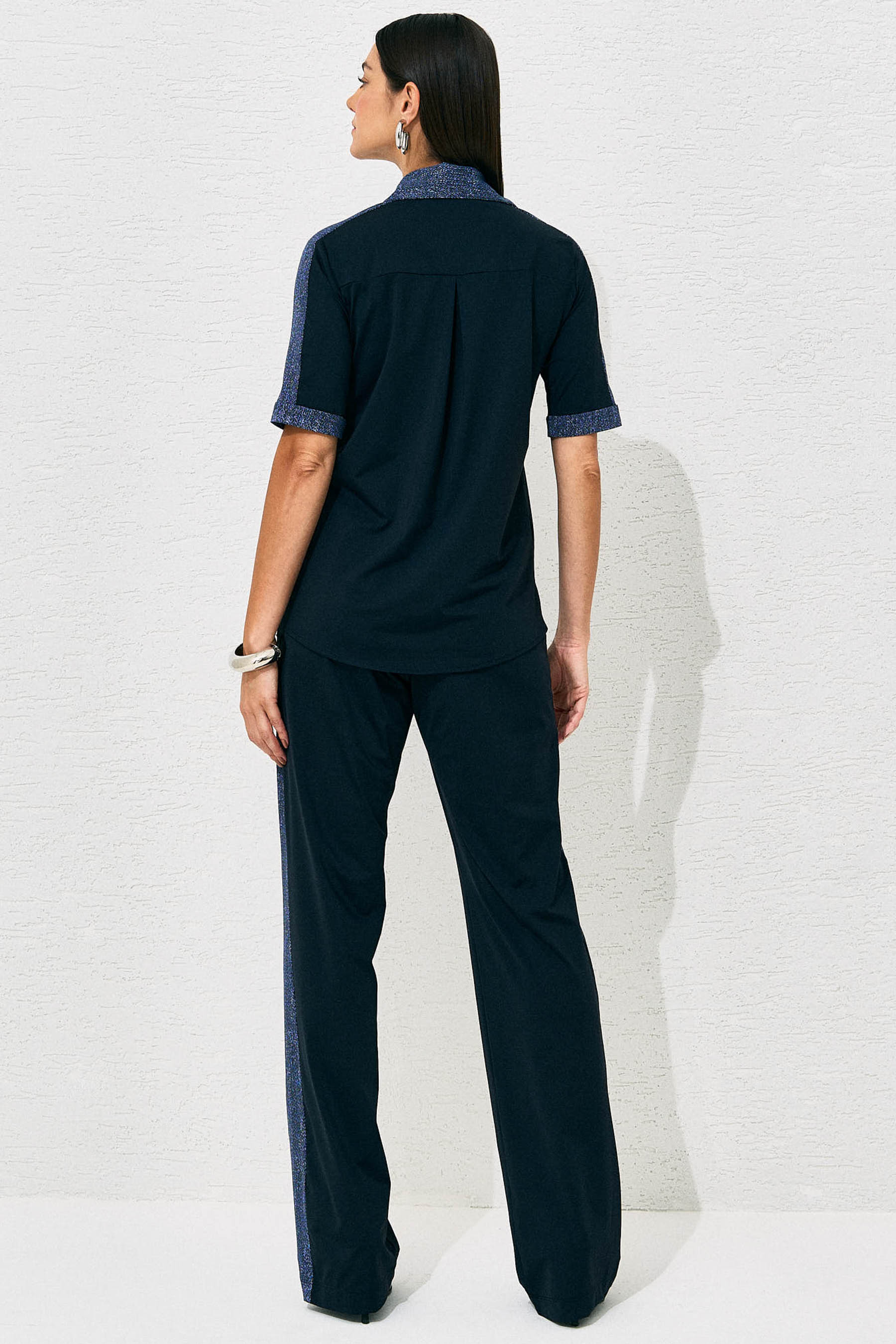 Conjunto confeccionado em malha Fluity com estampa que remete ao jeans. A blusa possui decote redondo, mangas curtas e sobreposição frontal, com delicados botões aplicados no ombro que adicionam um toque sofisticado à peça. A calça apresenta modelagem reta, bolsos laterais funcionais e detalhe de botão no cós frontal, garantindo praticidade e acabamento refinado. O caimento é leve, confortável e elegante.