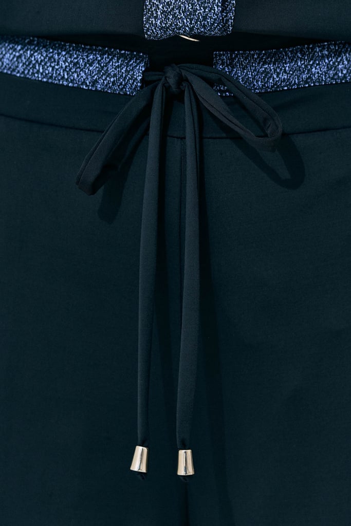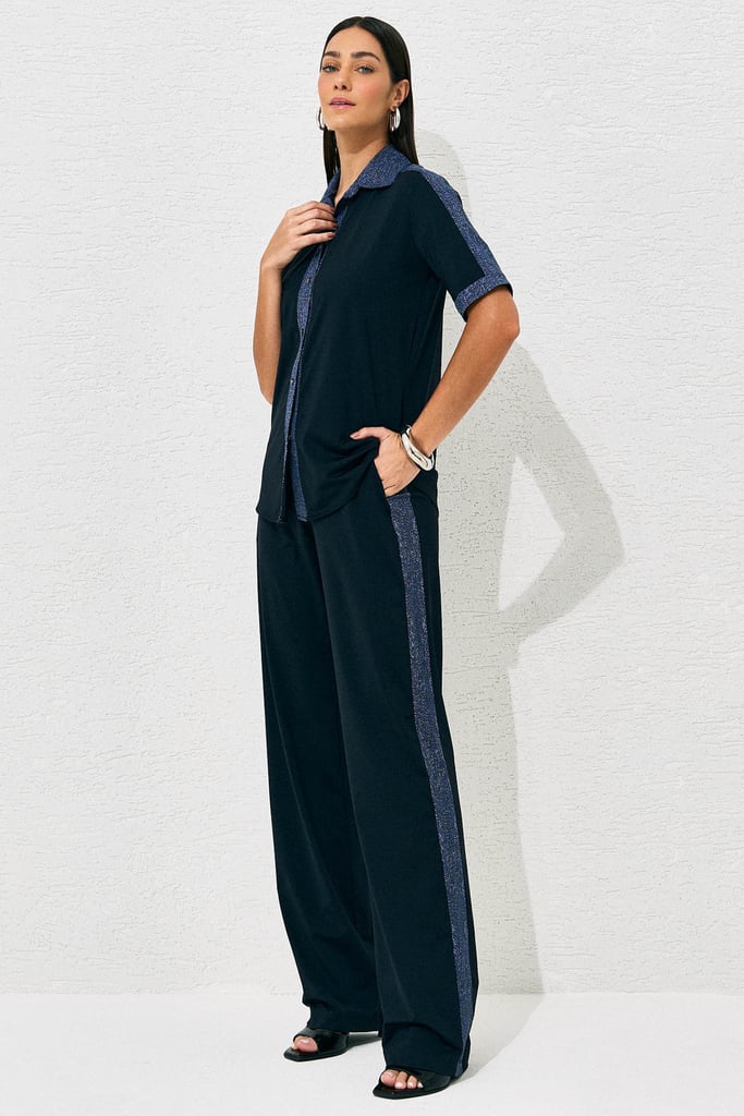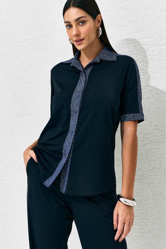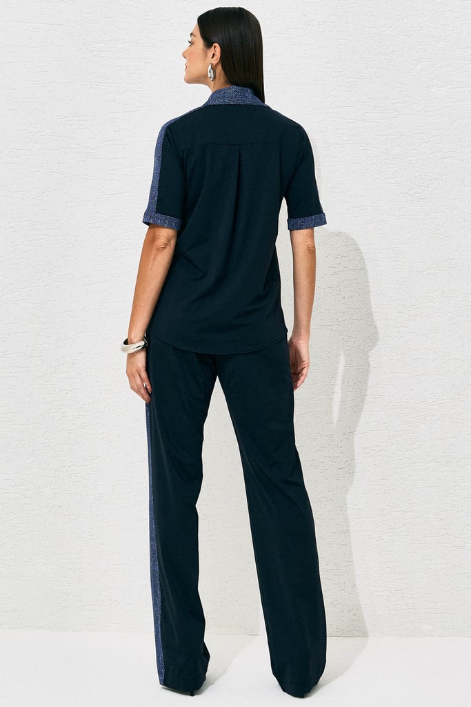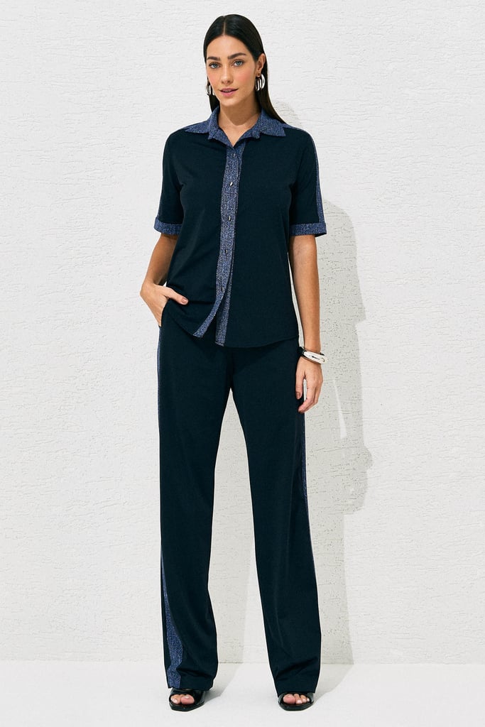 Conjunto confeccionado em malha Fluity, com detalhes contrastantes que remetem ao jeans. A camisa apresenta gola clássica, vista frontal com abotoamento, manga curta e pregas nas costas, proporcionando caimento leve e elegante. Os recortes em tecido com aparência de jeans na gola, punhos e vista frontal acrescentam sofisticação e modernidade à composição. A calça possui modelagem reta, bolsos laterais funcionais e elástico nas costas para maior conforto. O cós e o recorte lateral em contraste complementam o visual com equilíbrio e personalidade.