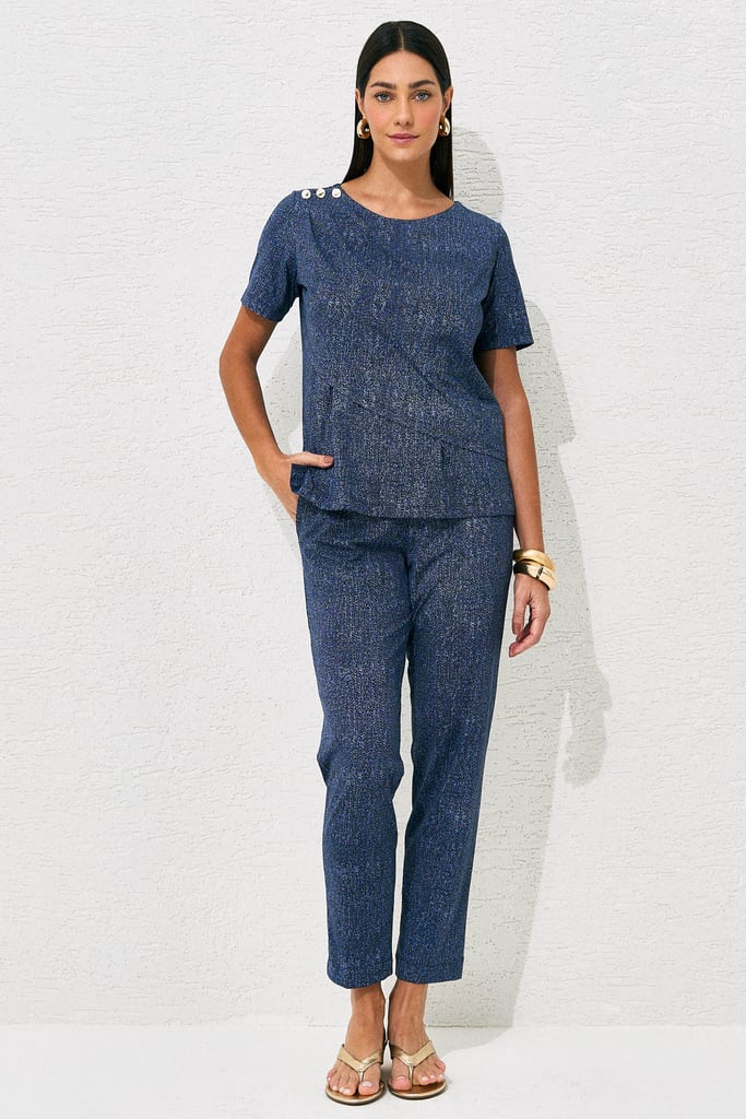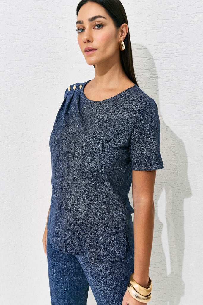 Conjunto confeccionado em malha Fluity com estampa que remete ao jeans. A blusa possui decote redondo, mangas curtas e sobreposição frontal, com delicados botões aplicados no ombro que adicionam um toque sofisticado à peça. A calça apresenta modelagem reta, bolsos laterais funcionais e detalhe de botão no cós frontal, garantindo praticidade e acabamento refinado. O caimento é leve, confortável e elegante.