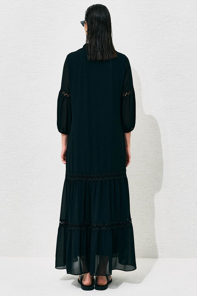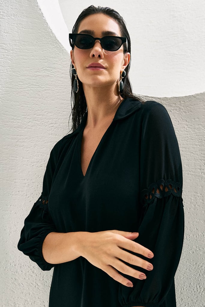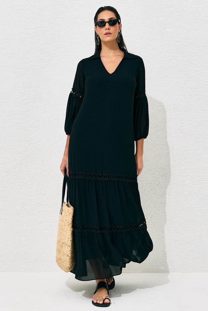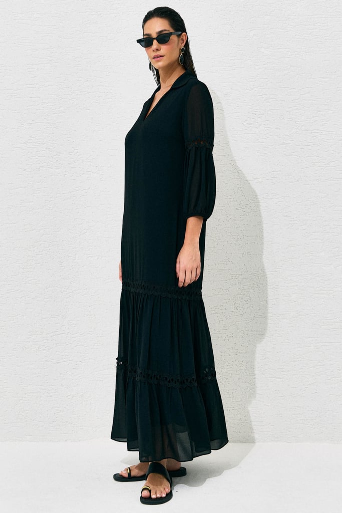 Vestido confeccionado em tecido de chiffon liso. Possui decote em V com gola, mangas 3/4 com acabamento em elástico e saia com marias que adicionam movimento à peça. Detalhes de entremeios aplicados nas mangas e na saia. Acompanha faixa do mesmo tecido para amarração na cintura, valorizando a silhueta.Comprimento midi. Peça forrada.