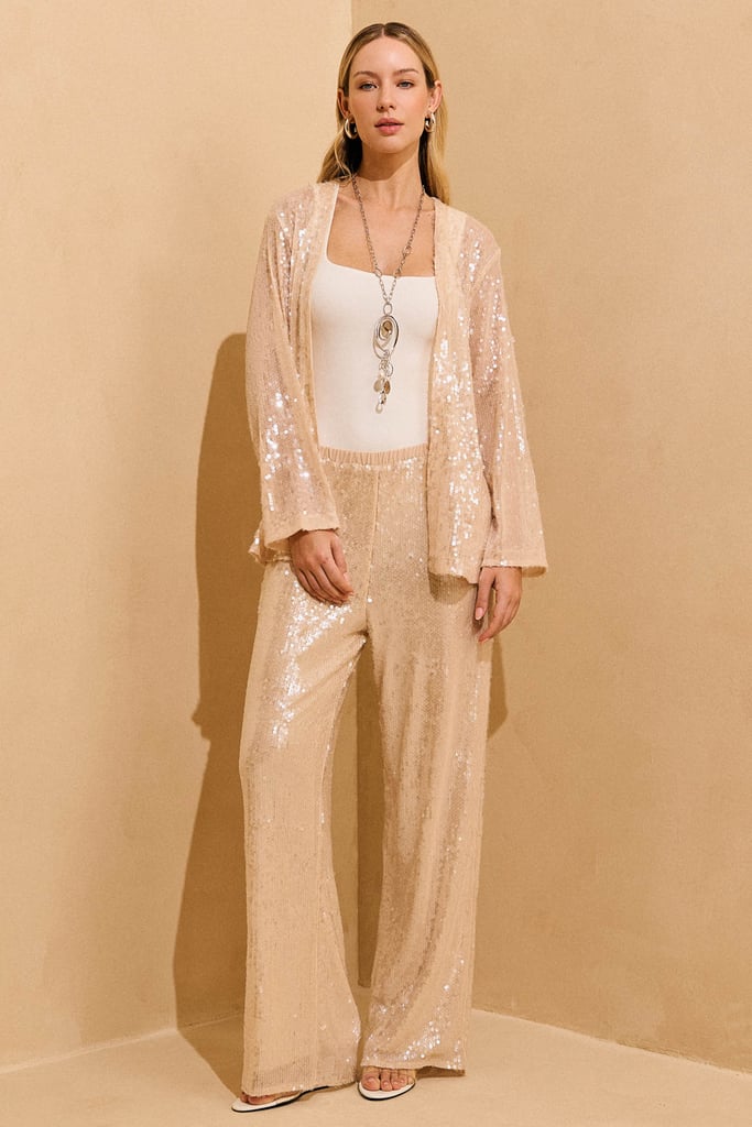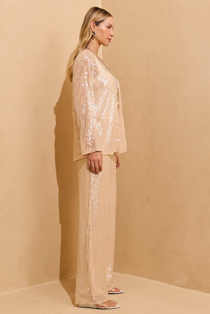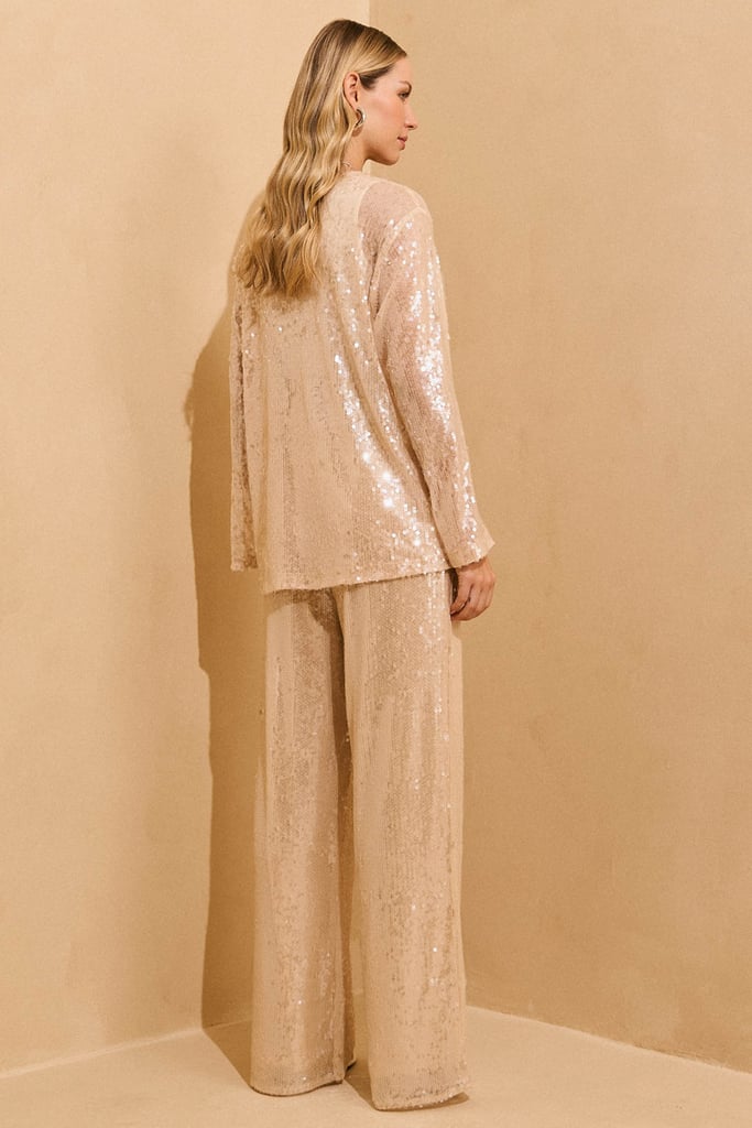 Calça confeccionada em tecido de paetês, que traz brilho sutil e toque sofisticado à produção. De modelagem reta, conta com cós em chiffon e elástico embutido em toda a cintura, proporcionando conforto e ótimo ajuste ao corpo. Peça forrada, para conforto e acabamento impecável.