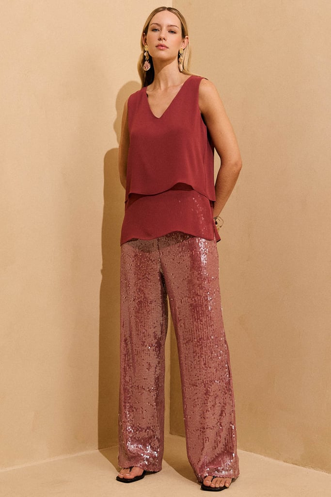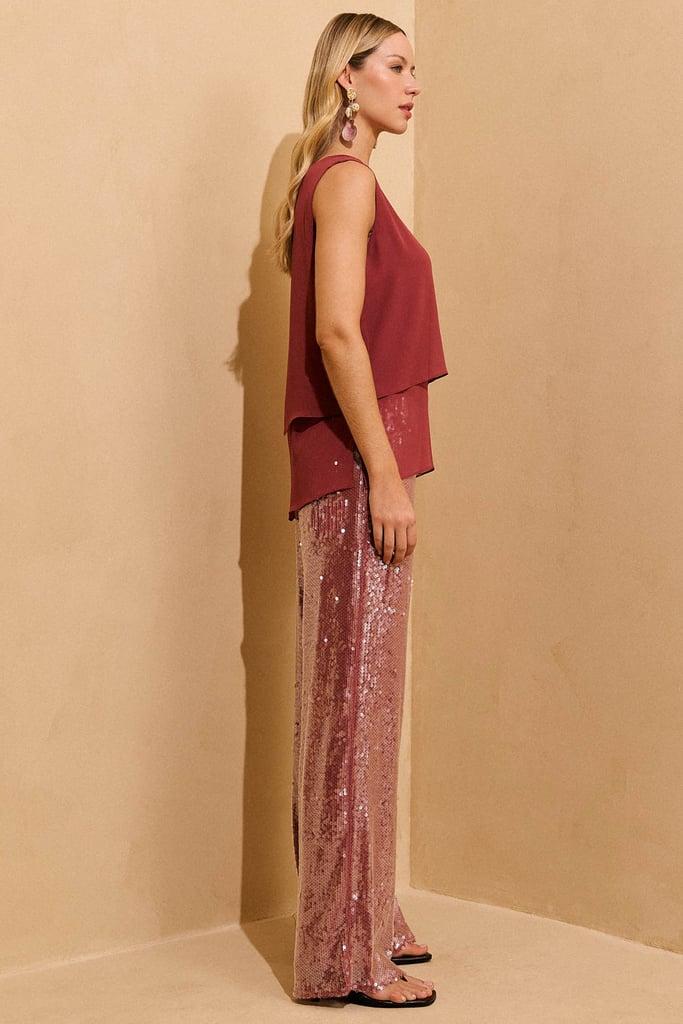 Calça confeccionada em tecido de paetês, que traz brilho sutil e toque sofisticado à produção. De modelagem reta, conta com cós em chiffon e elástico embutido em toda a cintura, proporcionando conforto e ótimo ajuste ao corpo. Peça forrada, para conforto e acabamento impecável.