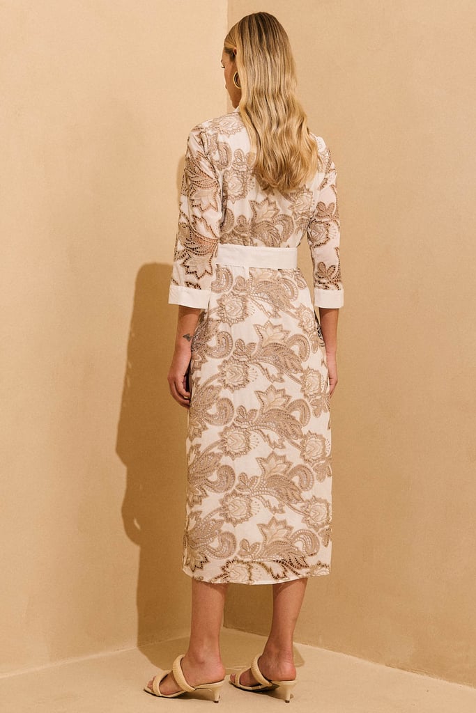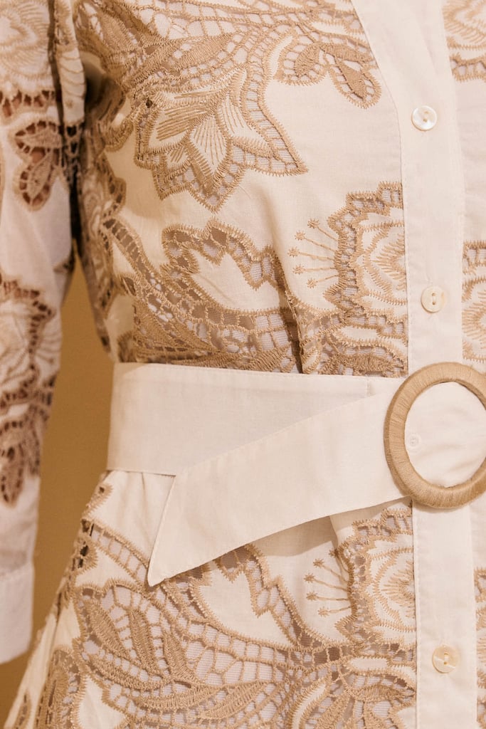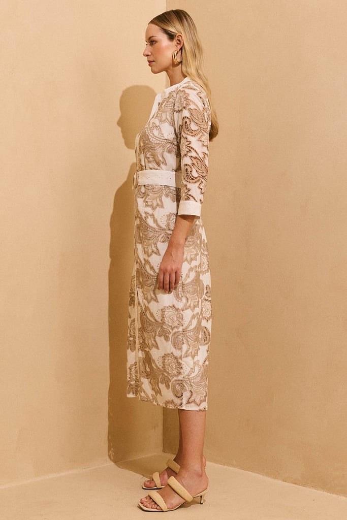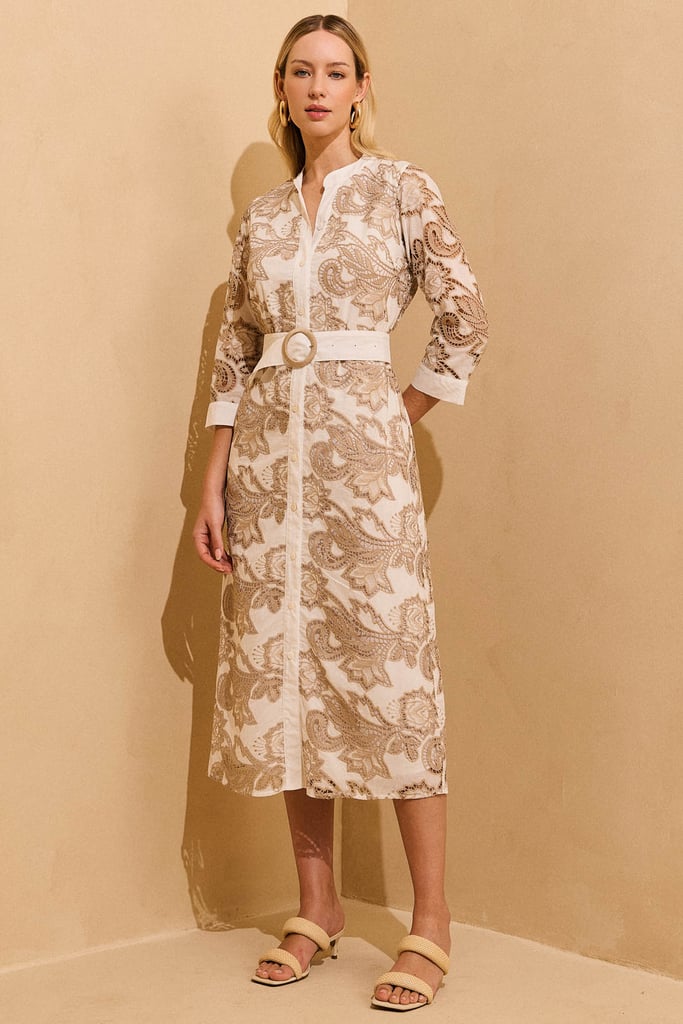 Chemise confeccionada em laise. O modelo conta com gola padre, vista frontal com abotoamento, mangas ¾ e acompanha cinto, permitindo ajustar a silhueta. A peça é forrada, garantindo conforto e segurança ao vestir.