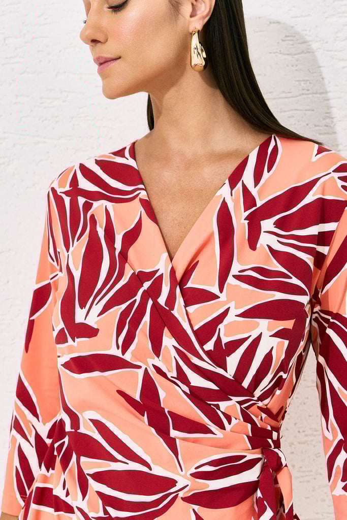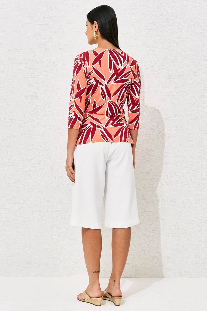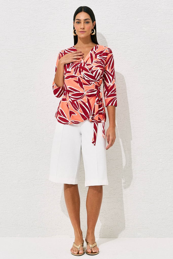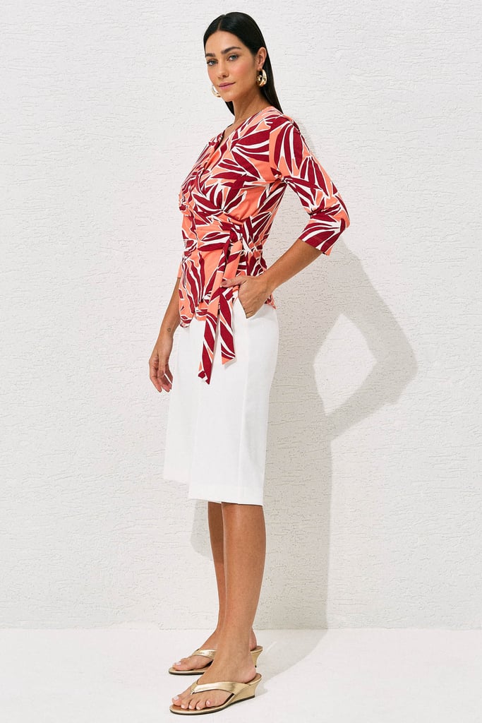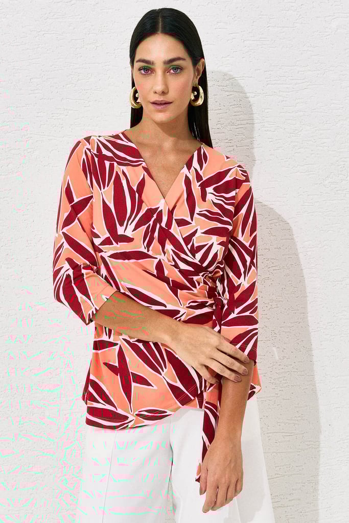 Blusa confeccionada em malha fluity. Possui decote transpassado fixado na lateral, manga 3/4, detalhe de amarração e barra arredondada.