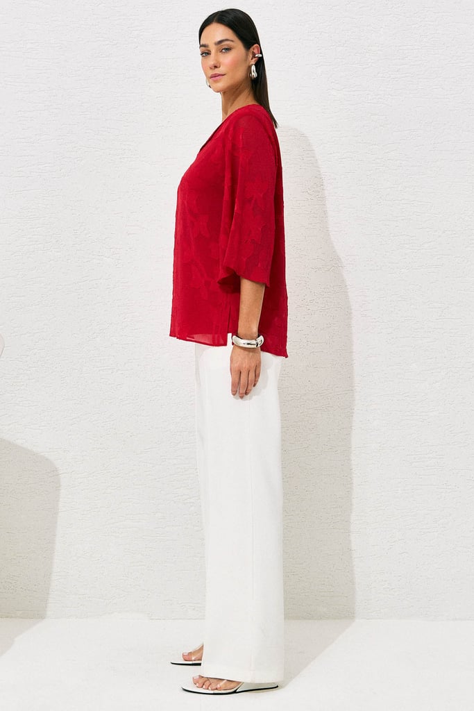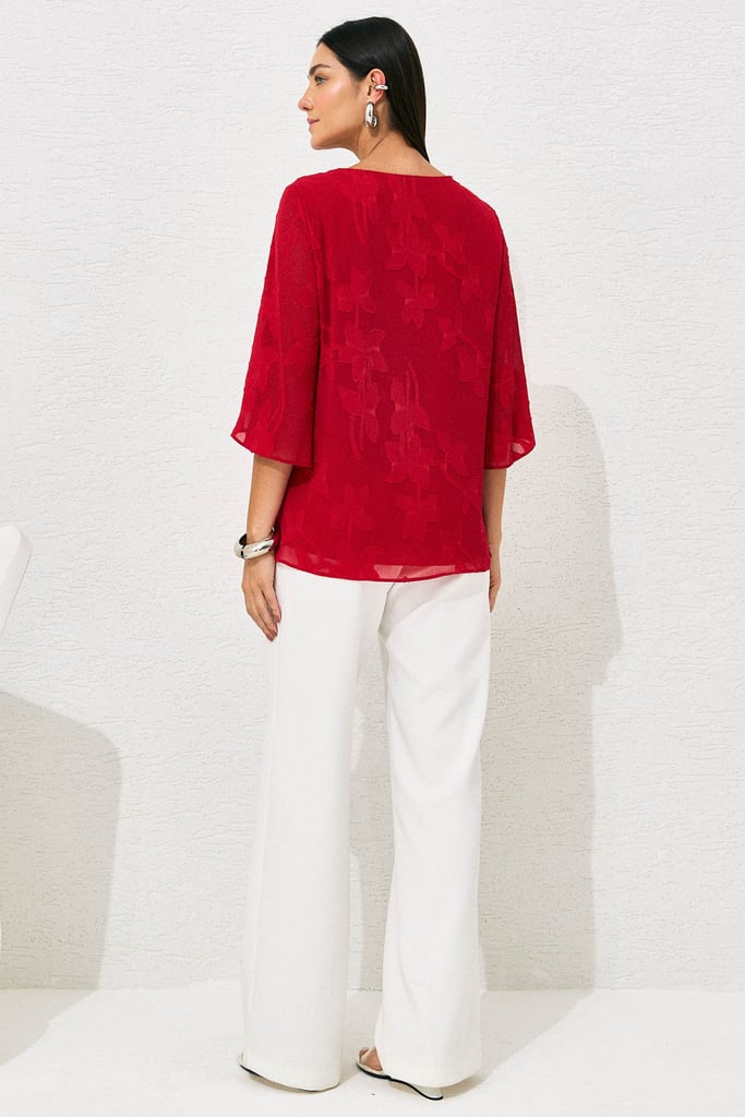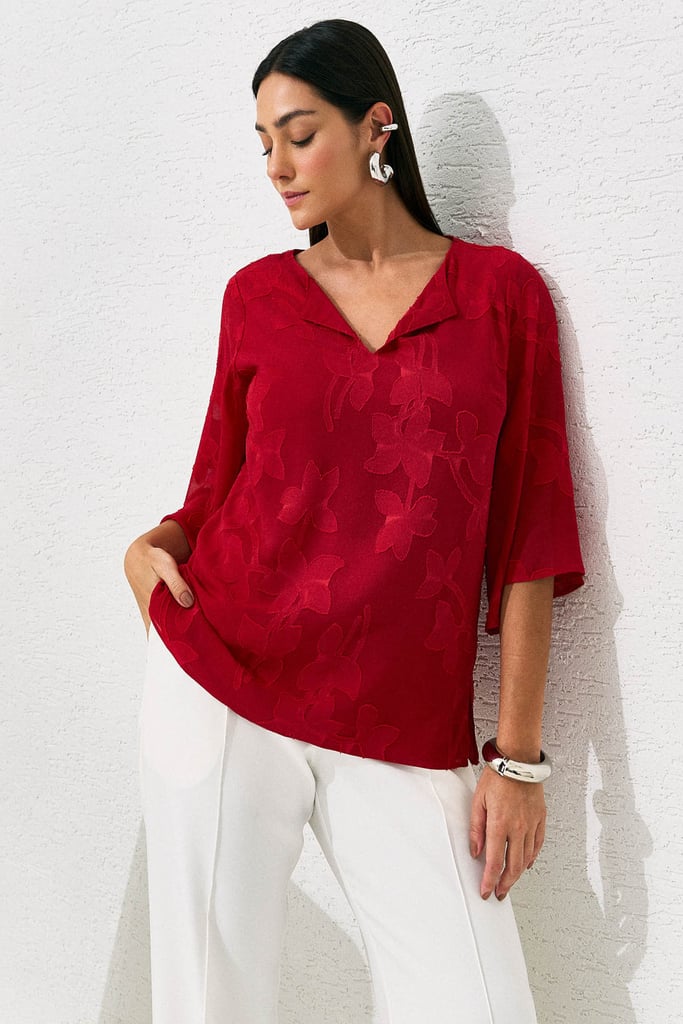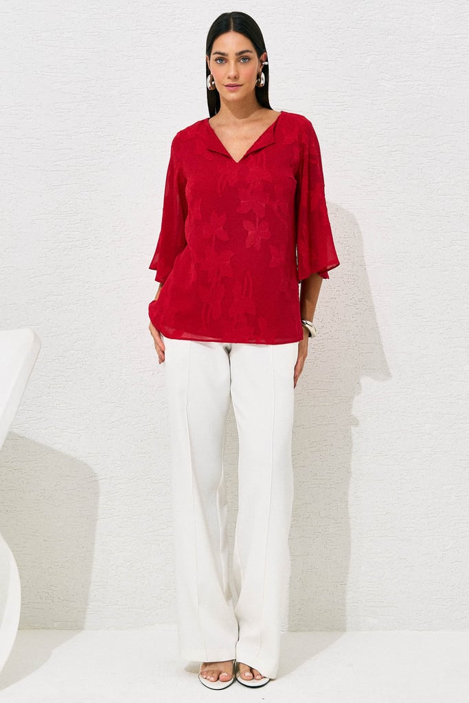 Delicada e sofisticada, esta blusa é confeccionada em tecido devorê com elegante padronagem floral. Possui decote redondo com abertura em V, que valoriza o colo de forma sutil, e mangas 3/4 com modelagem sino, trazendo leveza e movimento ao visual. A peça é forrada, garantindo conforto, discrição e um caimento impecável.