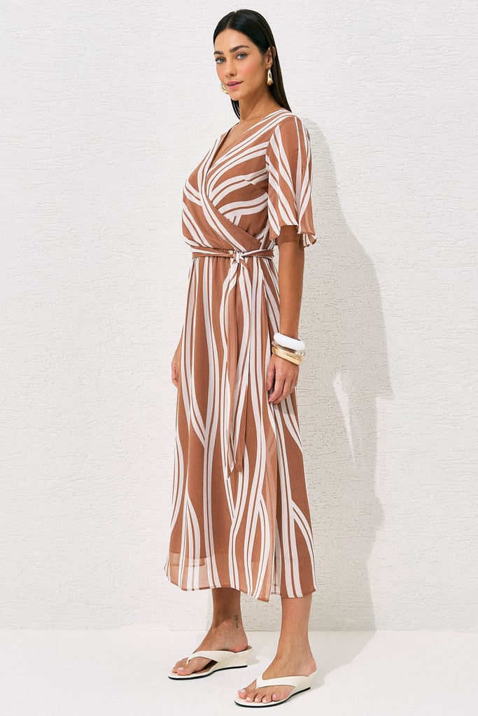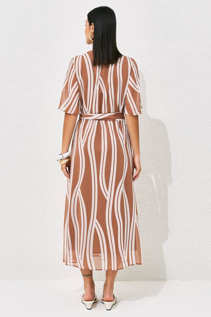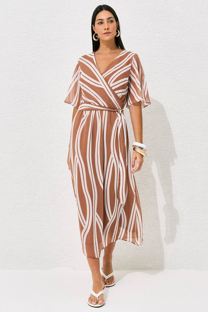Vestido confeccionado em chiffon estampado. Possui decote transpassado que valoriza o colo, a peça conta com mangas tipo sino com abertura, trazendo movimento e elegância. O elástico interno na cintura garante conforto e ajuste perfeito ao corpo. Acompanha faixa do mesmo tecido para amarração, permitindo versatilidade na modelagem.