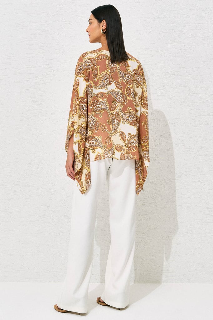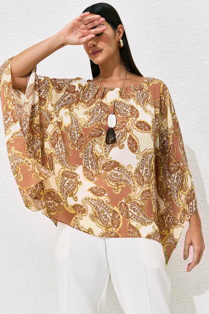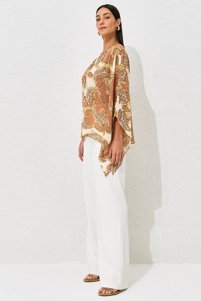 Blusa lenço confeccionada em chiffon fluido com estampa paisley. Possui modelagem tipo lenço e decote canoa com leve franzido.