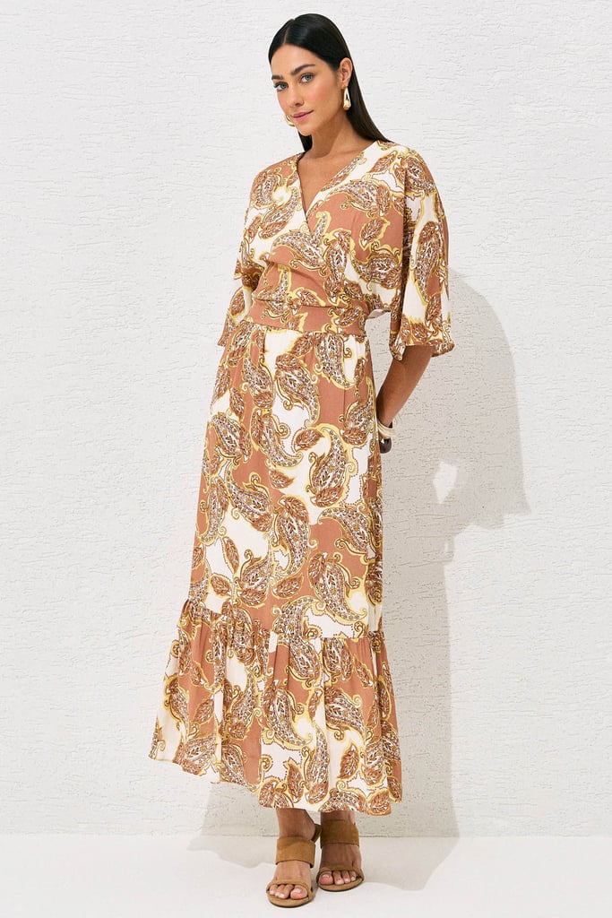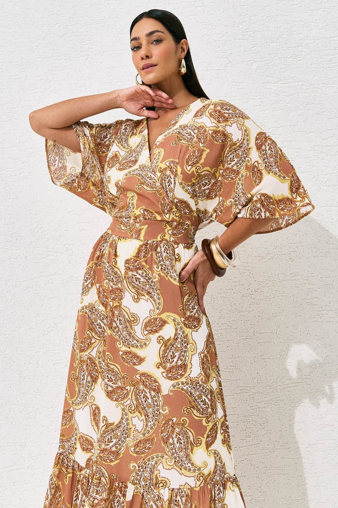 Vestido confeccionado em chiffon leve com estampa paisley. A peça conta com decote transpassado, recorte na cintura que valoriza a silhueta e detalhe de lastex nas costas para maior conforto e ajuste perfeito. A saia fluida com babado na barra adiciona movimento e feminilidade ao look. Peça forrada.