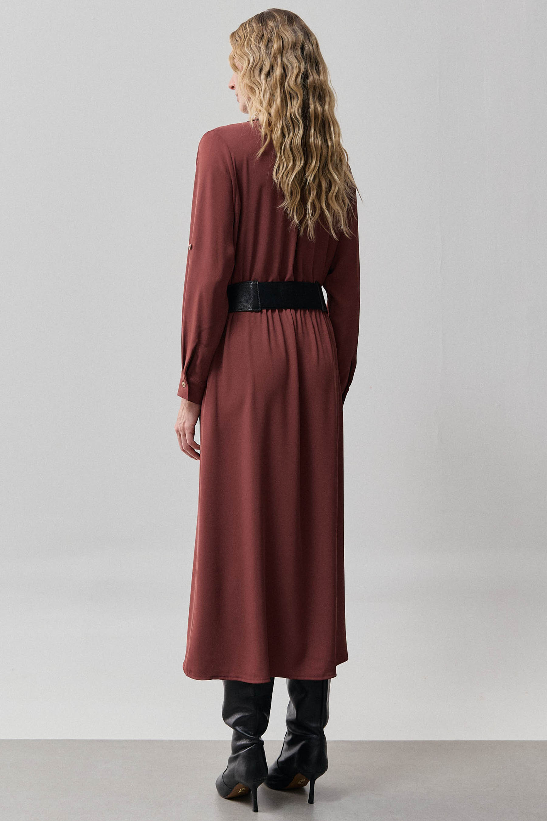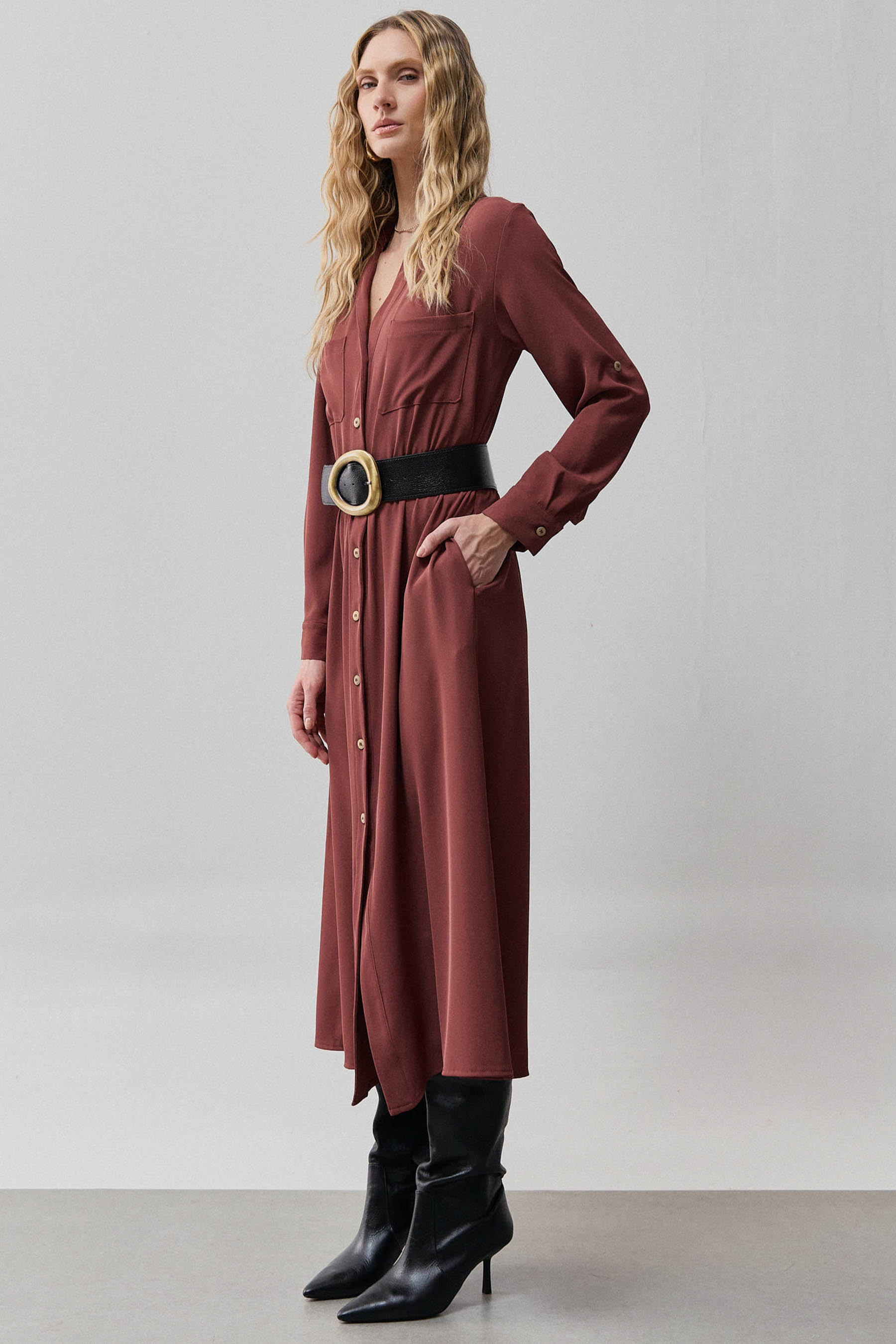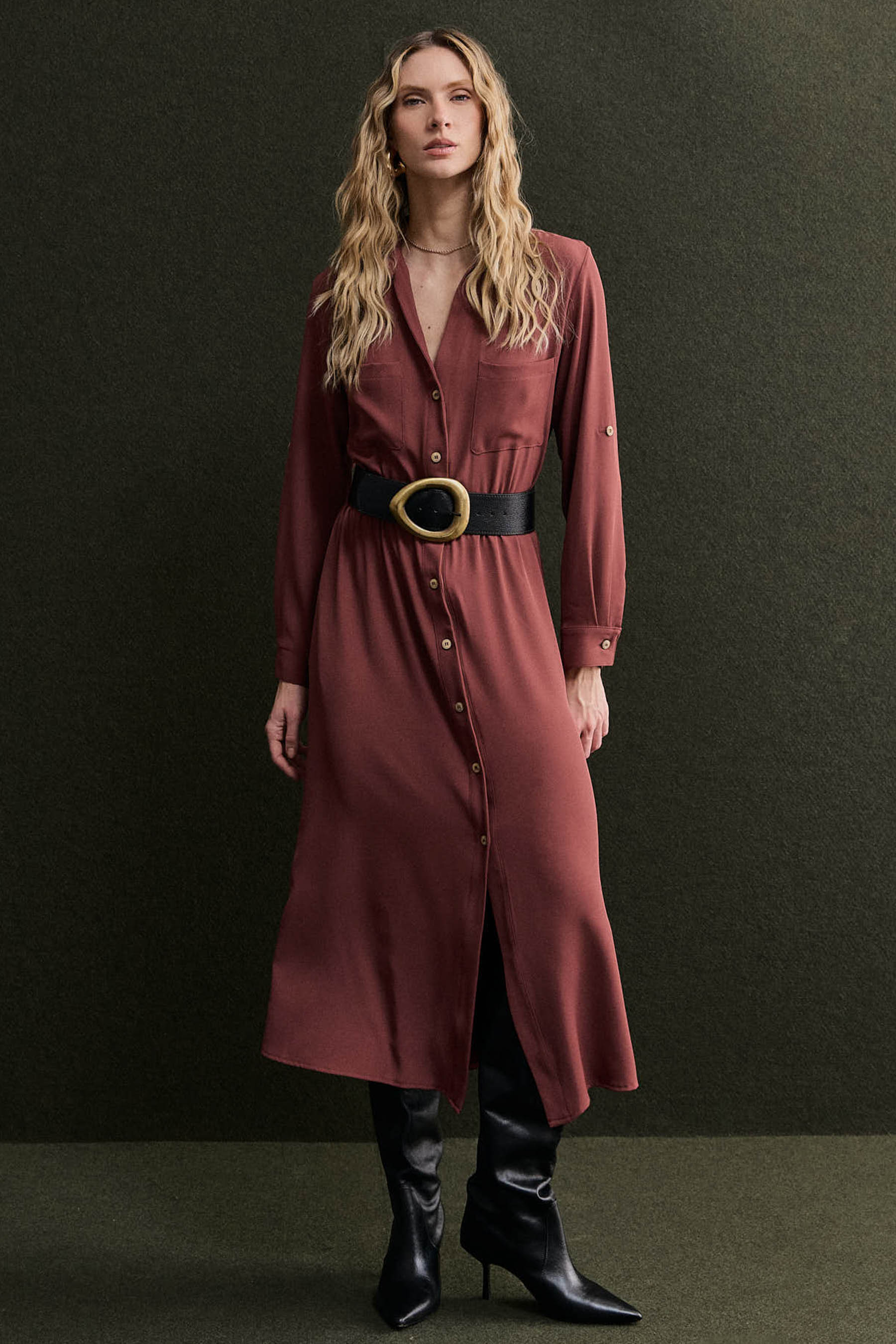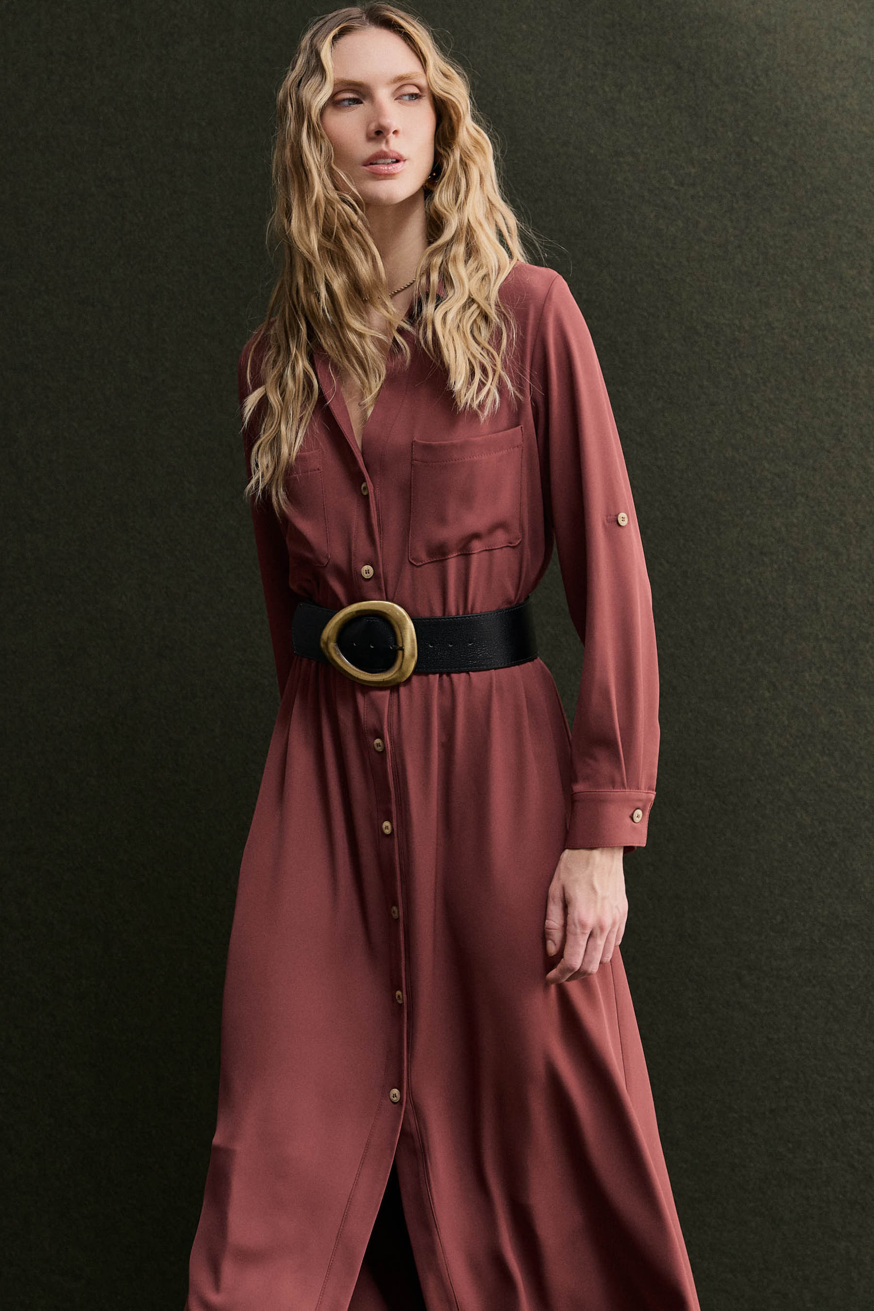 Chemise confeccionada em crepe liso de caimento leve. O modelo possui gola clássica, vista frontal com abotoamento, mangas longas com martingale para ajuste do comprimento, bolsos funcionais no busto e laterais, além de detalhe de prega nas costas. O elástico interno na cintura proporciona melhor ajuste ao corpo e valoriza a silhueta. Acompanha cinto do mesmo tecido com fivela de palha, adicionando um toque natural e sofisticado ao visual. Observação: o cinto utilizado nas fotos é apenas para efeito de styling e não acompanha a peça.