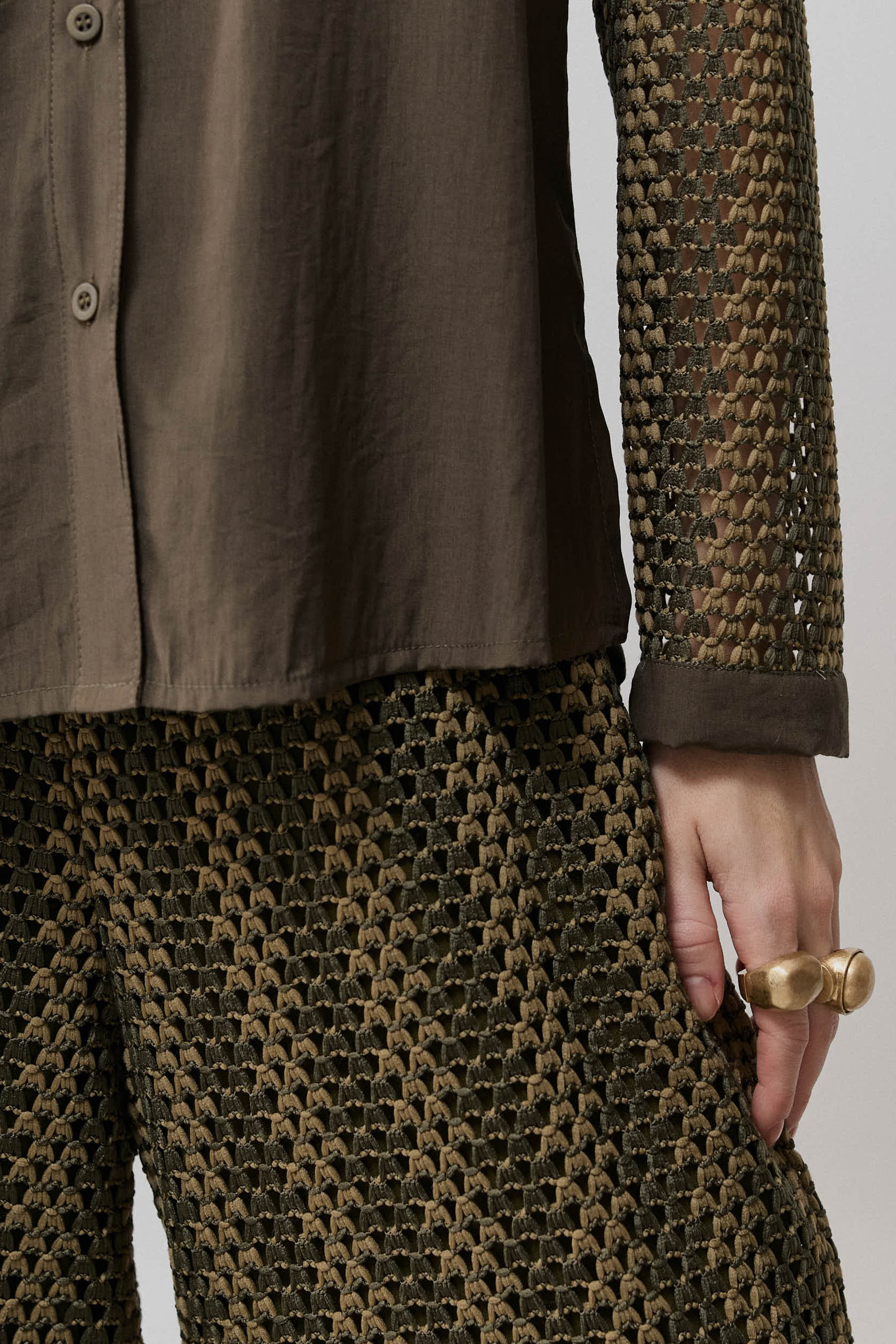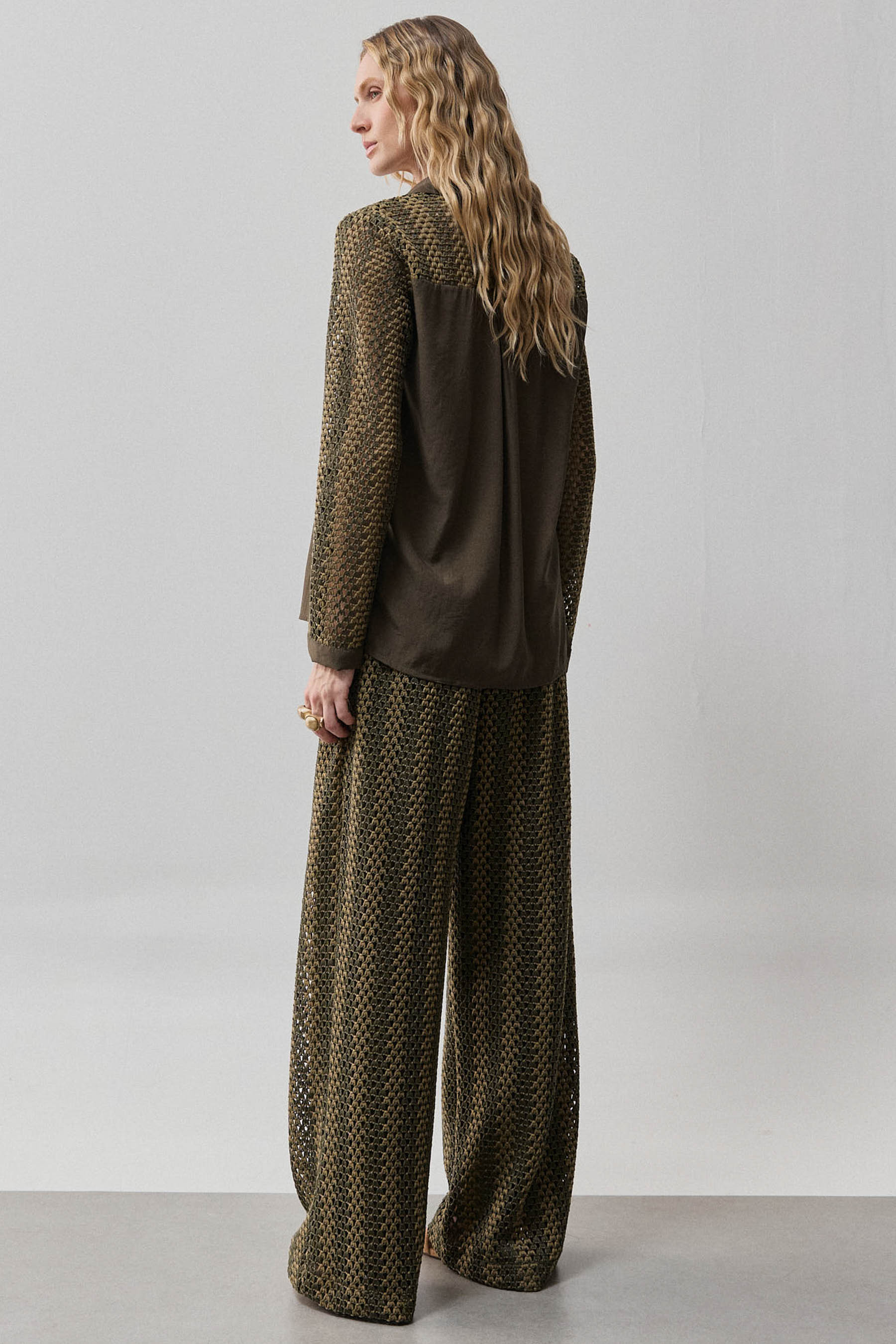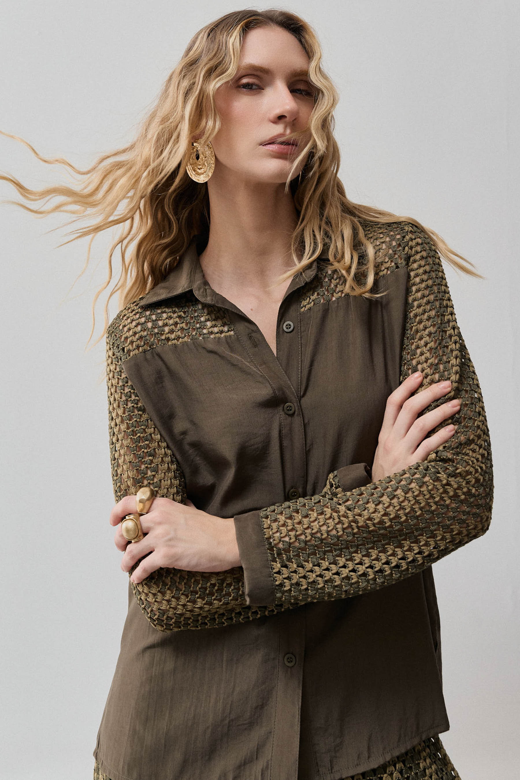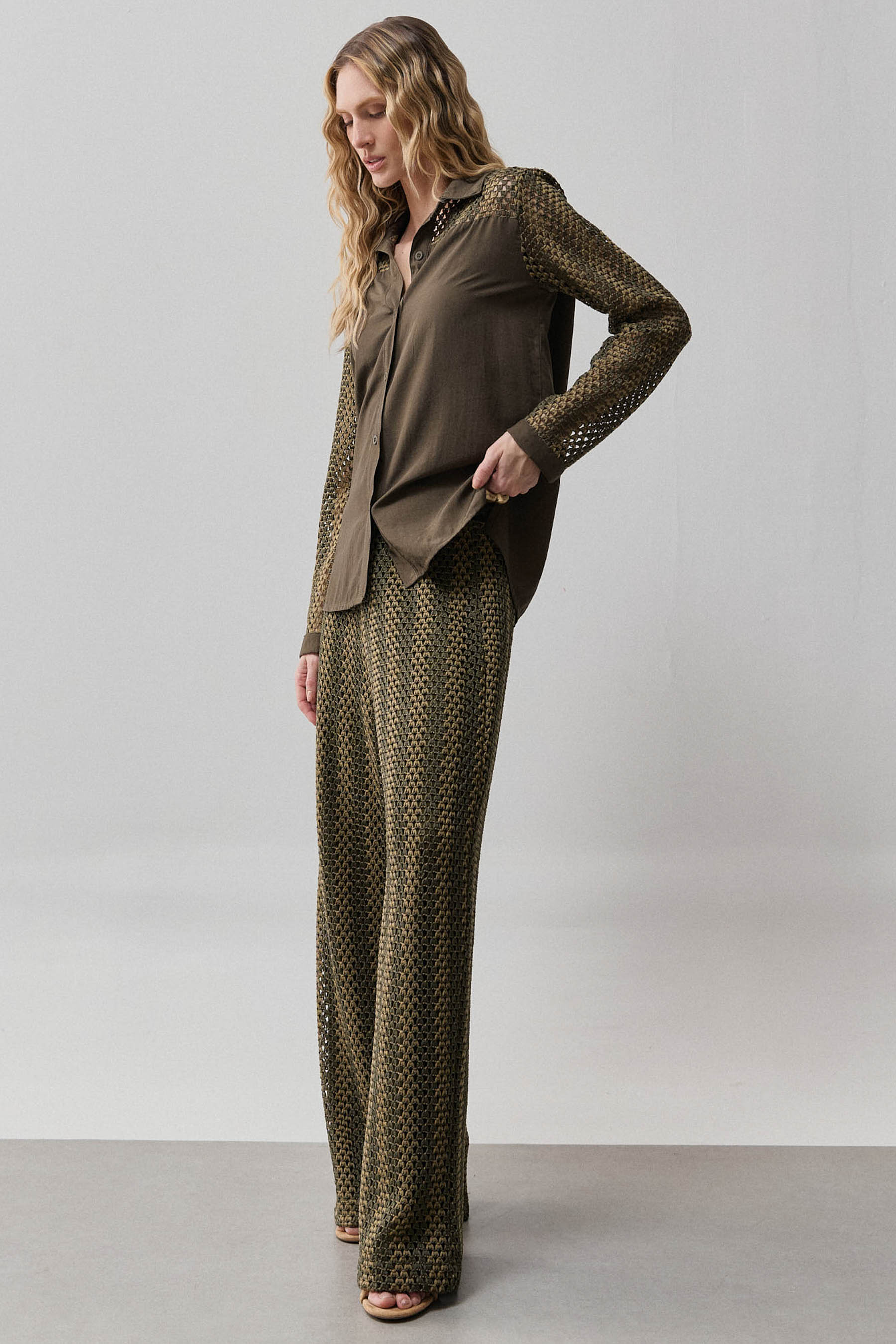 Conjunto confeccionado na combinação de tricot e tecido plano. A camisa possui gola clássica, vista frontal com abotoamento e detalhes em tricot na pala dos ombros e costas e nas mangas, criando um contraste sutil de textura que valoriza o visual. A calça em tricot apresenta modelagem reta, caimento confortável e cós com elástico nas costas, proporcionando conforto e ajuste perfeito ao corpo, além de forro interno que garante segurança e melhor acabamento.