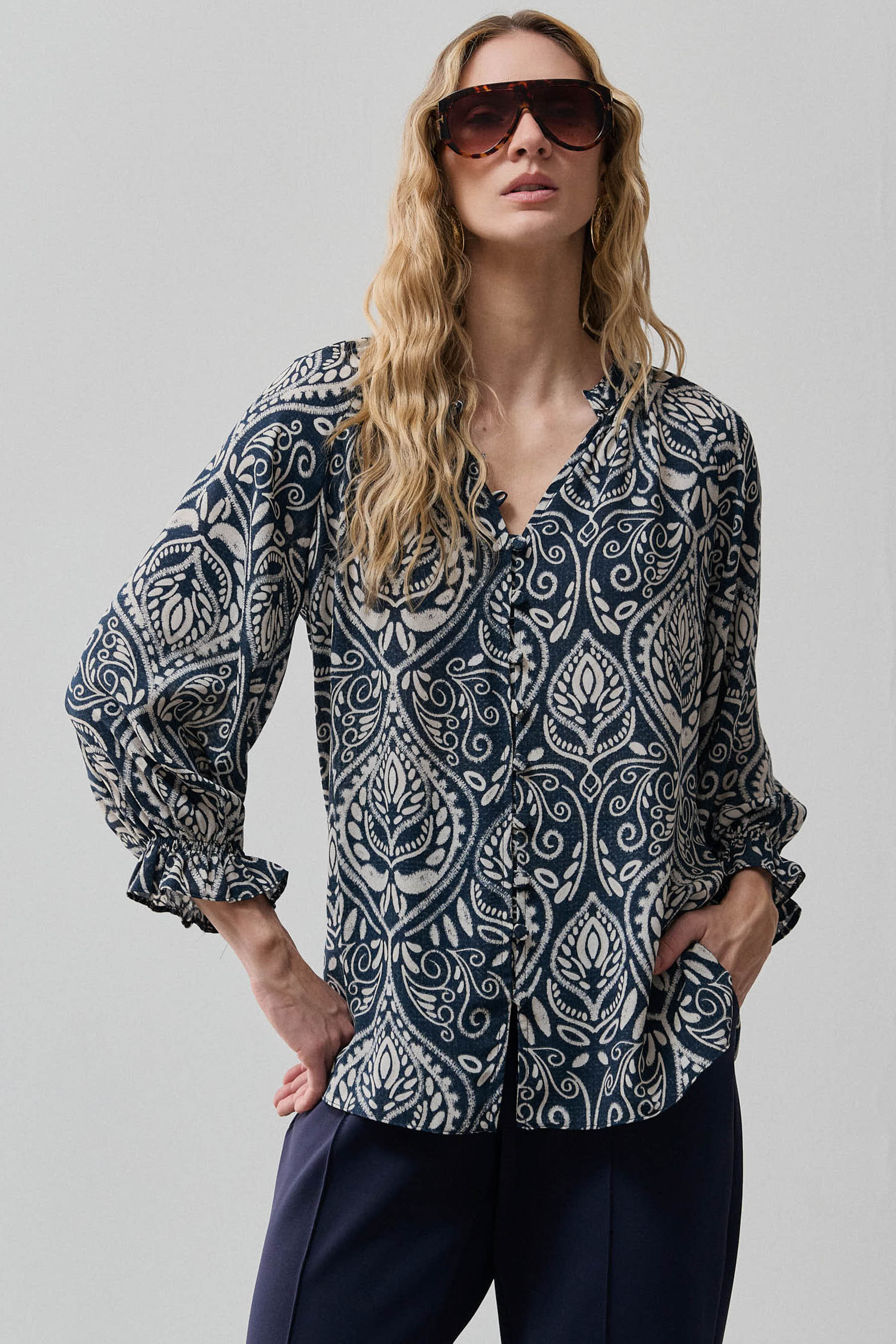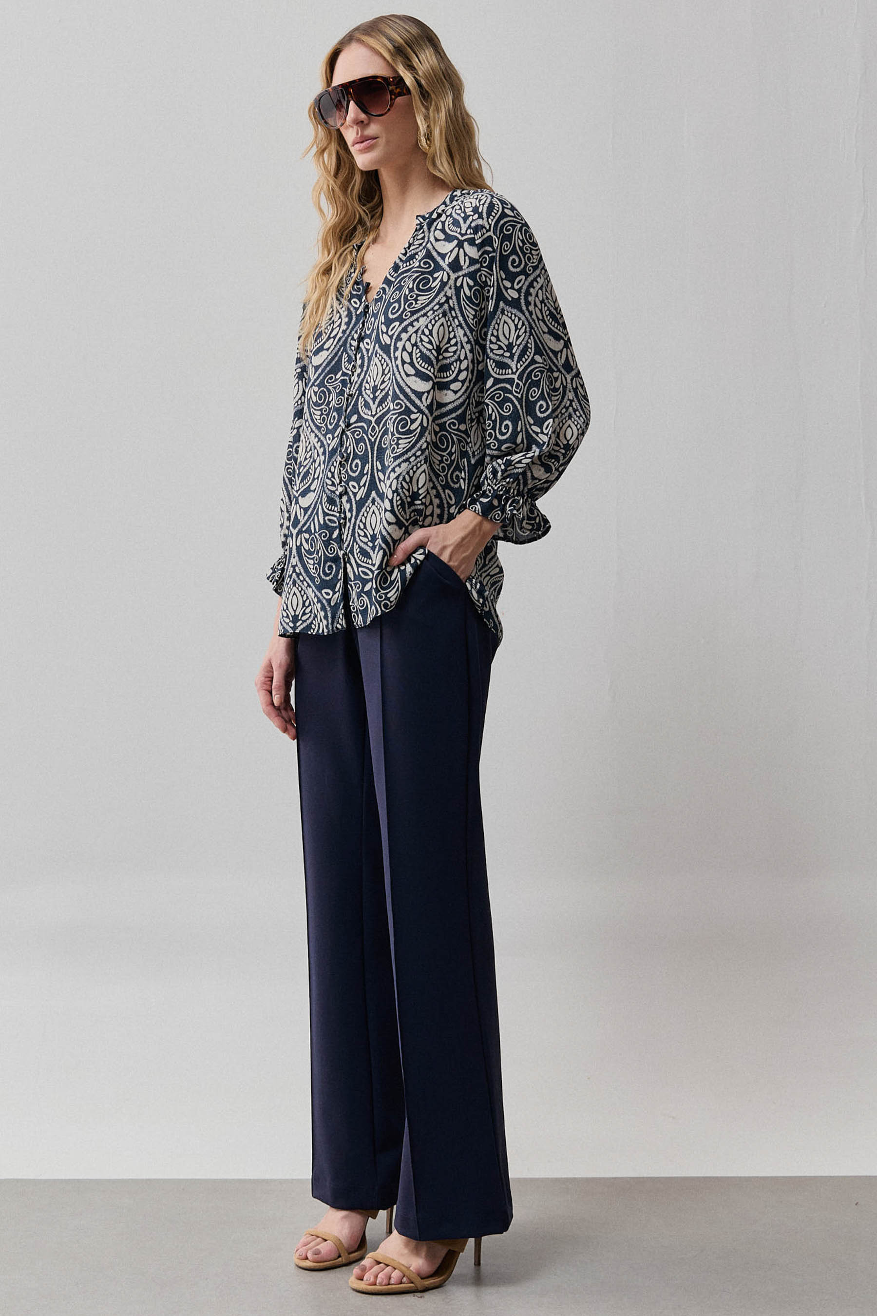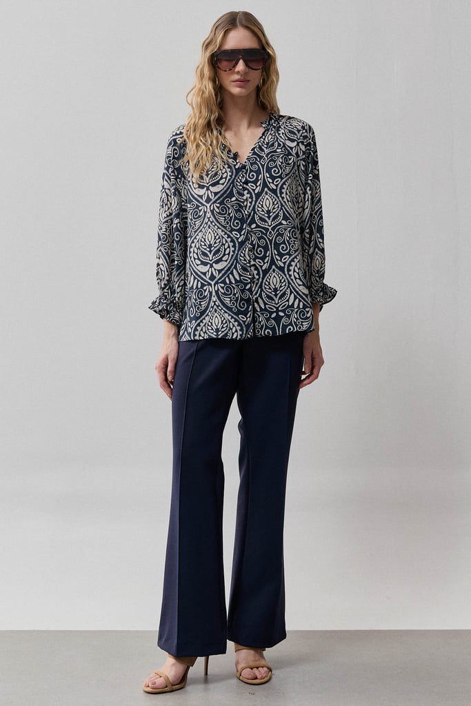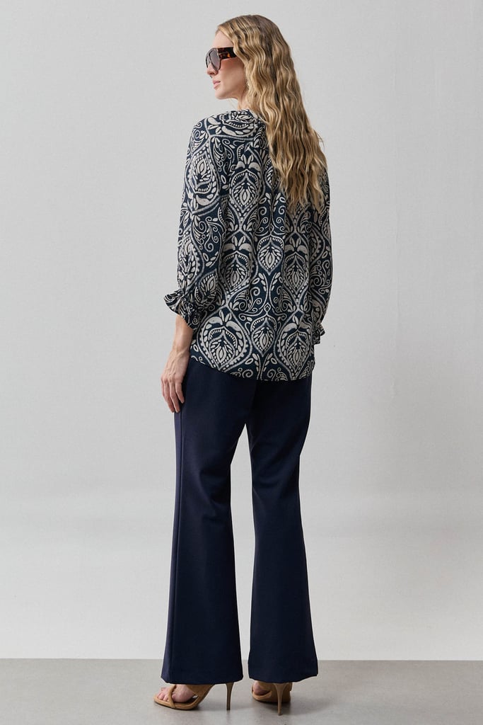 Blusa confeccionada em crepe leve com sofisticada estampa no estilo cashmere. O modelo possui abotoamento frontal com delicados botões forrados, que agregam acabamento refinado à peça. As mangas 3/4 apresentam leve volume e punhos com elástico, proporcionando conforto e melhor ajuste ao corpo. De caimento fluido e elegante, é uma peça versátil, ideal para composições que equilibram sofisticação e praticidade.