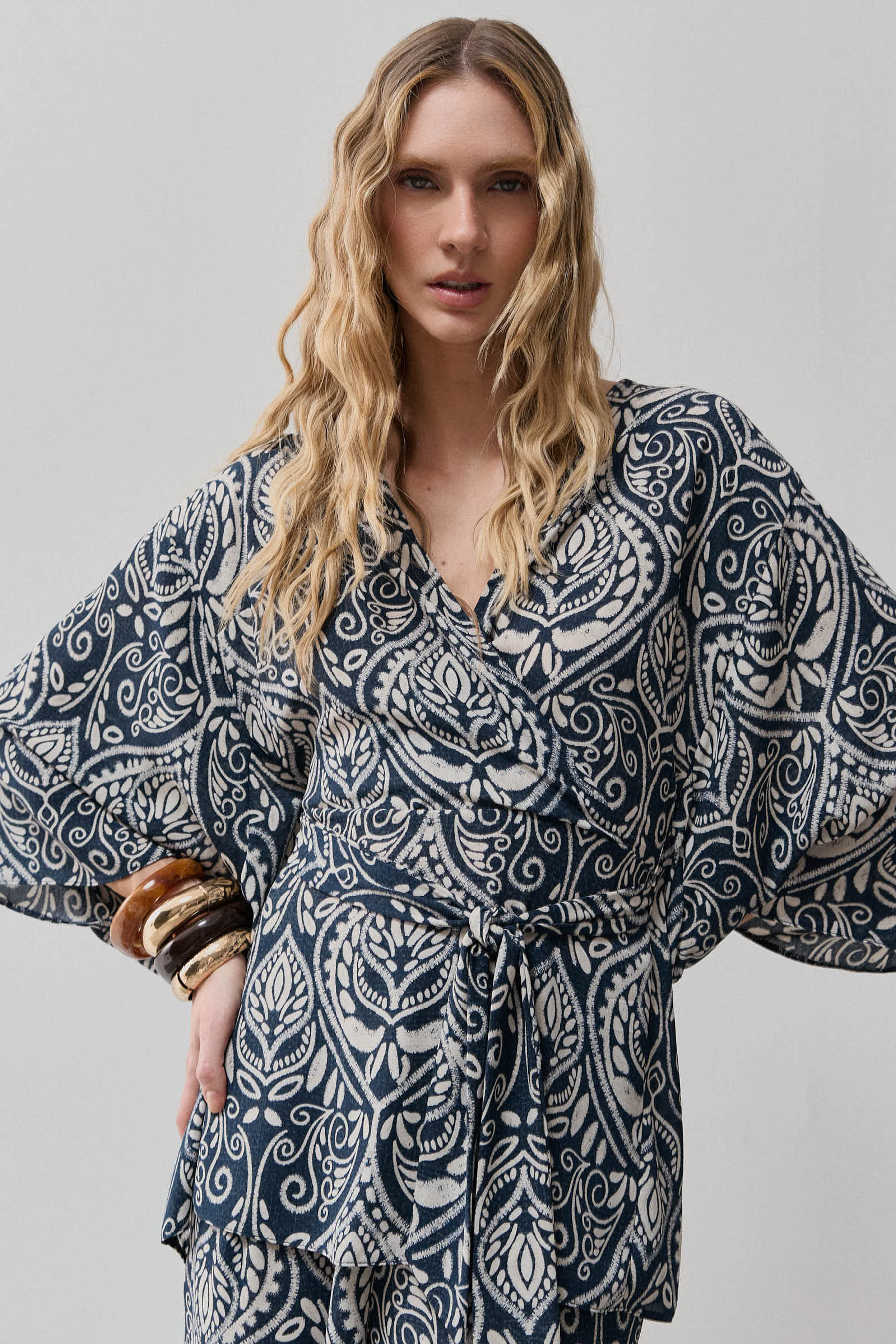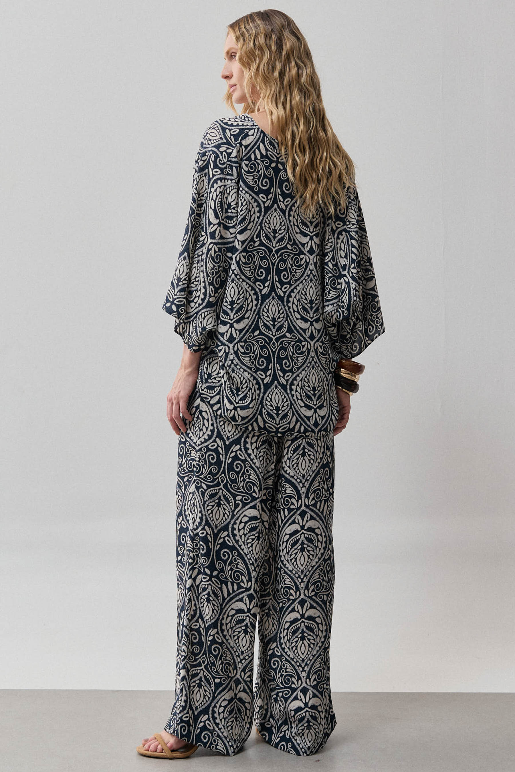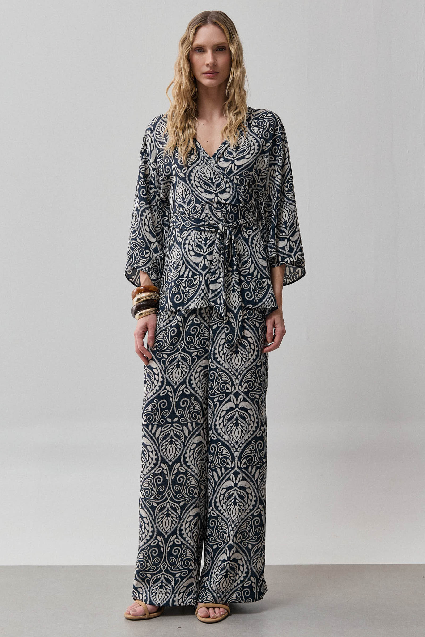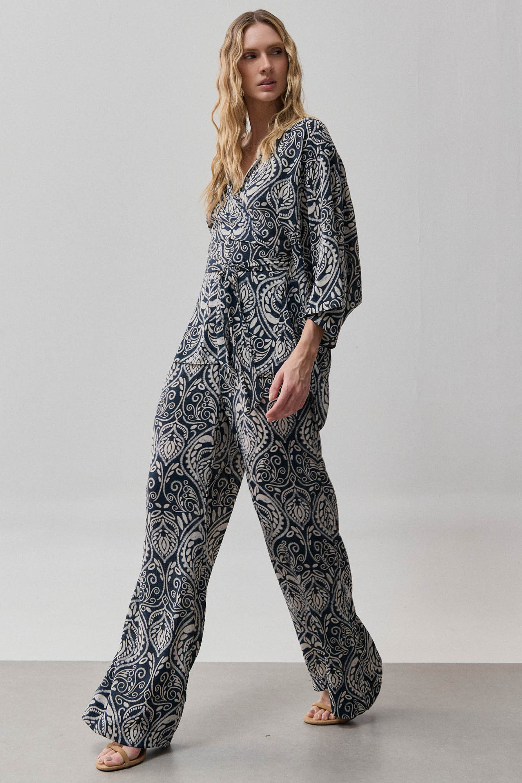 Conjunto confeccionado em crepe leve com estampa no estilo cashmere, que imprime personalidade à produção com elegância atemporal. A blusa possui decote transpassado que valoriza o colo e detalhe lateral para passagem da faixa, permitindo amarração personalizada e ajuste delicado à silhueta. As mangas amplas 3/4 equilibram fluidez e sofisticação, criando movimento sutil ao vestir. A calça apresenta modelagem reta, com pregas frontais que alongam a linha das pernas, bolsos laterais funcionais e cós com elástico nas costas, proporcionando conforto e ajuste perfeito ao corpo. Um conjunto versátil, que transita com naturalidade entre o casual refinado e ocasiões especiais.