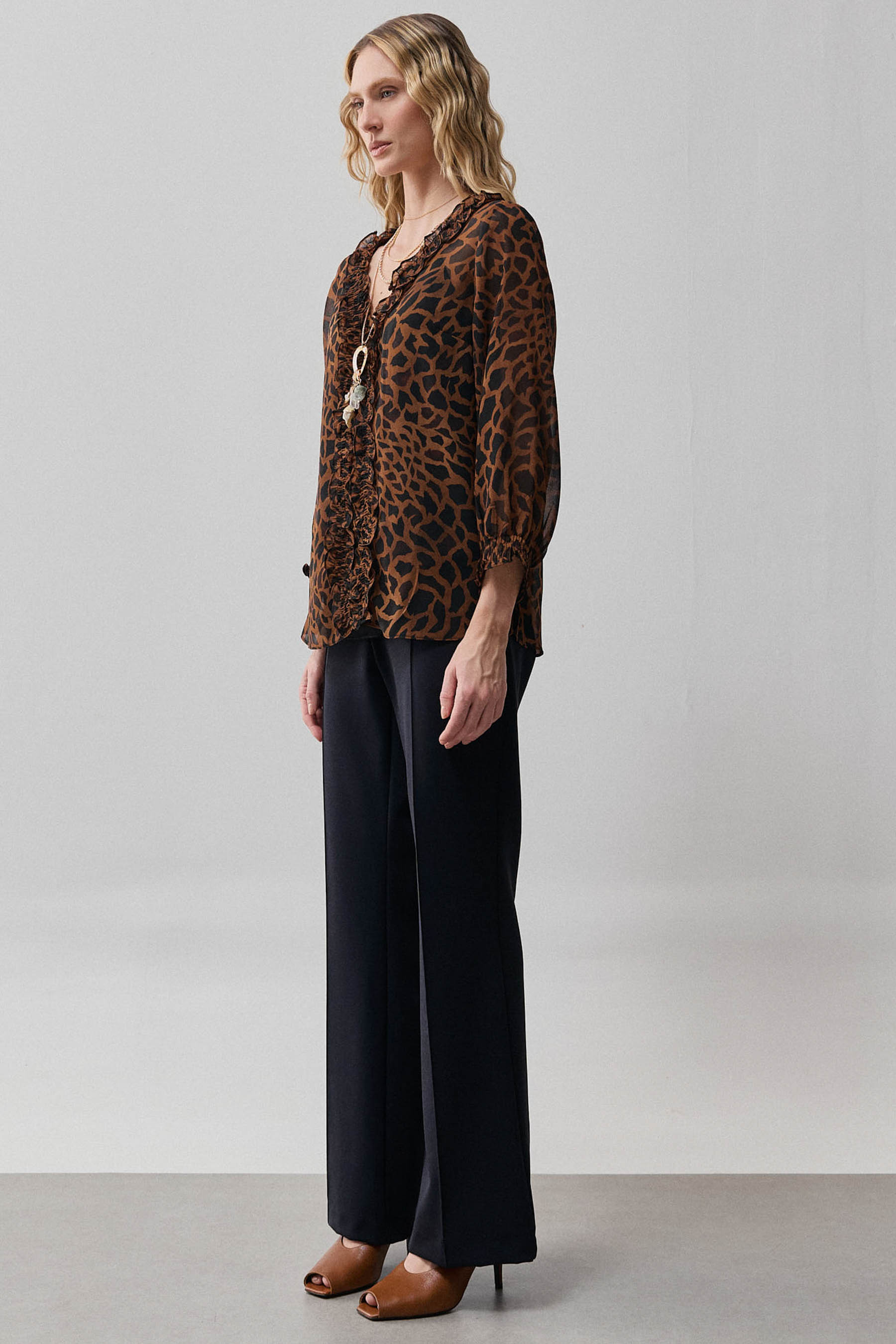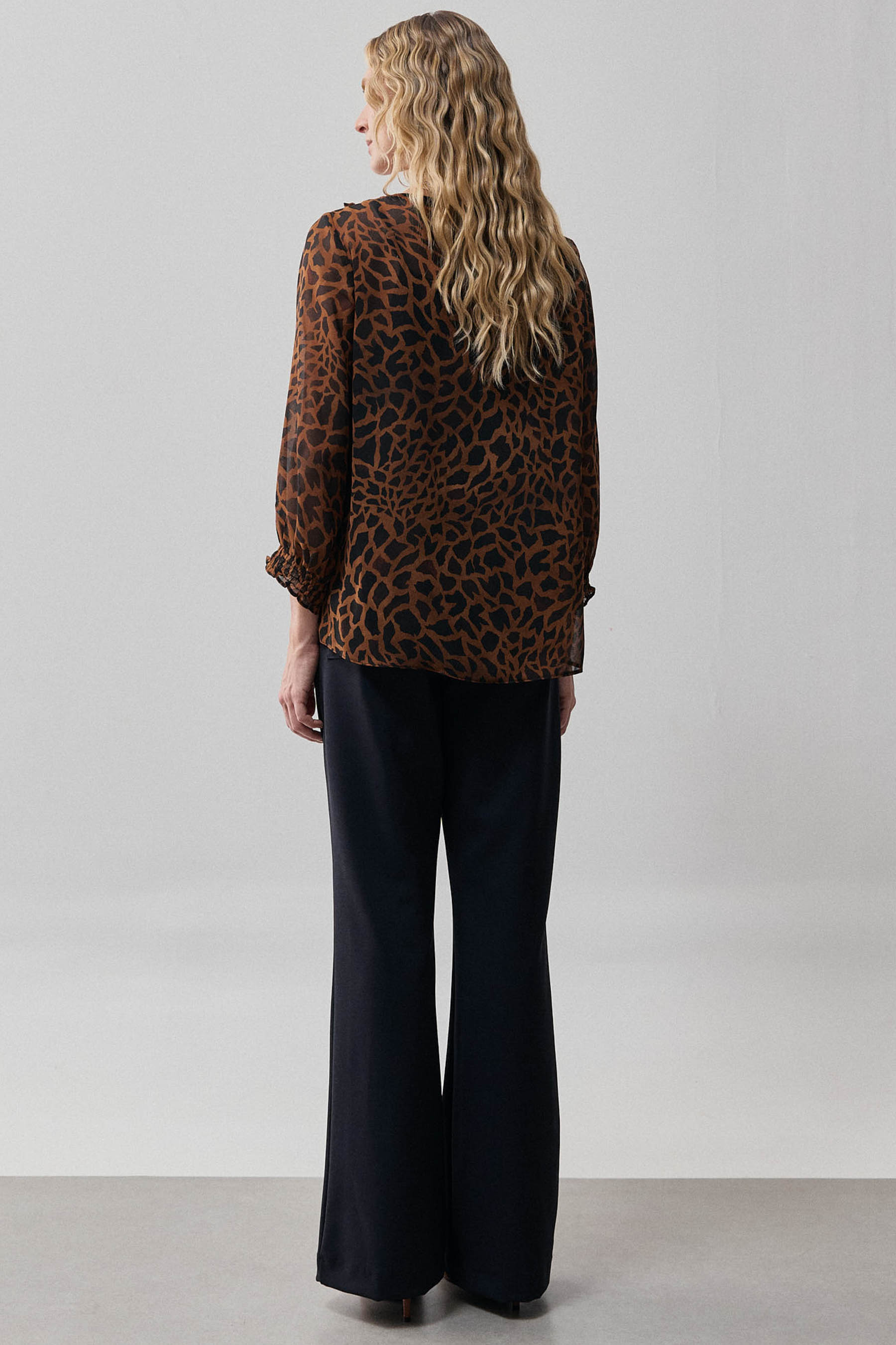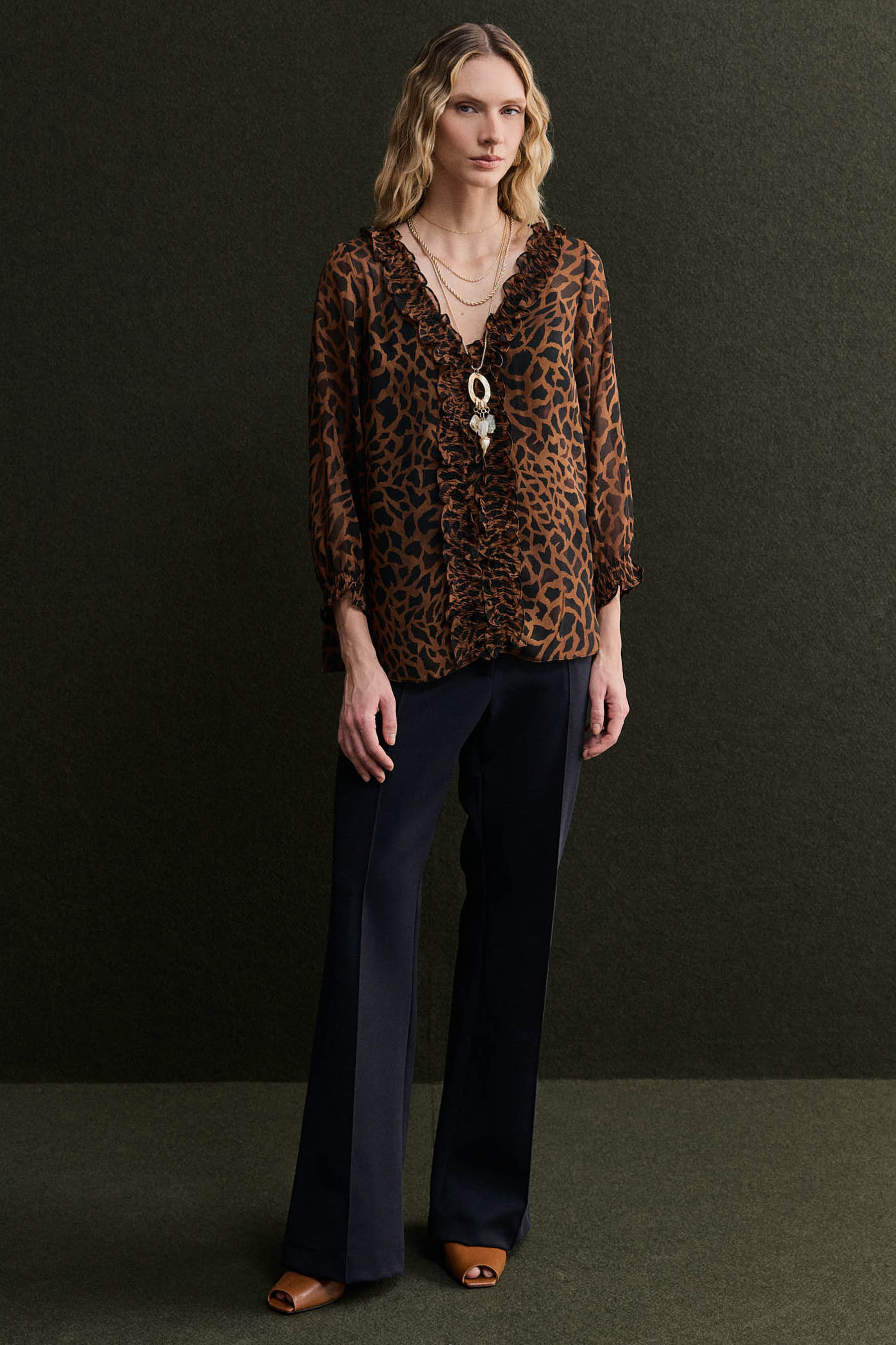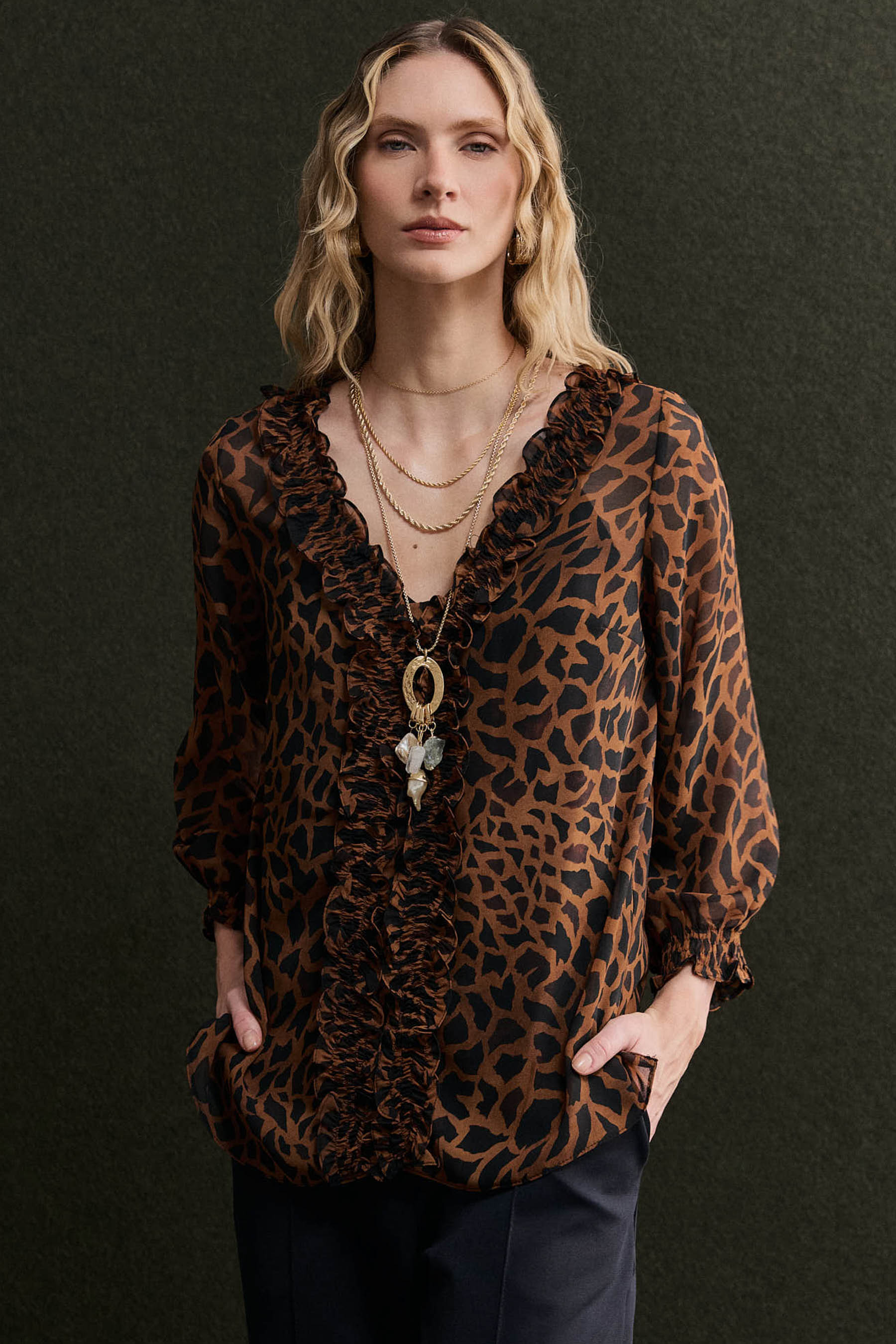 Blusa confeccionada em chiffon com padronagem animal print, que une leveza e sofisticação na medida certa. O modelo possui decote em V com detalhe de lastex aplicado ao longo da parte frontal, criando um delicado efeito franzido que valoriza o visual. As mangas 3/4 com acabamento em lastex proporcionam conforto e leve volume, enquanto o forro de anágua garante segurança e discrição, evitando transparências indesejadas.