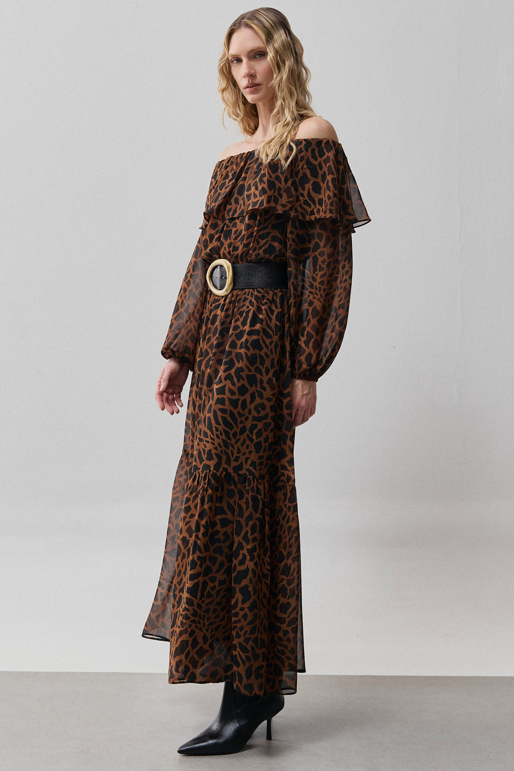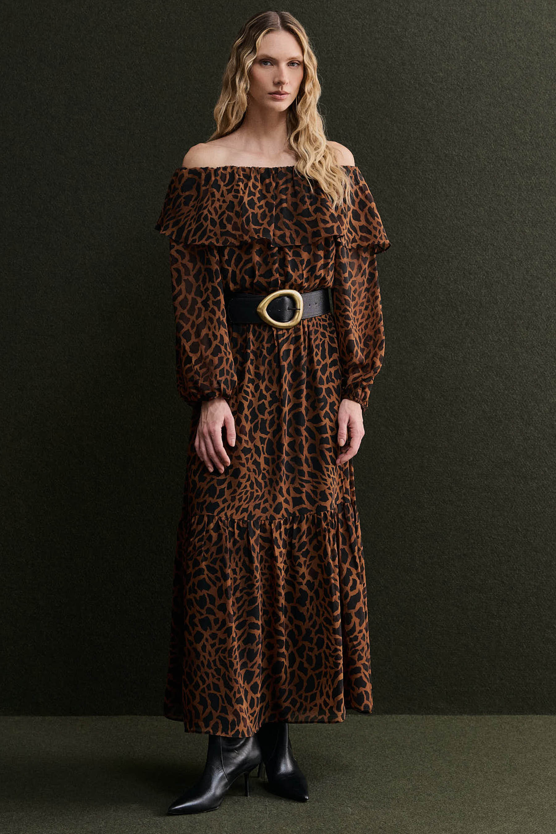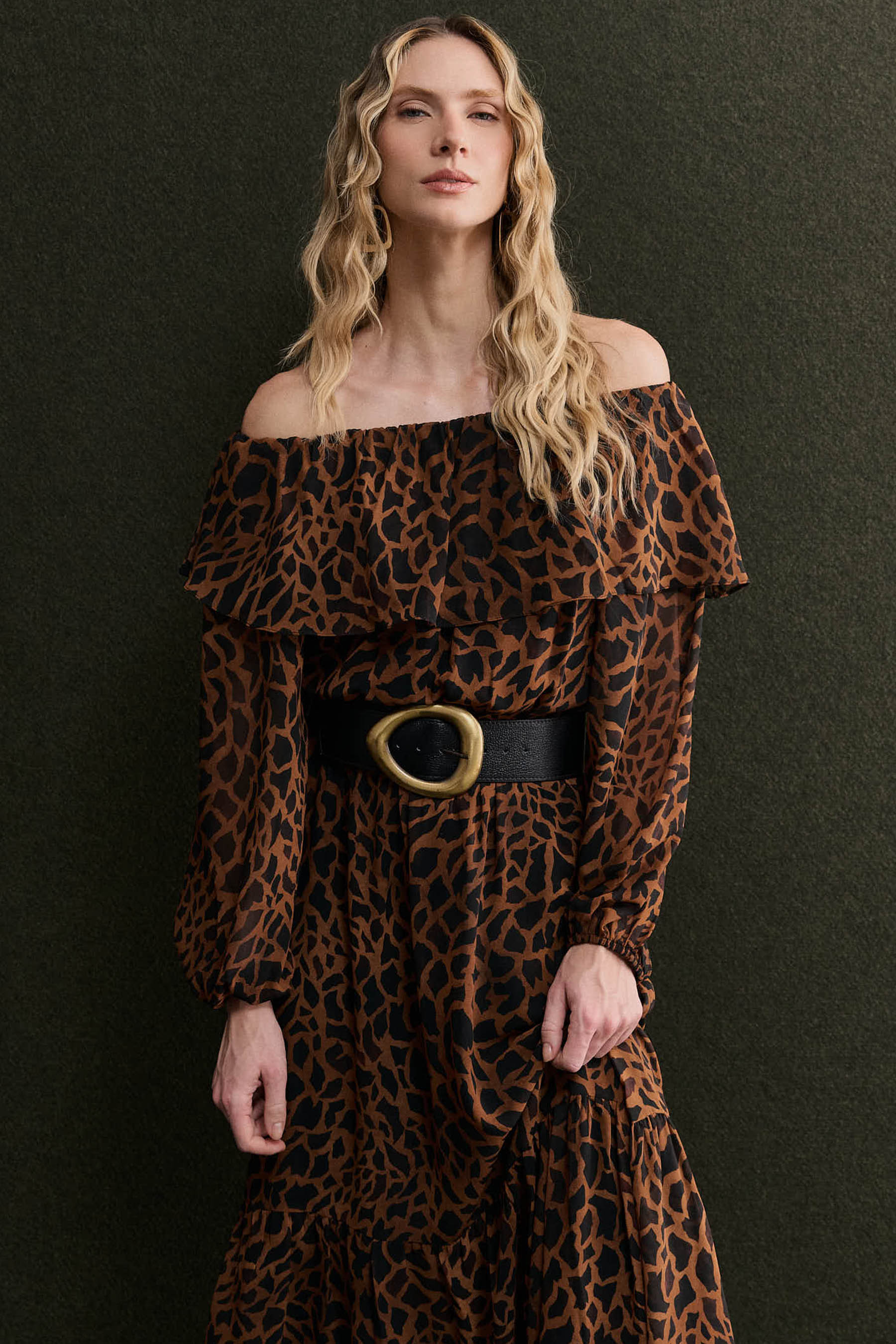 Vestido confeccionado em chiffon com padronagem animal print. O modelo apresenta decote com babado, podendo ser usado de forma tradicional ou ombro a ombro, oferecendo versatilidade e charme. As mangas longas com acabamento em elástico trazem leveza ao visual, enquanto o elástico na cintura valoriza a silhueta com sutileza. O vestido ainda conta com babado aplicado na barra, que acrescenta movimento à peça. Peça forrada.