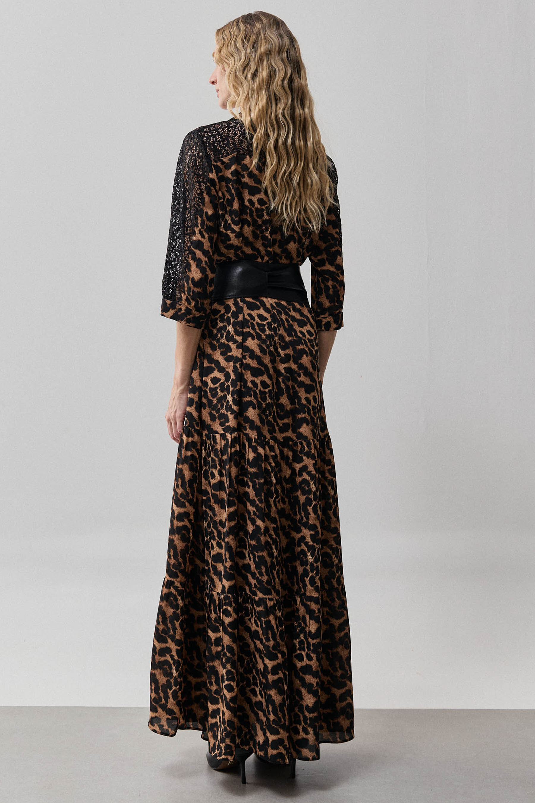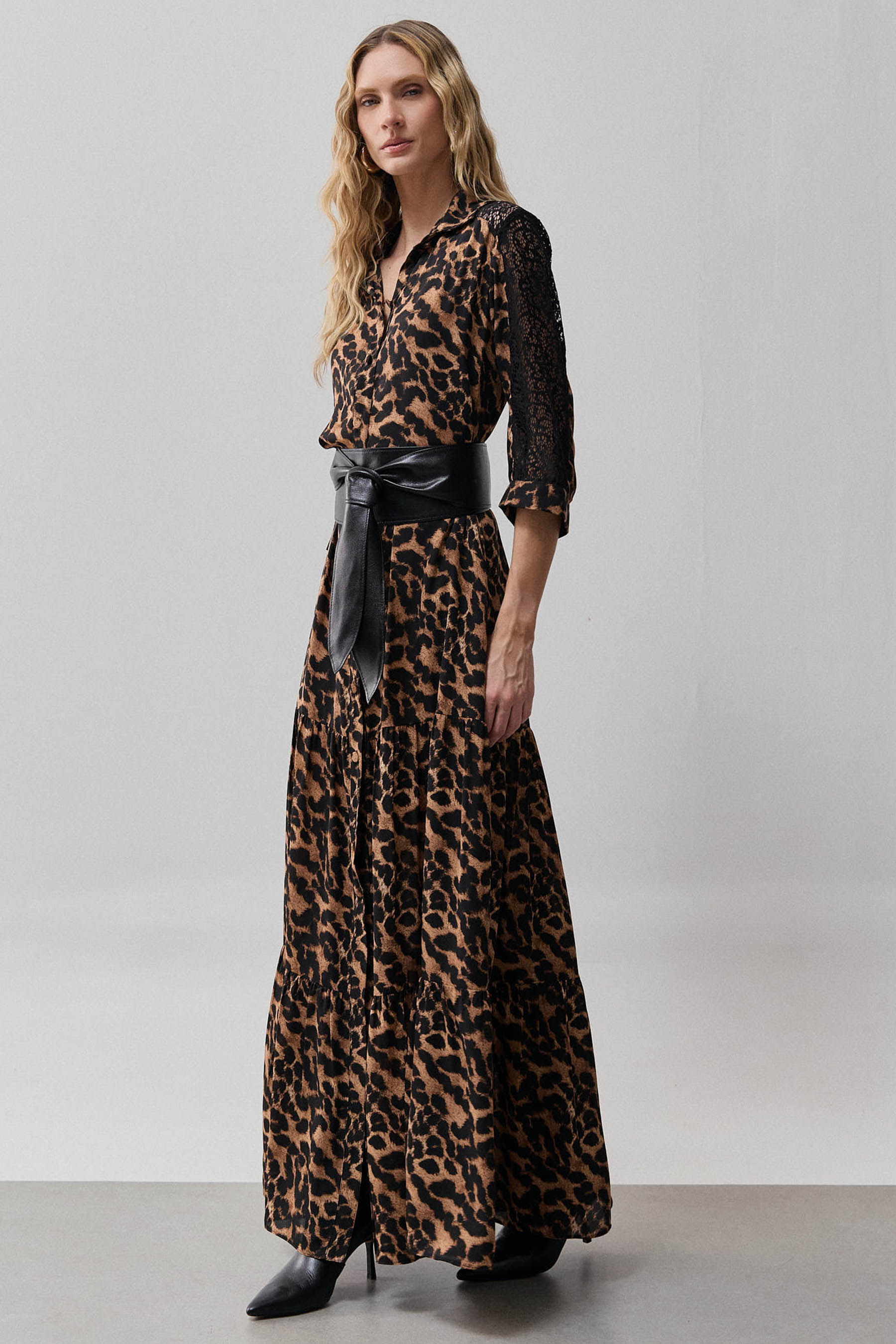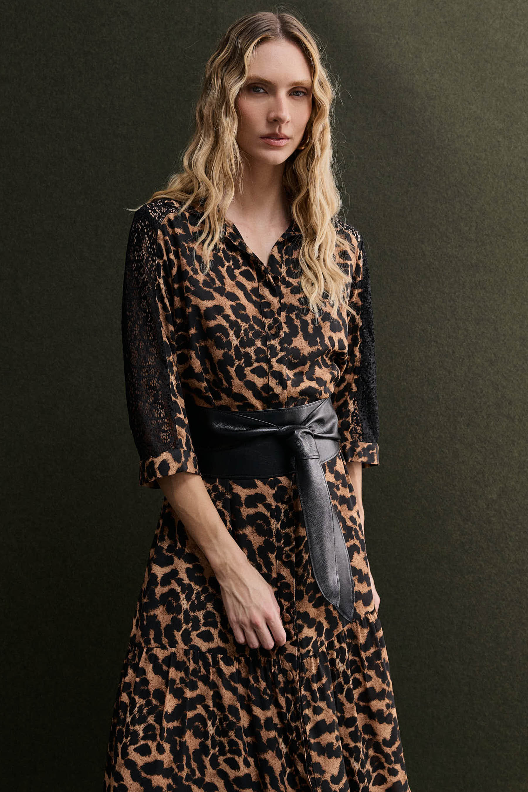 Chemise confeccionada em crepe leve com padronagem animal print, ideal para compor looks sofisticados e atemporais. O modelo apresenta vista frontal com abotoamento, gola clássica e mangas 3/4 com delicada aplicação de renda, que acrescenta feminilidade ao visual. A saia em camadas confere movimento e fluidez, enquanto o comprimento longo garante um caimento elegante. Acompanha faixa do mesmo tecido para amarração na cintura, permitindo ajustar a silhueta com charme e versatilidade.