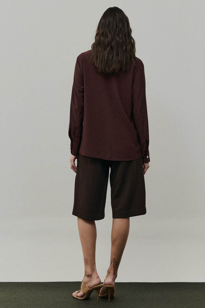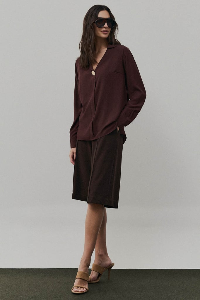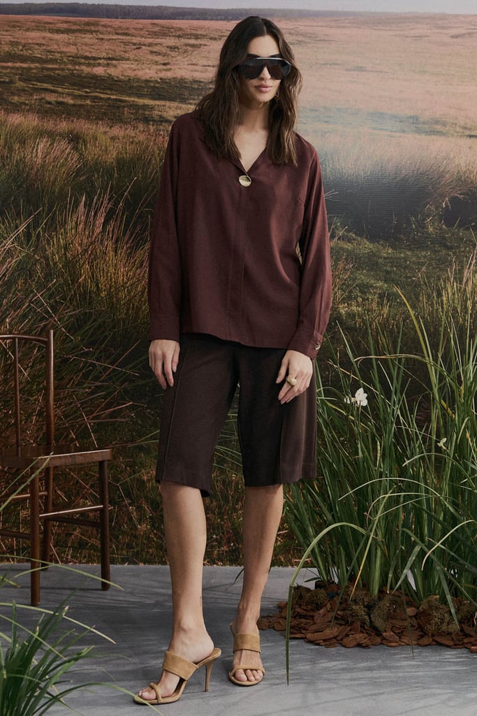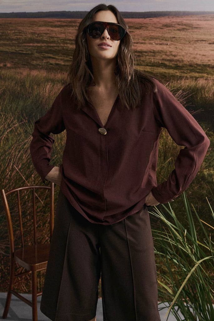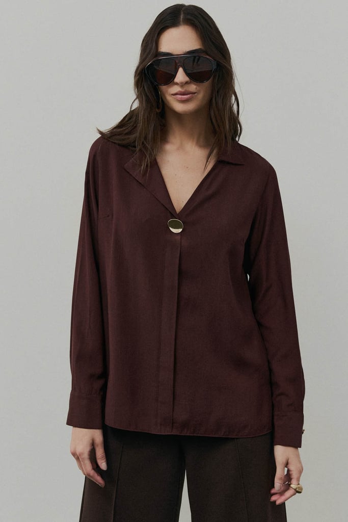 Camisa confeccionada em tecido plano, com modelagem reta e caimento leve, que valoriza o corpo com elegância e naturalidade. Possui gola tradicional, mangas longas com abotoamento nos punhos e vista frontal com botão decorativo, que traz um toque sofisticado e contemporâneo à peça. Versátil, transita com facilidade entre produções mais formais e propostas casuais, sendo uma escolha atemporal para diferentes ocasiões.