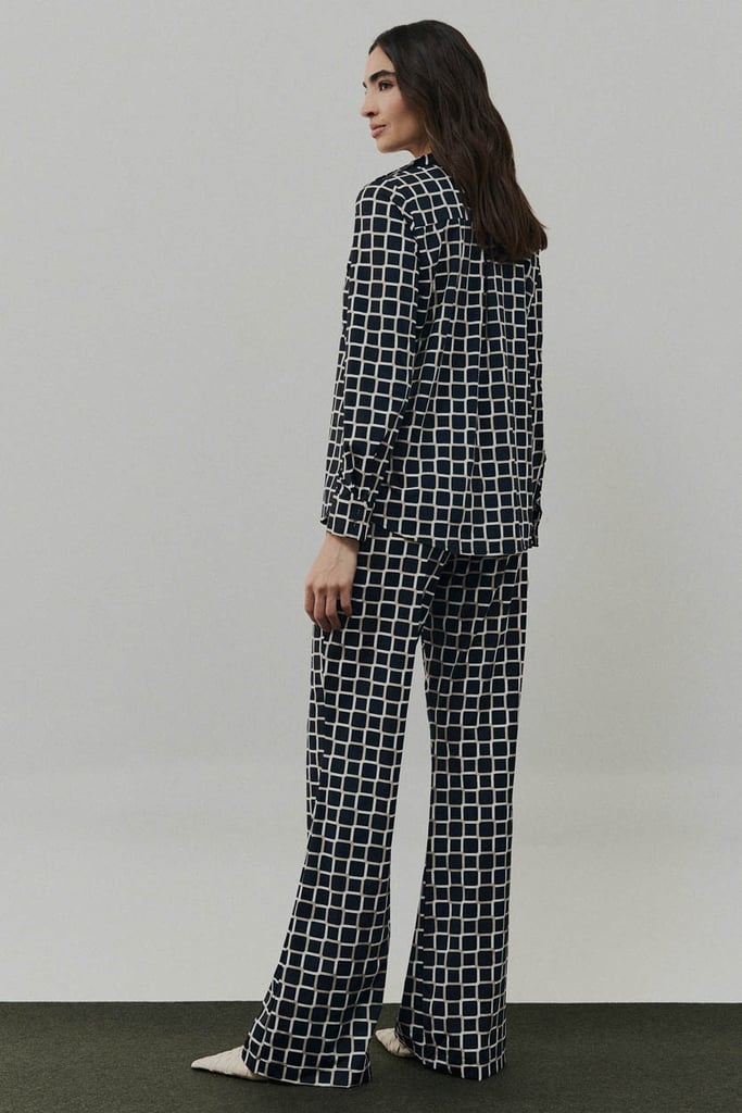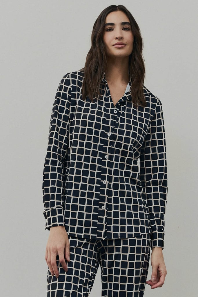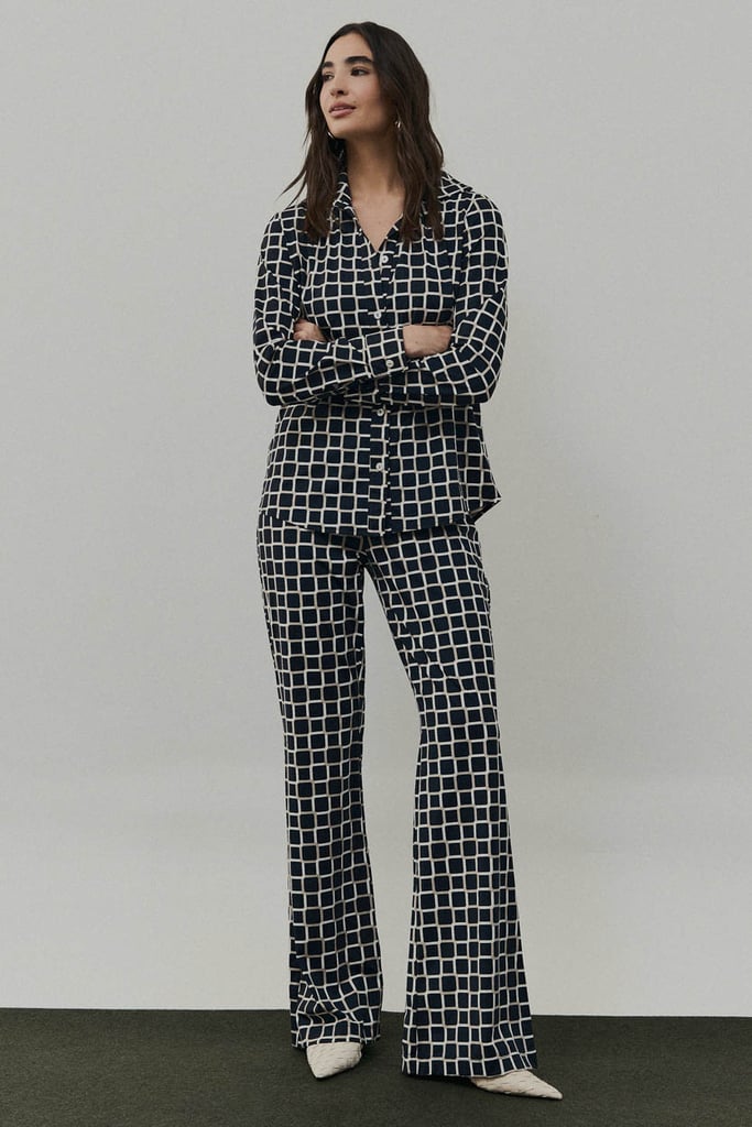 Conjunto confeccionado em malha Fluity com estampa exclusiva, proporcionando toque macio, conforto e excelente caimento. A camisa apresenta gola clássica, vista frontal com fechamento por botões, mangas longas com abotoamento nos punhos e detalhe de prega nas costas, trazendo sofisticação à peça. A calça possui modelagem bootcut. O cós com elástico em toda a circunferência da cintura proporciona conforto e ajuste perfeito ao corpo.