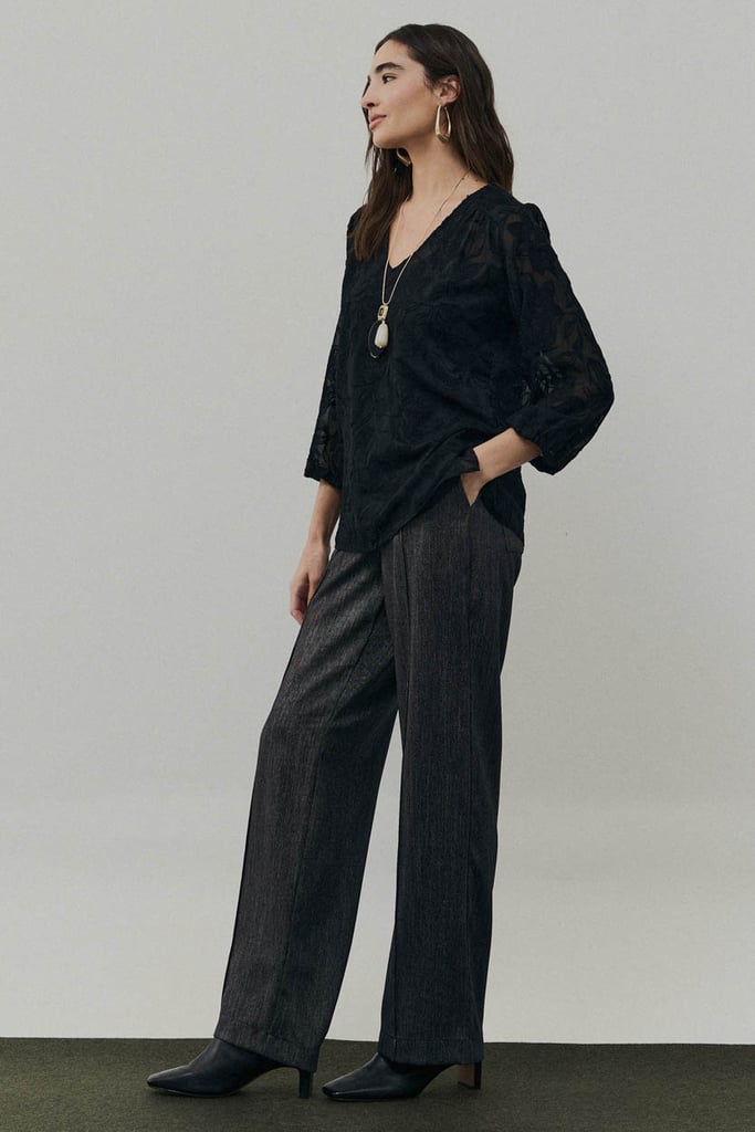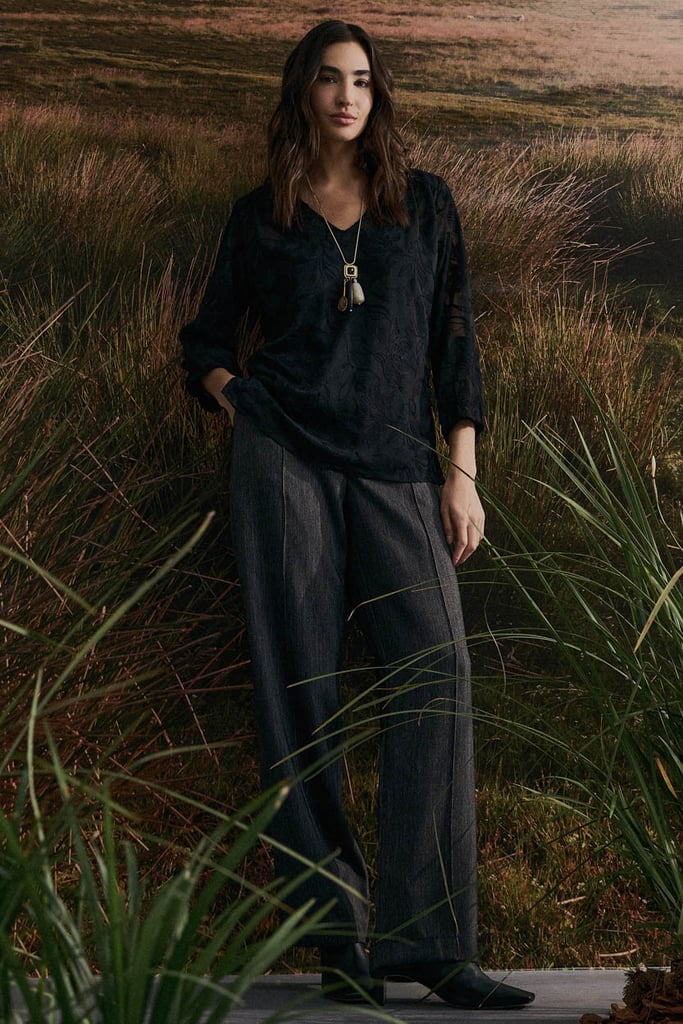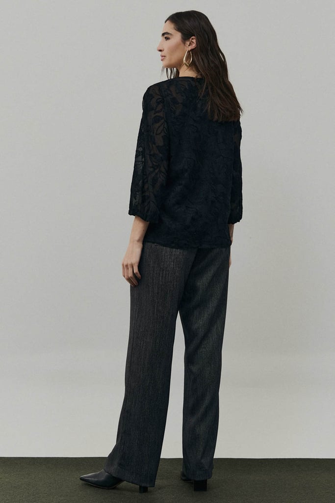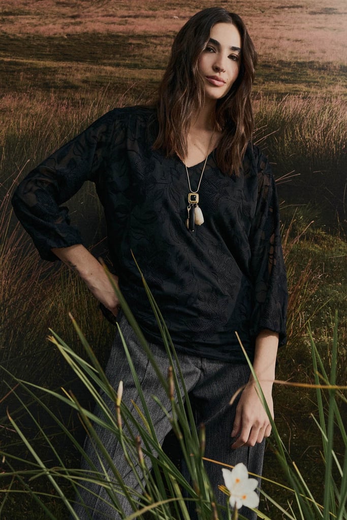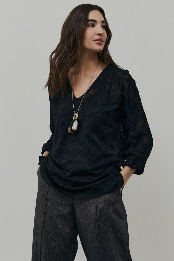 Blusa confeccionada em chiffon bordado, com modelagem leve e elegante que valoriza o caimento com delicadeza. Possui decote em V e franzidos sutis nos ombros, que acrescentam charme e sofisticação à peça. As mangas 3/4 contam com acabamento em elástico, proporcionando conforto e praticidade no uso. Acompanha anágua de forro, garantindo melhor cobertura e segurança ao vestir.
