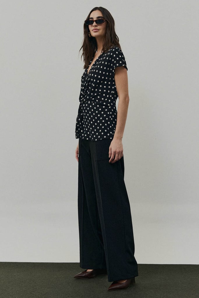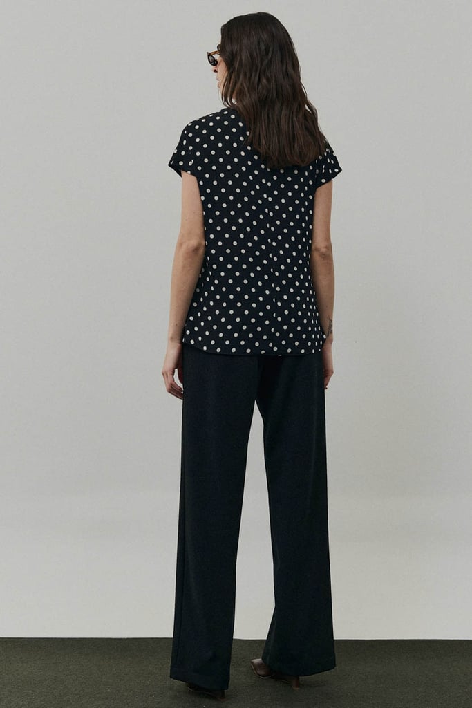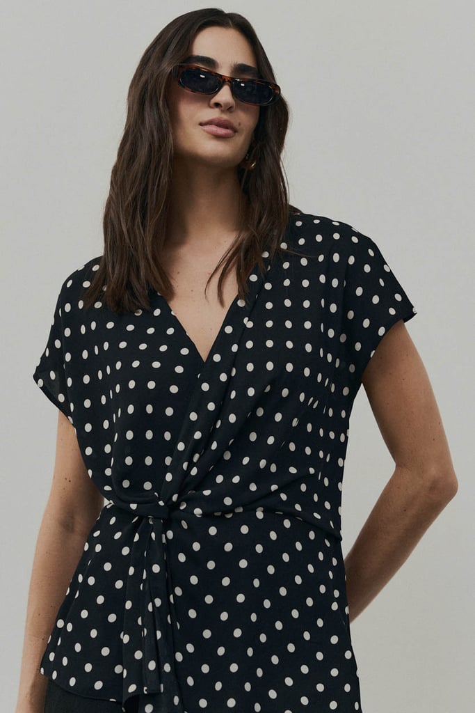 Blusa confeccionada em crepe estampado, com modelagem fluida que proporciona leveza e elegância ao visual. Possui decote transpassado e mangas curtas, garantindo conforto e um caimento feminino. O detalhe de nó lateral surge como um elemento de charme, trazendo um toque moderno à peça. A estampa de poá reforça a proposta atemporal, ideal para composições versáteis no dia a dia.