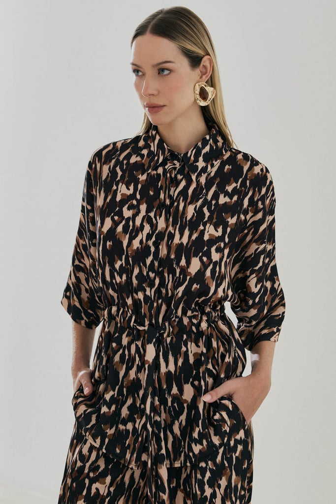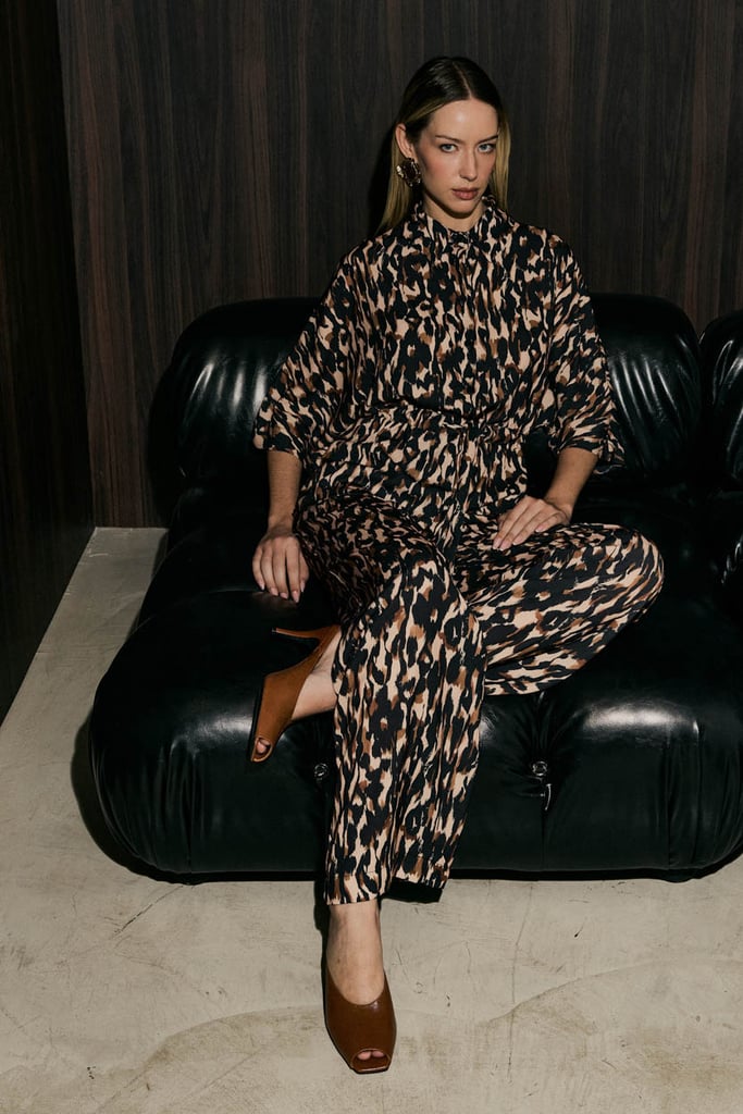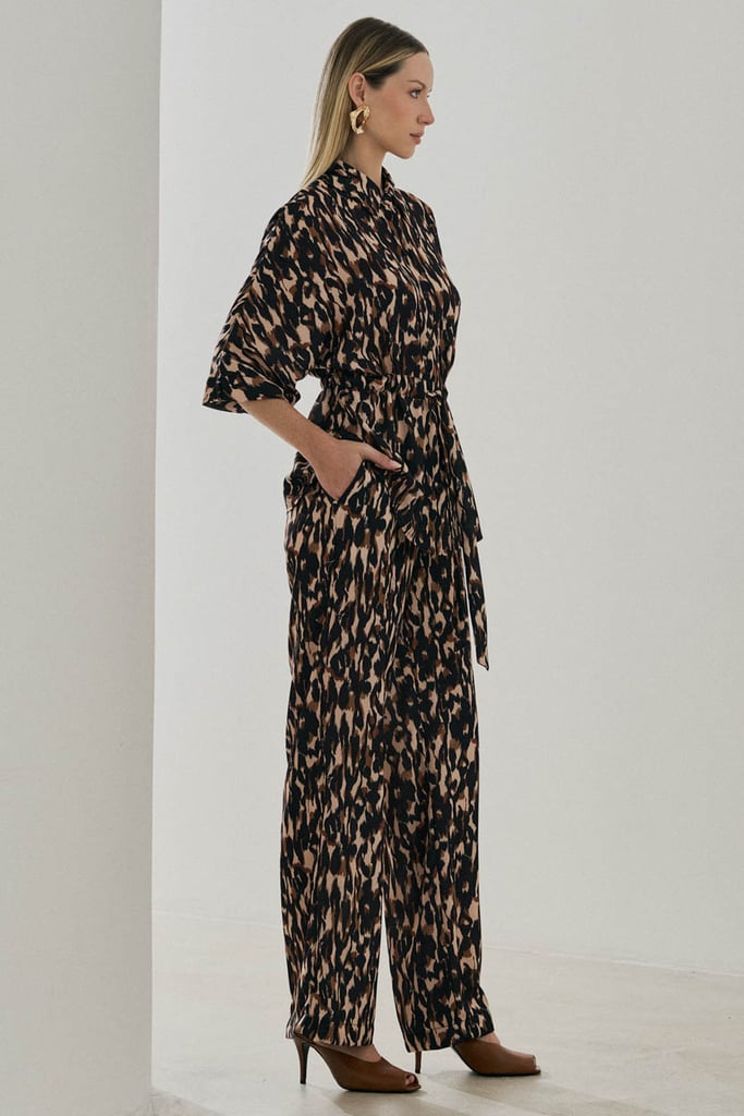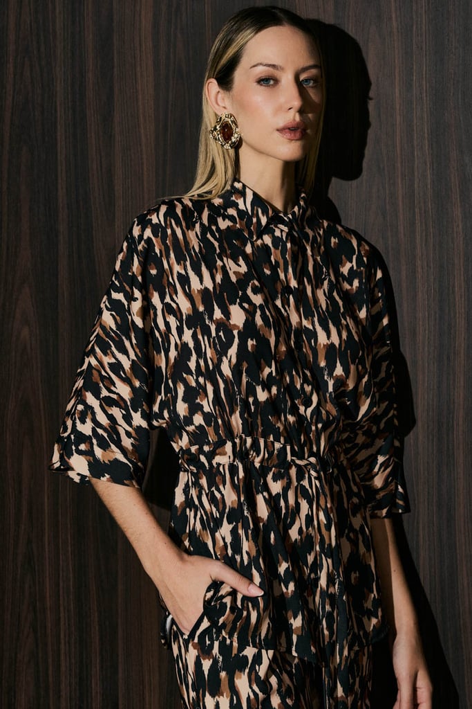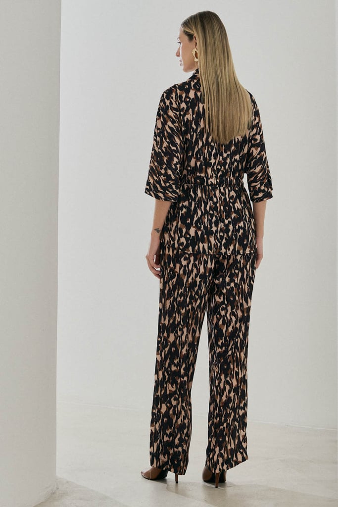 Conjunto confeccionado em crepe com estampa animal print. A blusa estilo parka possui gola, fechamento frontal por botões e amarração na cintura, permitindo ajuste com conforto e elegância. A calça apresenta modelagem reta, com pregas frontais, bolsos laterais e cós com elástico nas costas, proporcionando conforto e bom caimento.