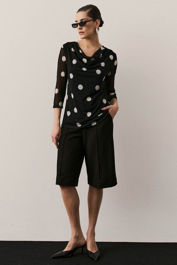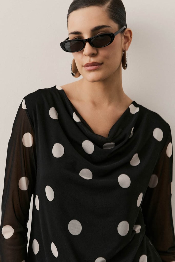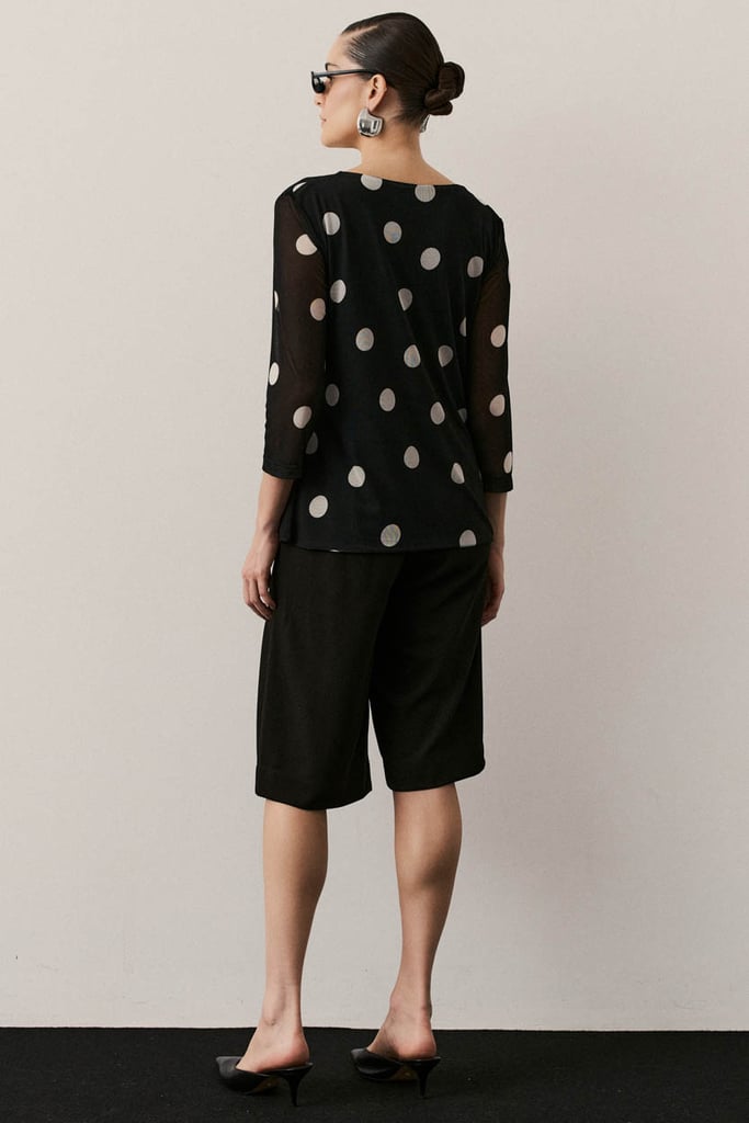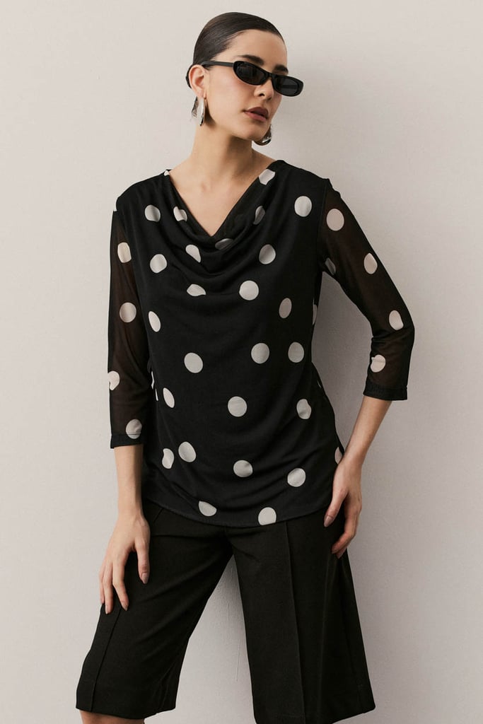 Blusa confeccionada em tule com padronagem de poá, que imprime um visual clássico com toque contemporâneo. Possui mangas 3/4 e decote degagê que forma um drapeado suave no busto. Peça forrada, garantindo conforto e segurança no uso.