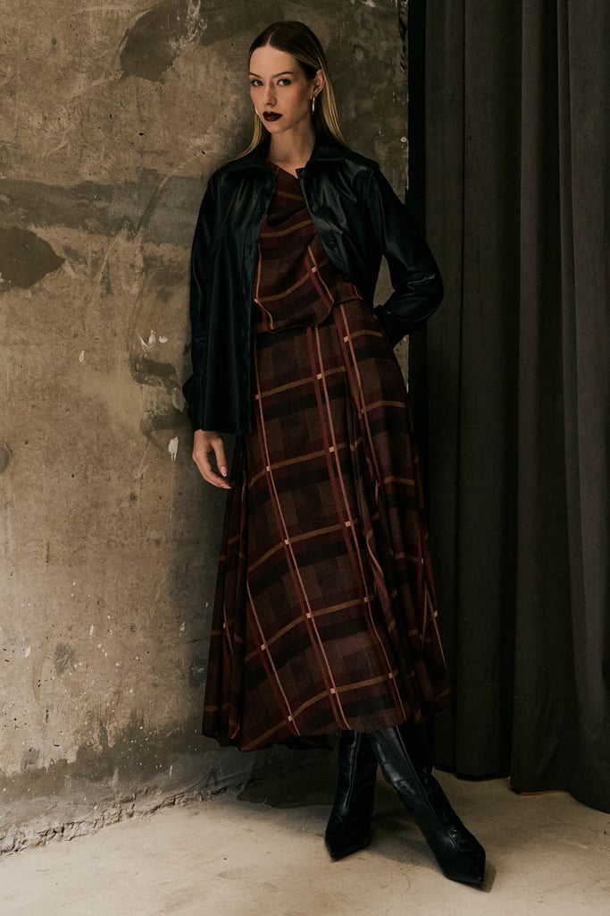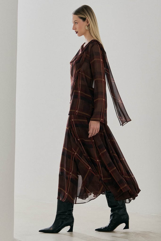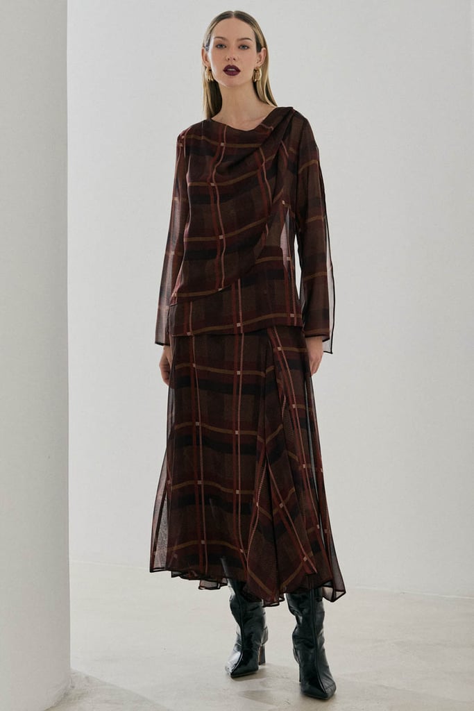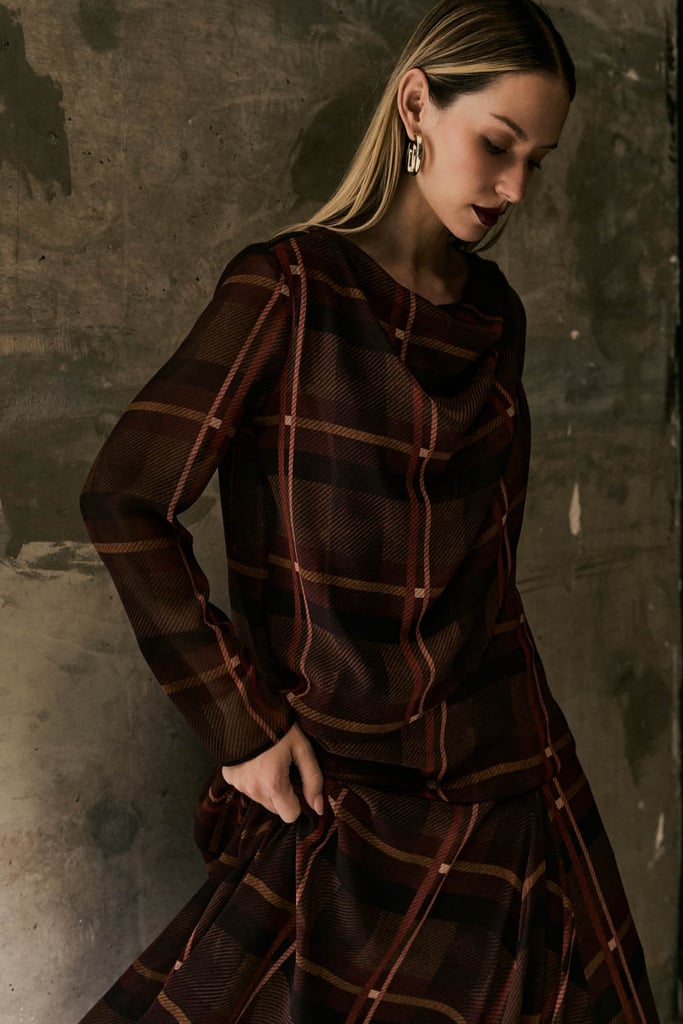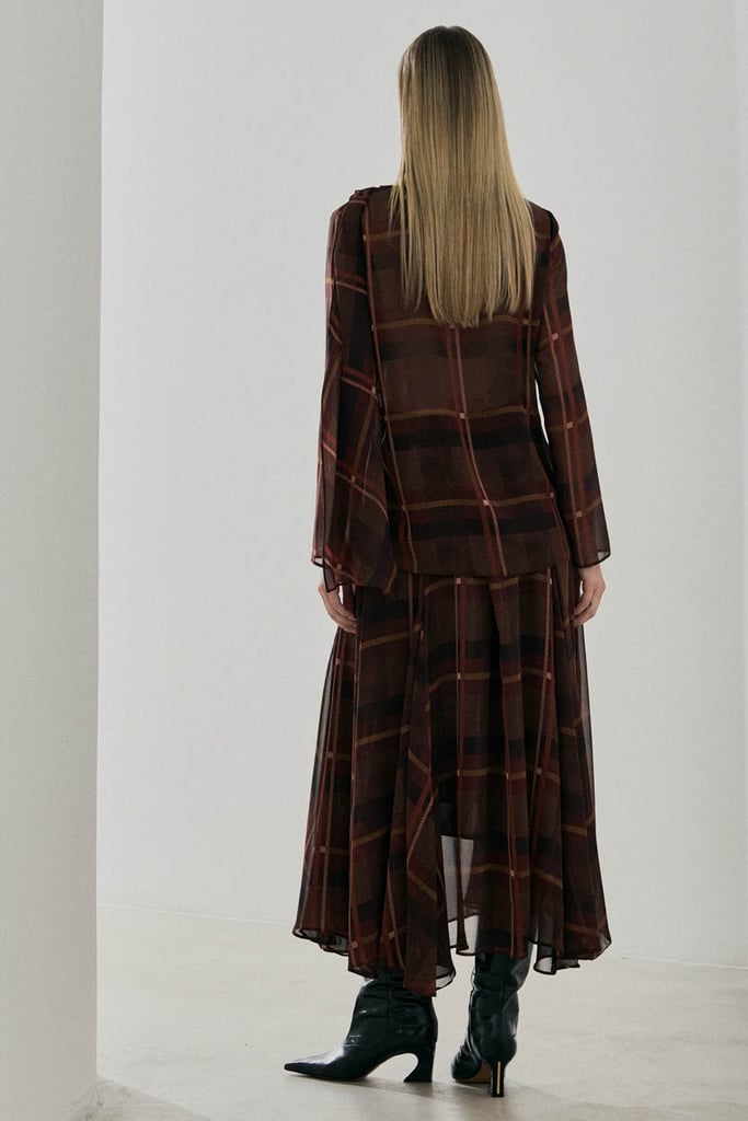 Blusa confeccionada em chiffon com padronagem xadrez e caimento leve. Possui frente dupla com ajuste por passante no ombro, criando um efeito de sobreposição que traz movimento e sofisticação ao visual. Conta com mangas longas, ideal para composições elegantes.