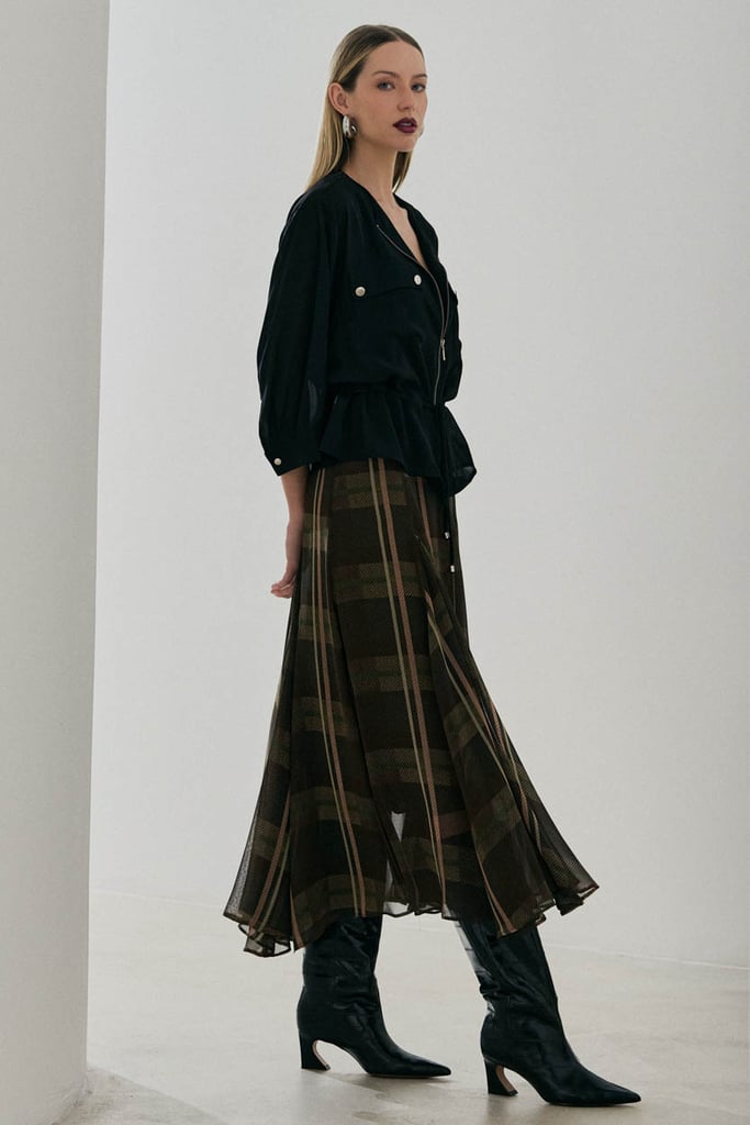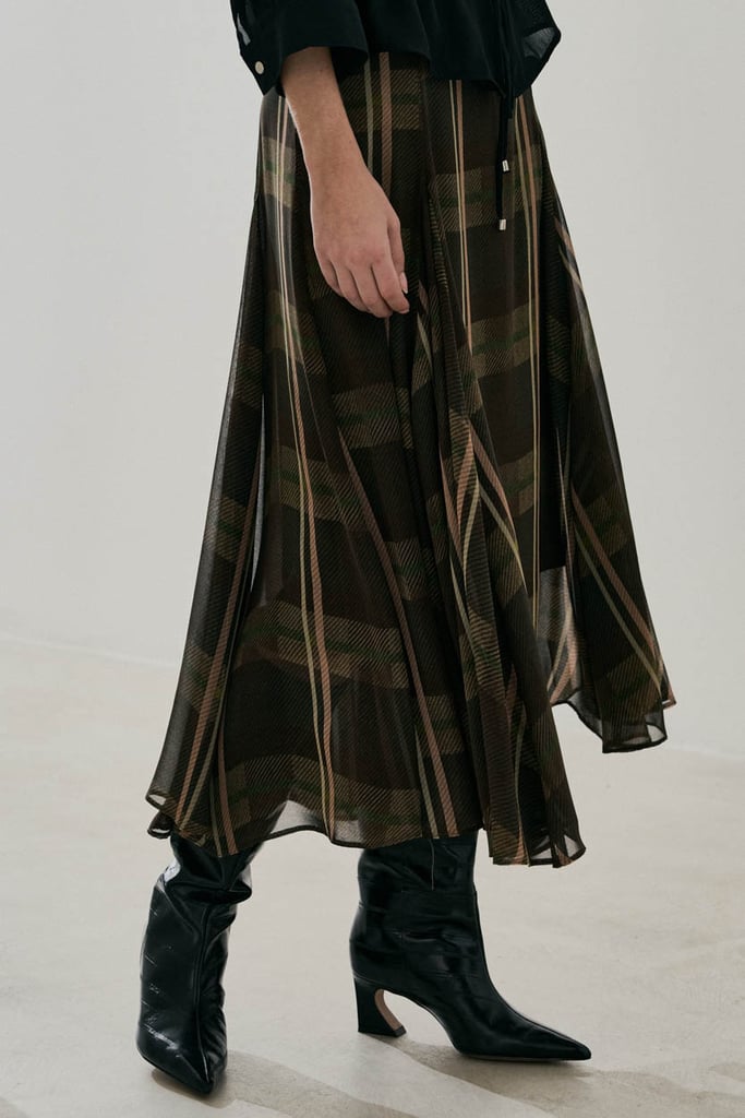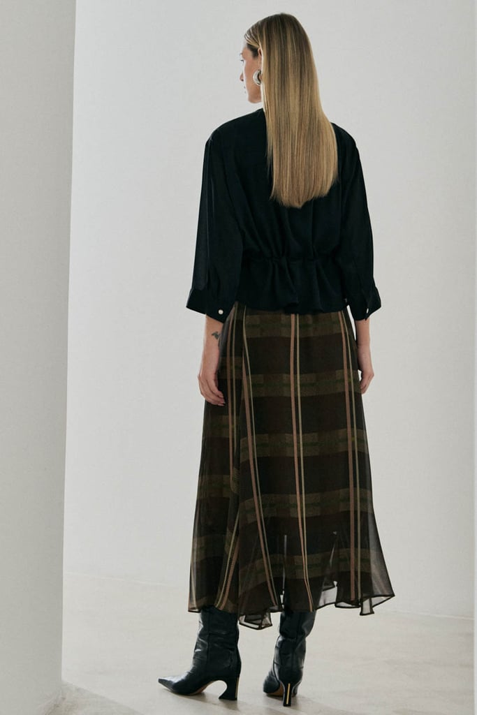 Saia confeccionada em chiffon com padronagem xadrez, com caimento leve e fluido. Possui modelagem godê e detalhe de nesgas, que trazem movimento à peça. O cós com elástico proporciona conforto e melhor ajuste ao corpo. Modelo totalmente forrado.