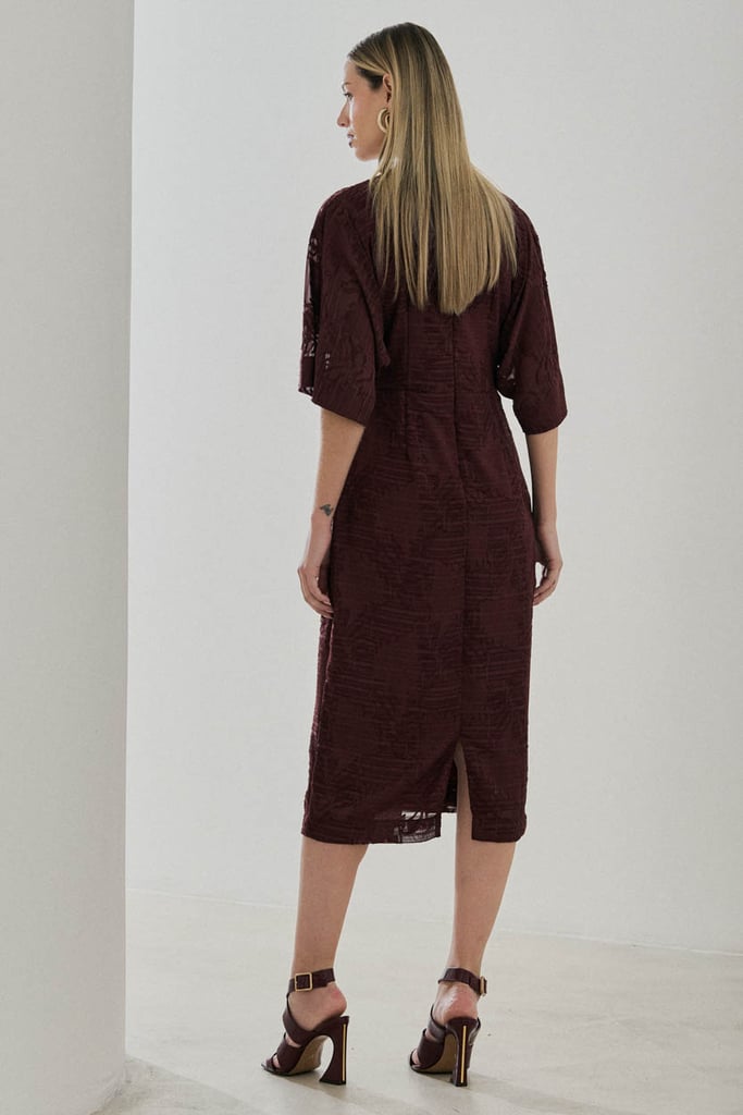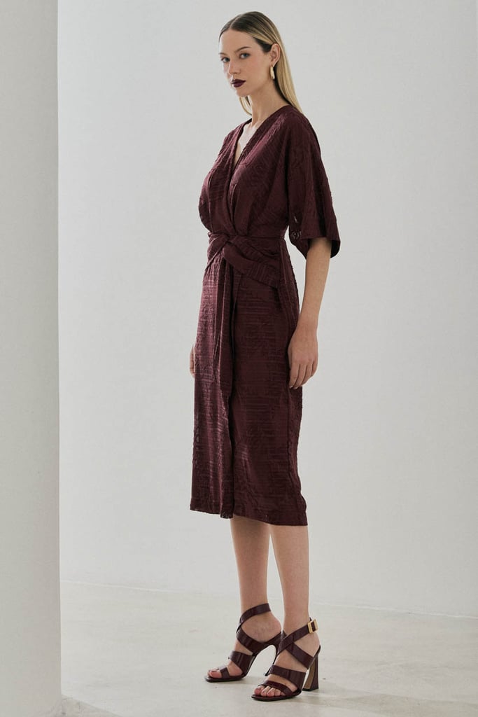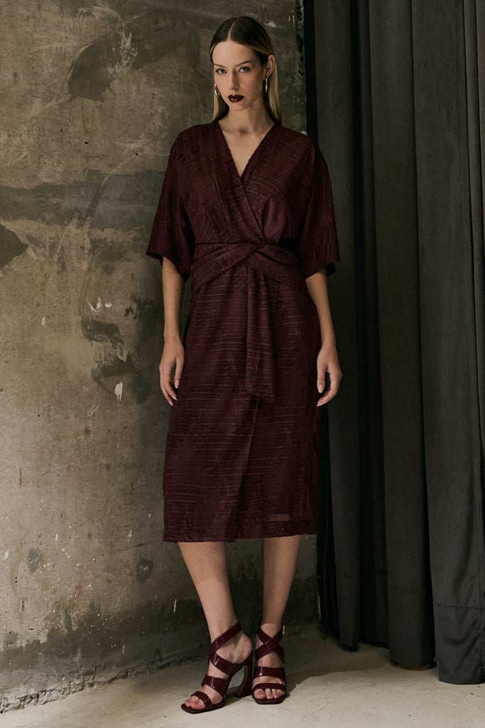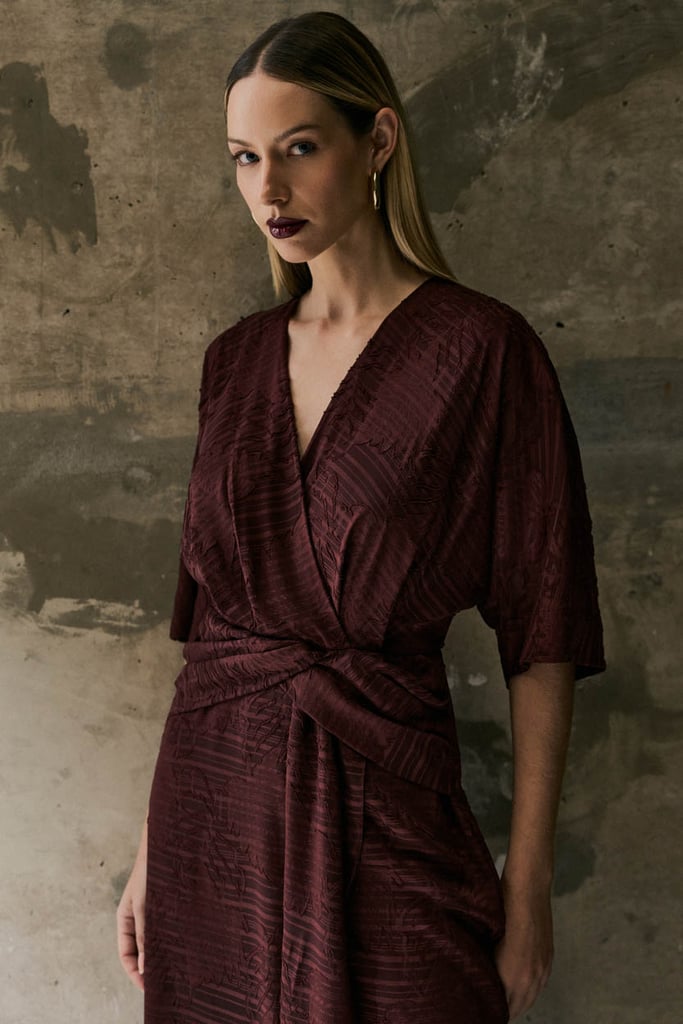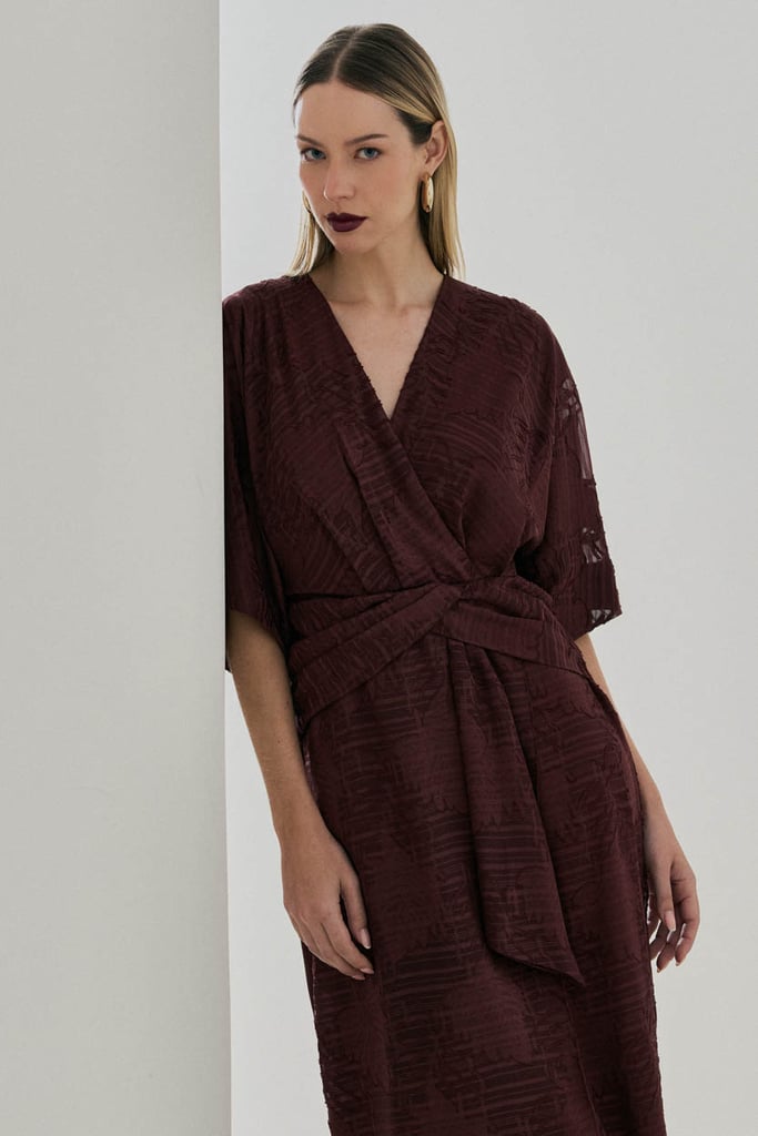 Vestido confeccionado em chiffon com trabalho de devorê, que confere textura sutil e sofisticação ao visual. O modelo apresenta decote e saia transpassados. As mangas são curtas e amplas, e o detalhe de torção na cintura traz um efeito elegante à peça, enquanto o fechamento por zíper invisível garante um acabamento discreto e refinado.