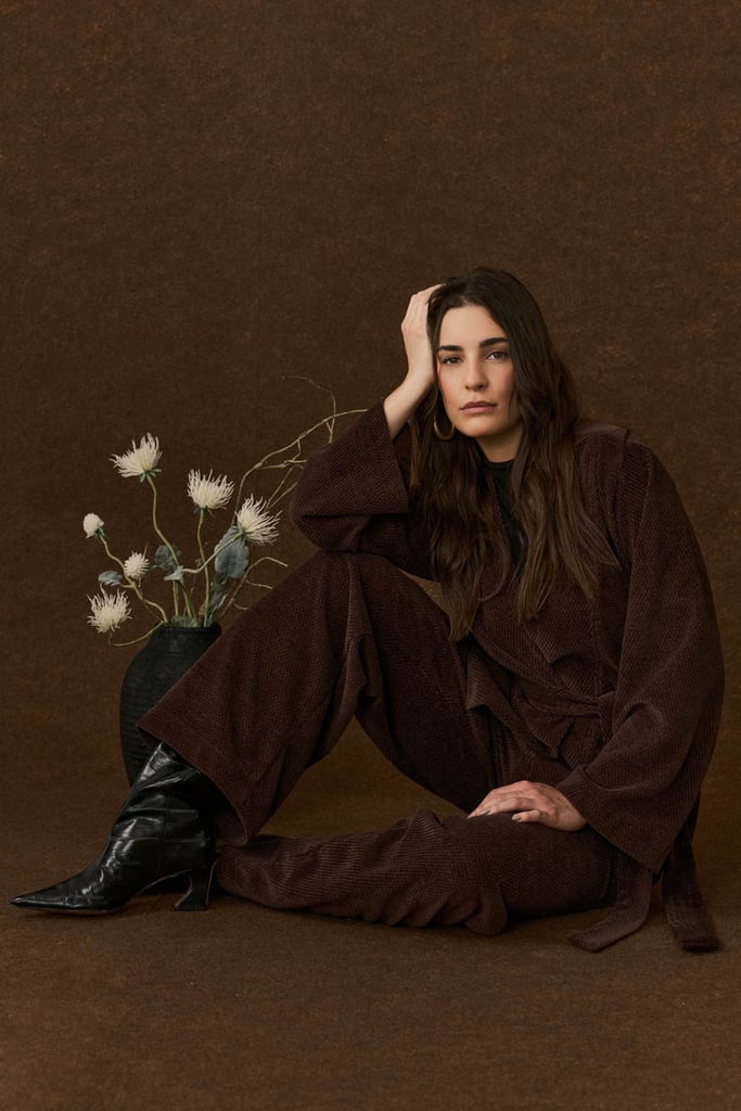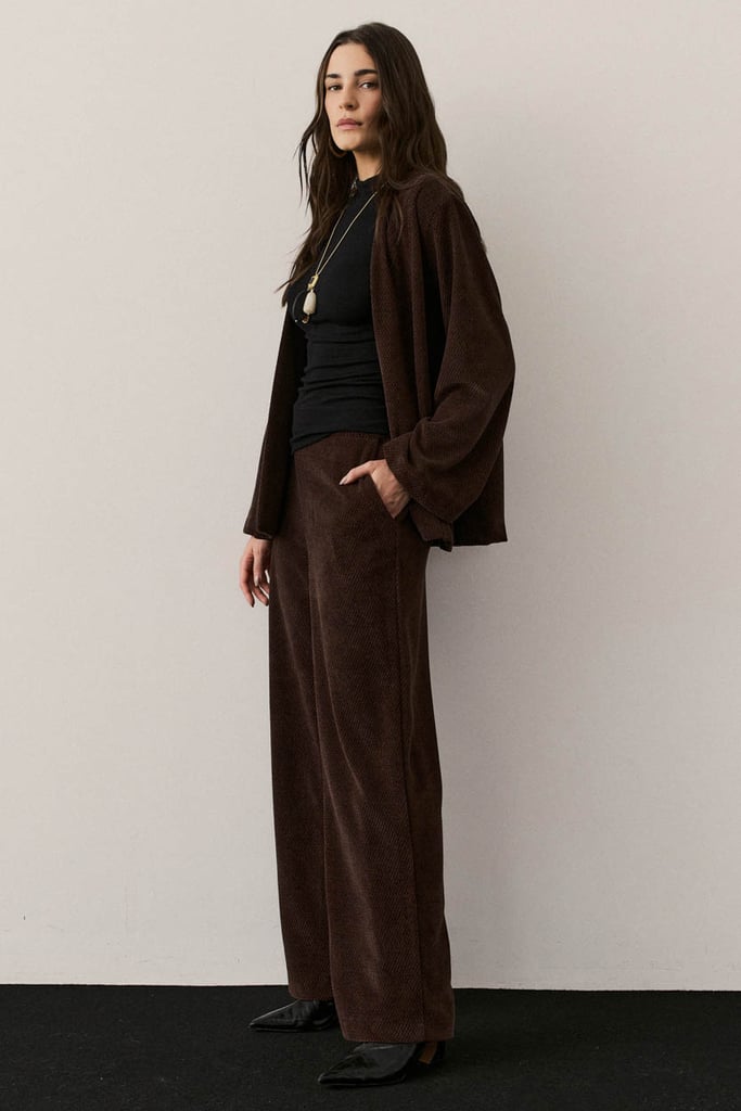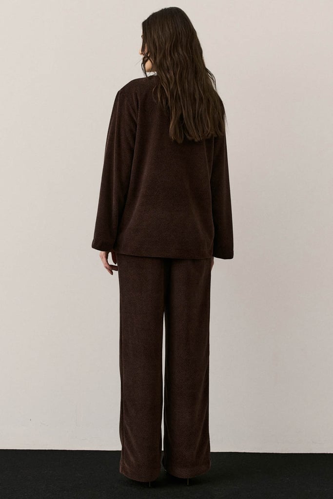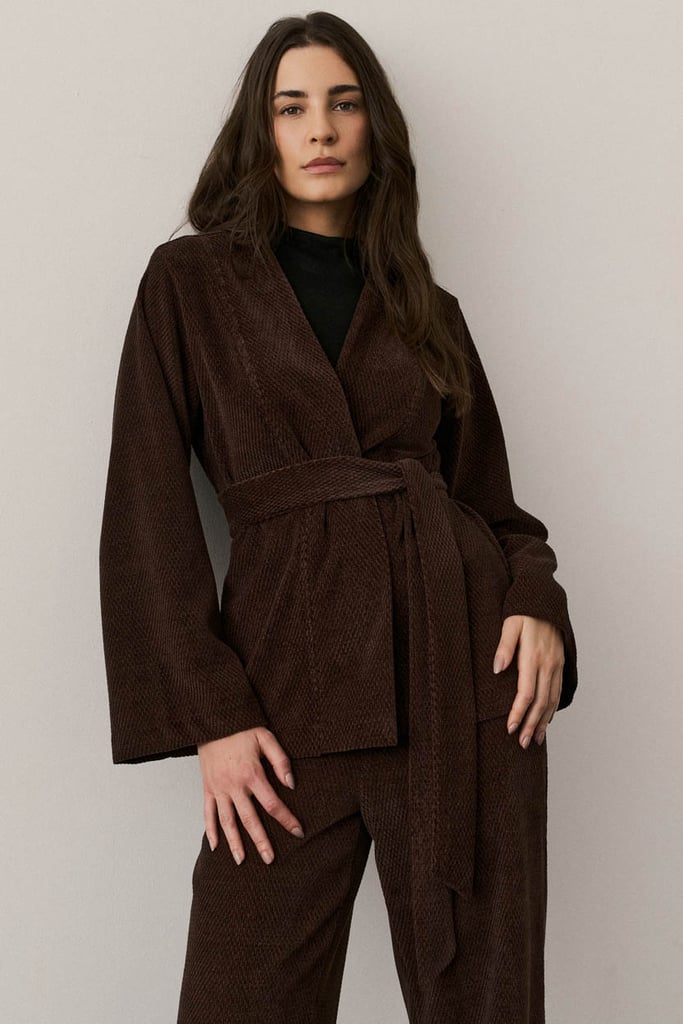 Conjunto confeccionado em jacquard de veludo, com textura marcante e proposta sofisticada. O kimono possui modelagem solta ao corpo, mangas longas e faixa para amarração na cintura, permitindo diferentes formas de uso. A calça apresenta modelagem reta, bolsos laterais e cós com elástico nas costas, proporcionando conforto e ajuste perfeito ao corpo.