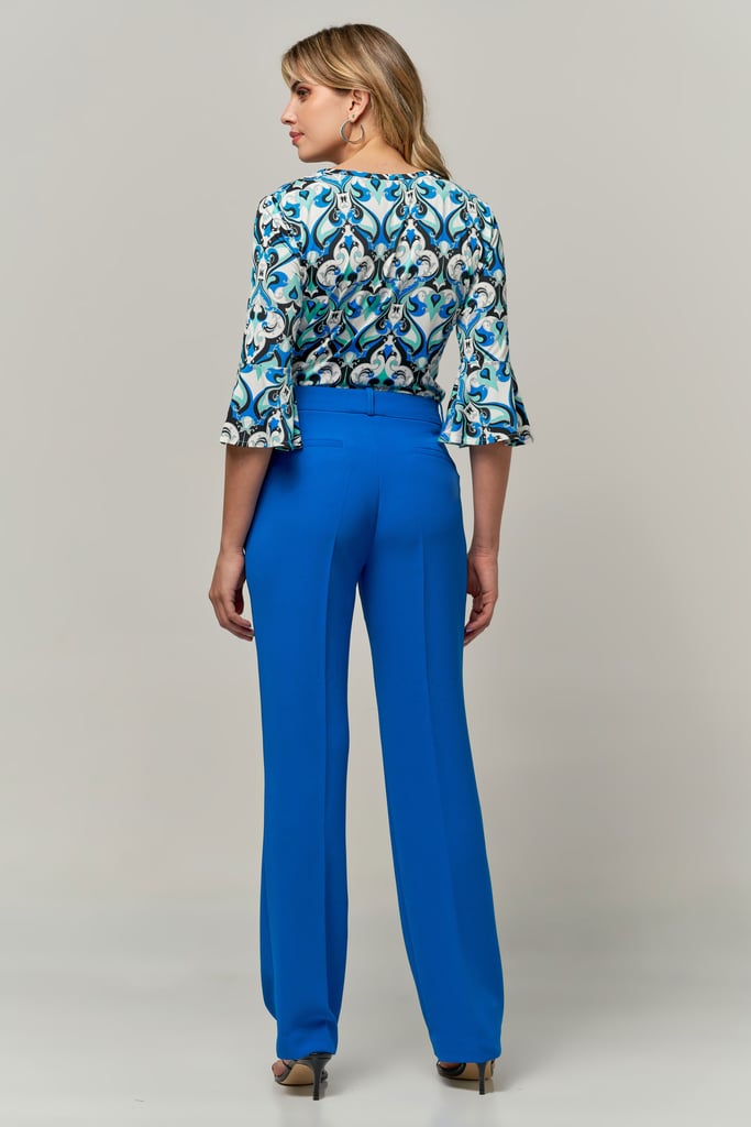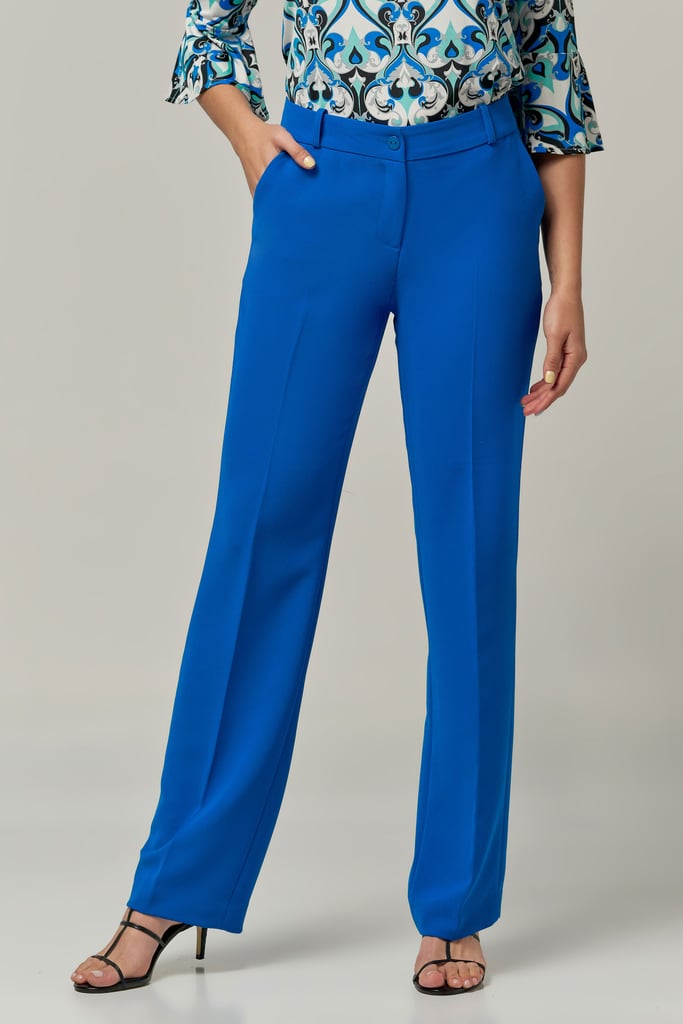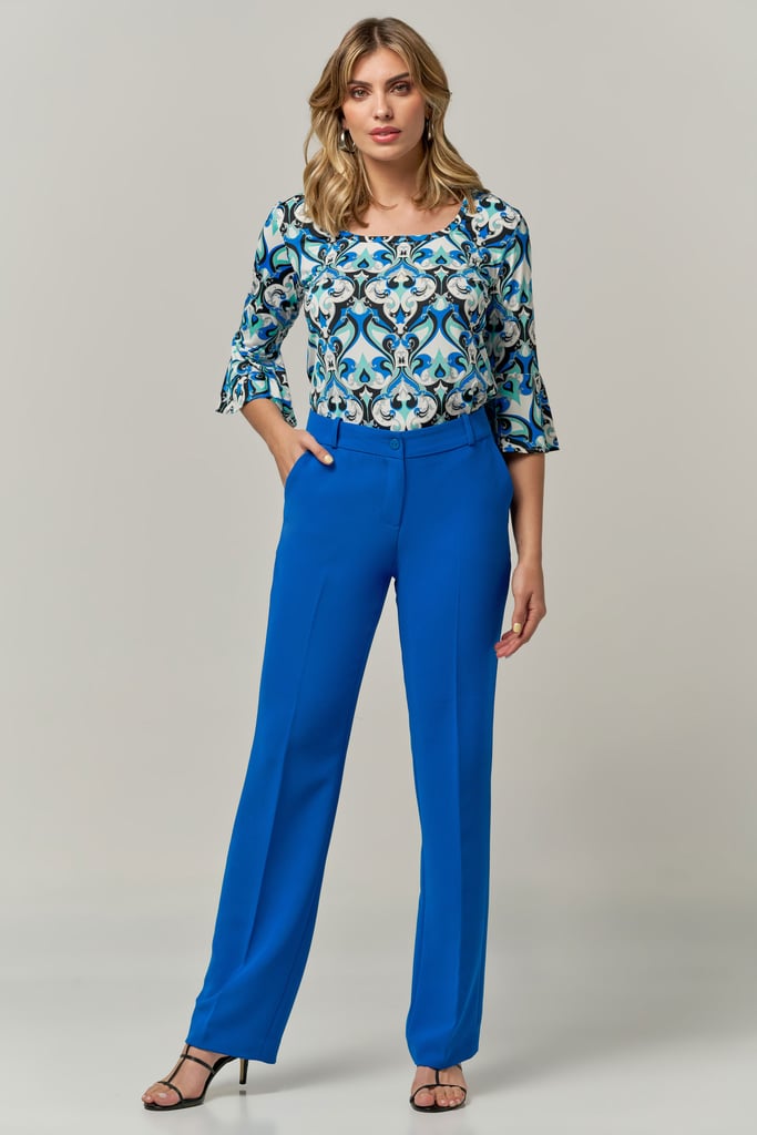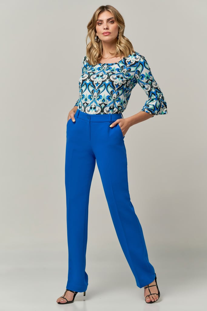 Calça reta de alfaiataria em tecido de poliéster, cintura alta, bolsos frontais e traseiros, fecho frontal por zíper e botão e passante no cós